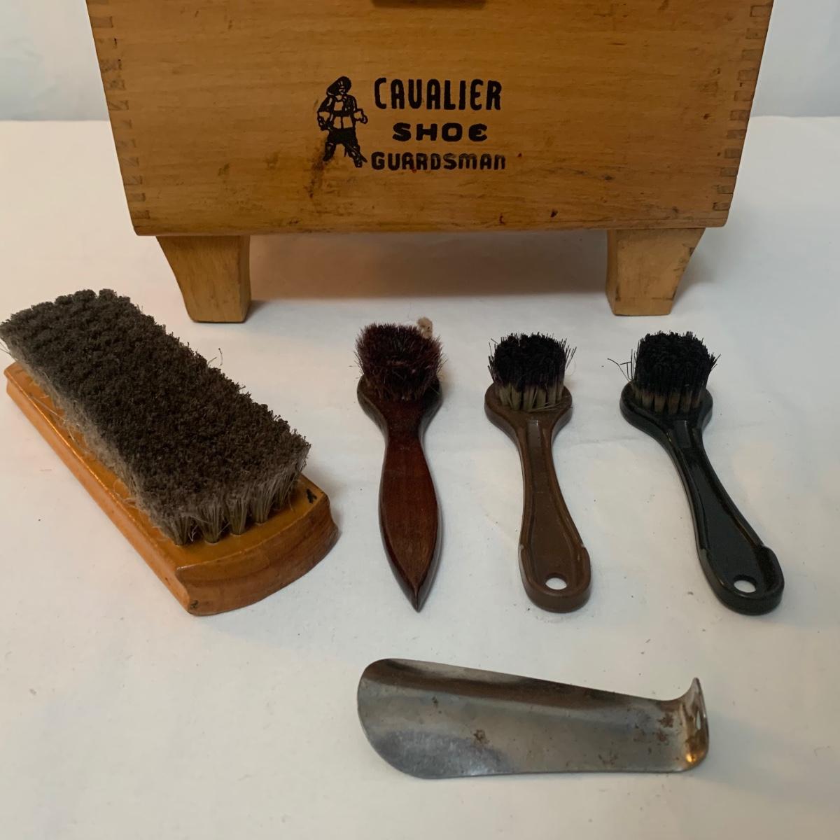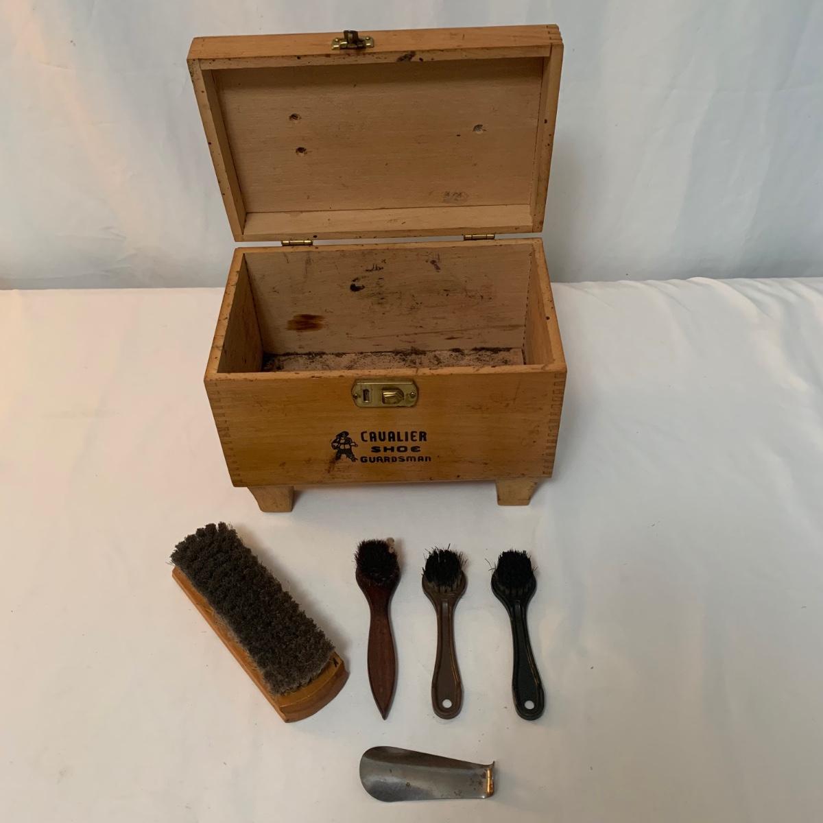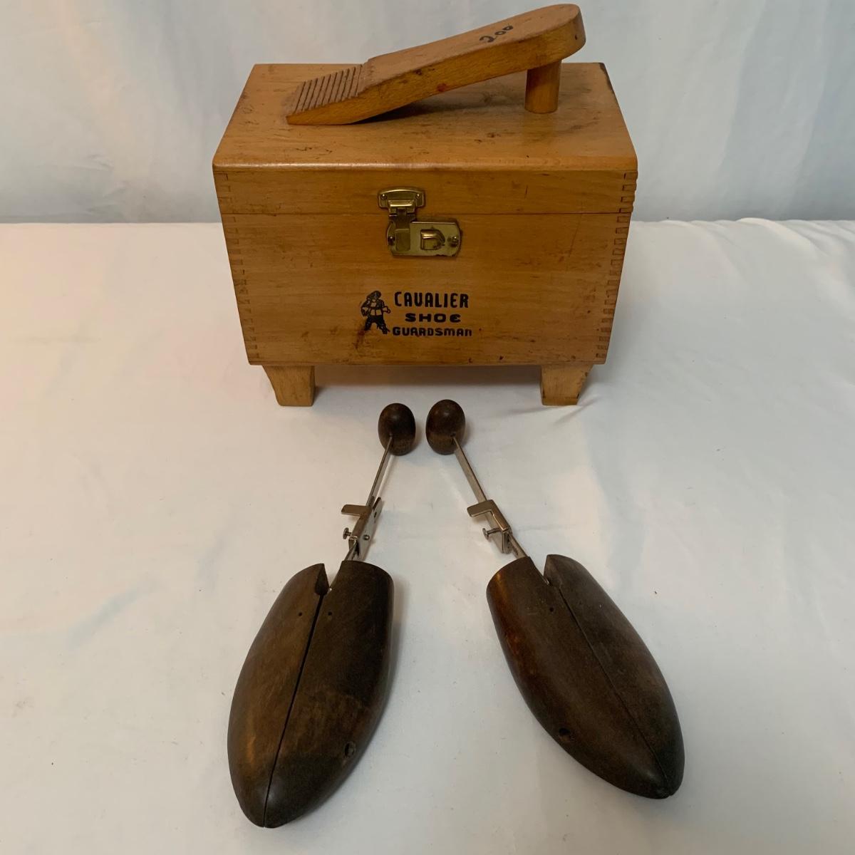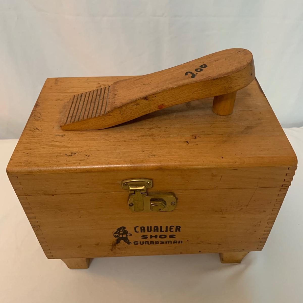 Men’s size 10.5 Cordwainer Arch Preservers with two shoe trees, and Cavalier Shoe Guardsmen Valet box. Cordwainer shoes have signs of wear on the interior with minor exterior blemishes. They have been stored with shoe trees and appear to be in good condition. Shoe Guardsmen Valet box is crafted with dovetail joinery. Box’s hardware is fully functioning and in good condition. The box interior has expected staining from shoe polish and brushes. Box contains three brushes and shoe horn. Wood shoe trees are in good condition and fully functional. Shipping available.