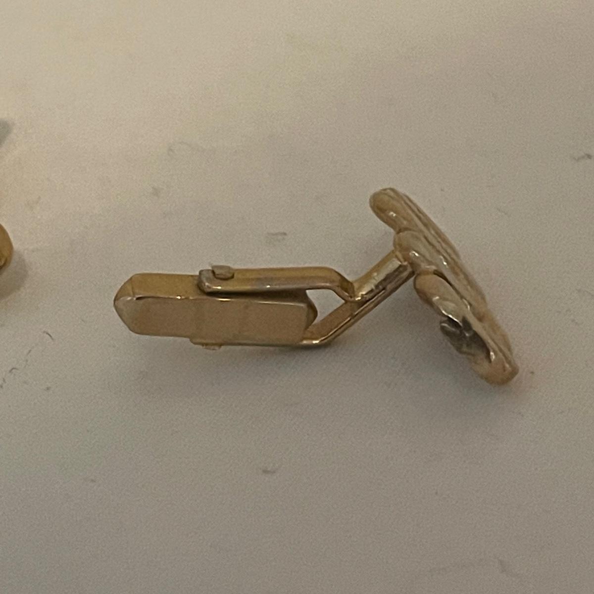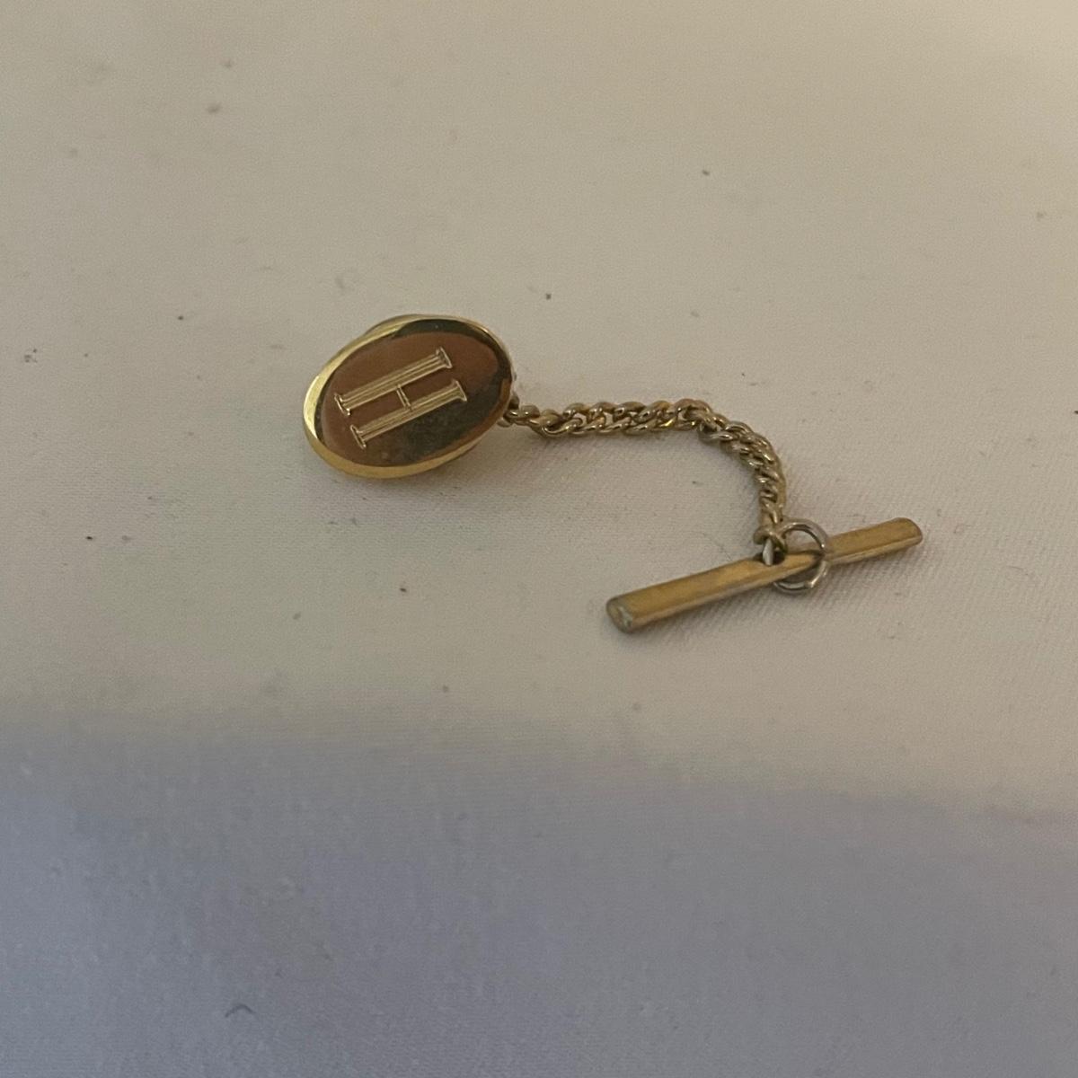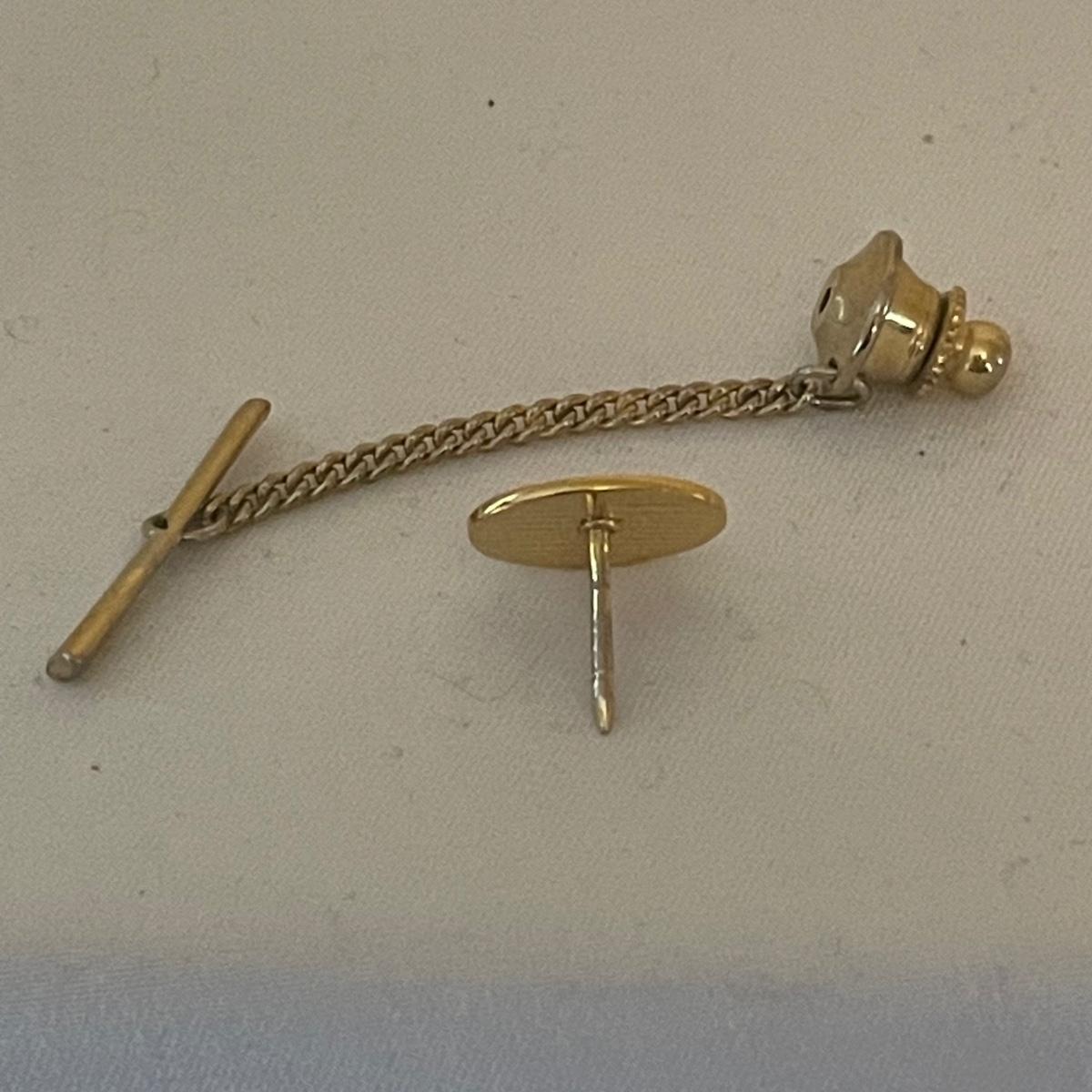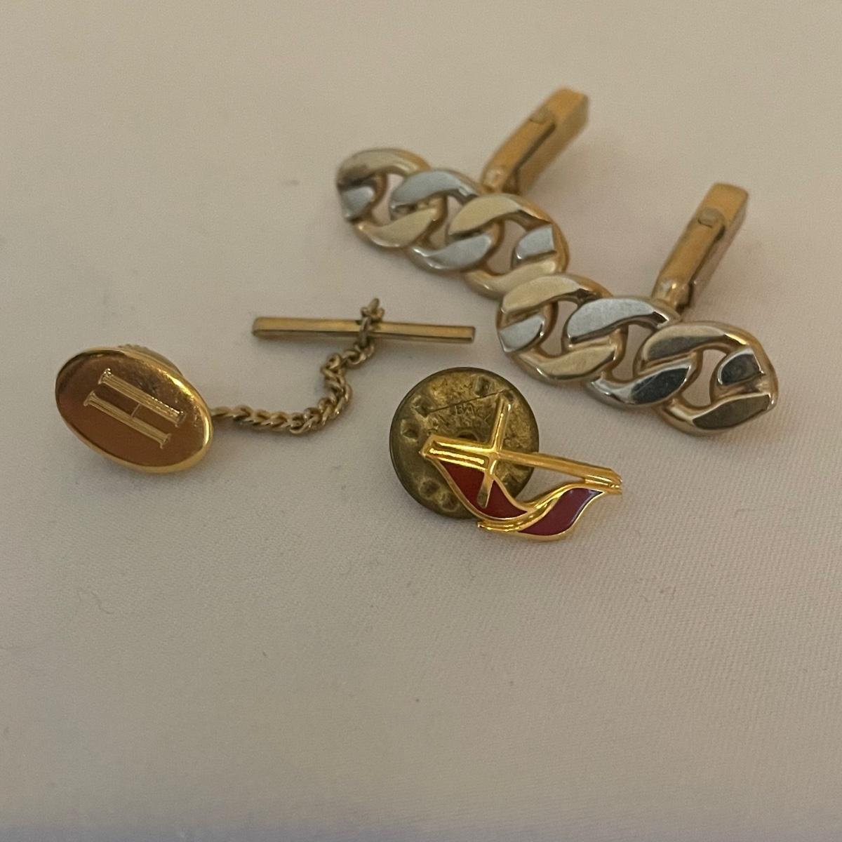 This assortment of mens accessories includes a pair of cufflinks, a tie pin and another pin. All are gold colored but have no markings.