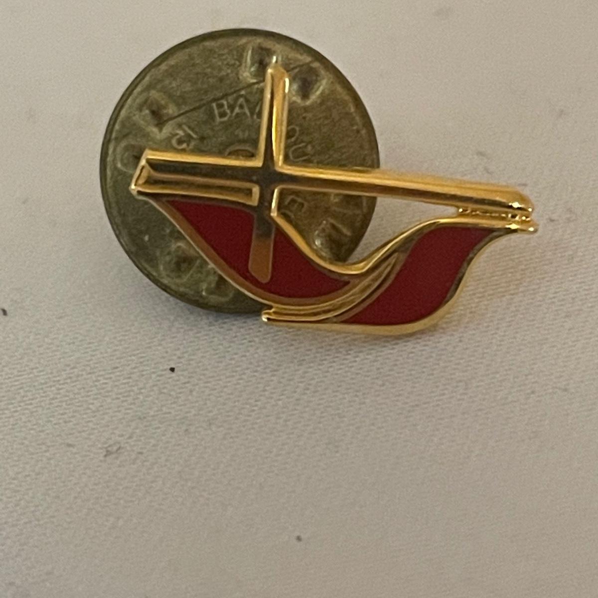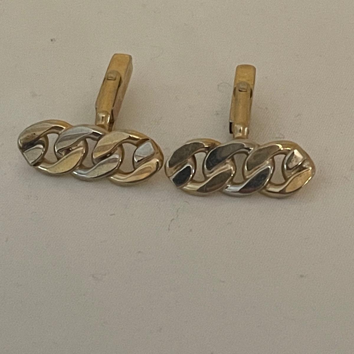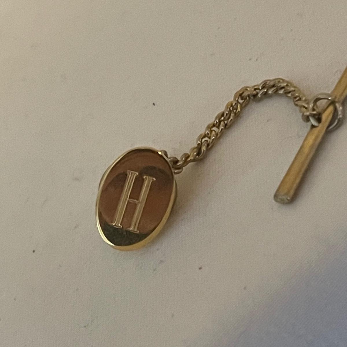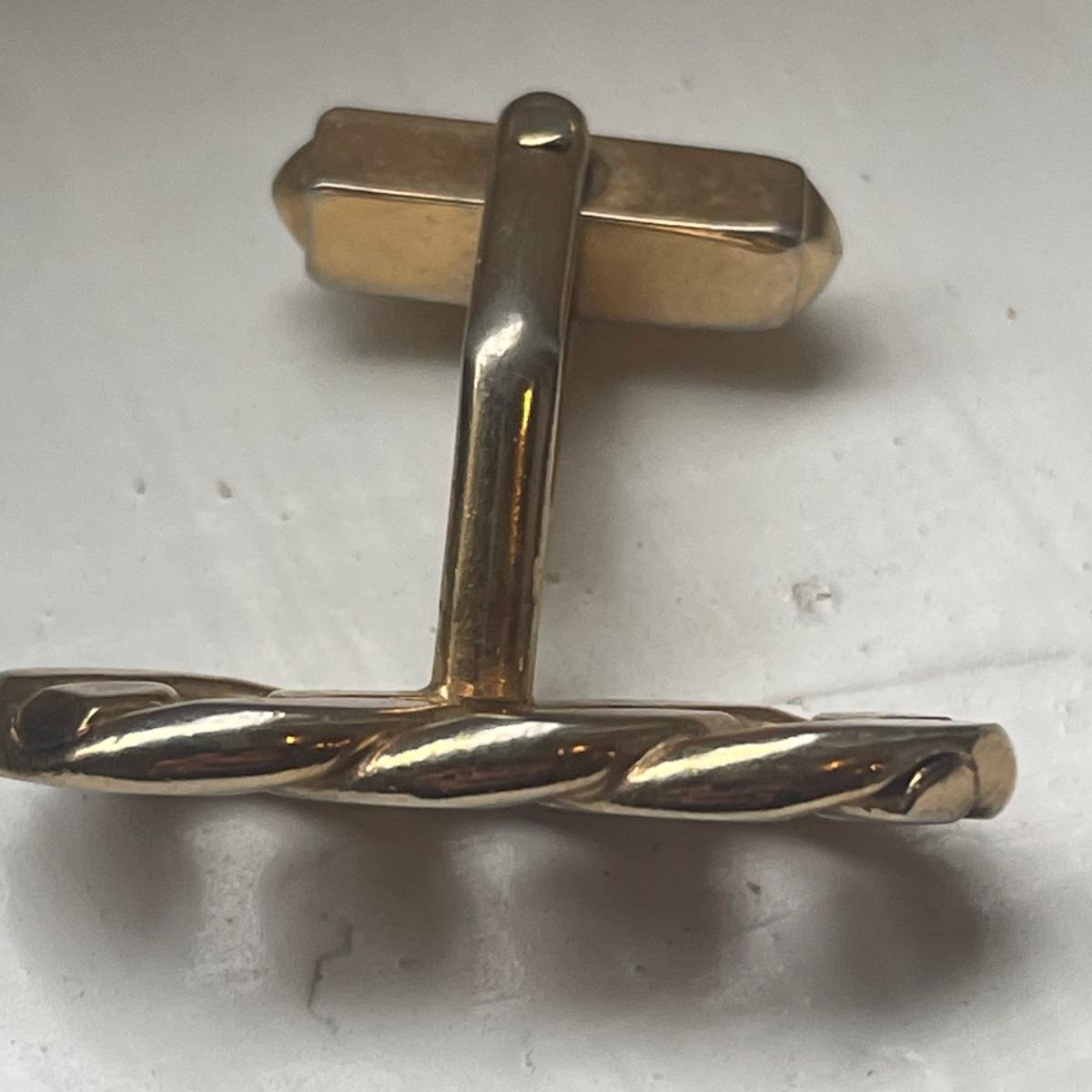 This assortment of mens accessories includes a pair of cufflinks, a tie pin and another pin. All are gold colored but have no markings.