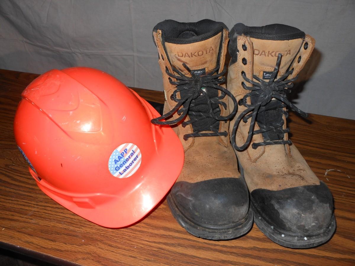 MEN'S DAKOTA BOOTS SIZE 9W AND A HARD HAT