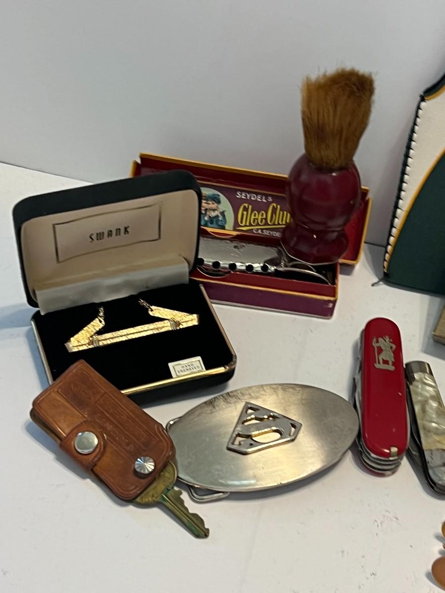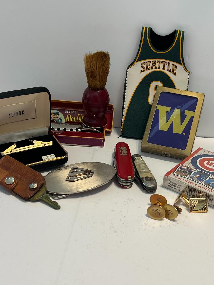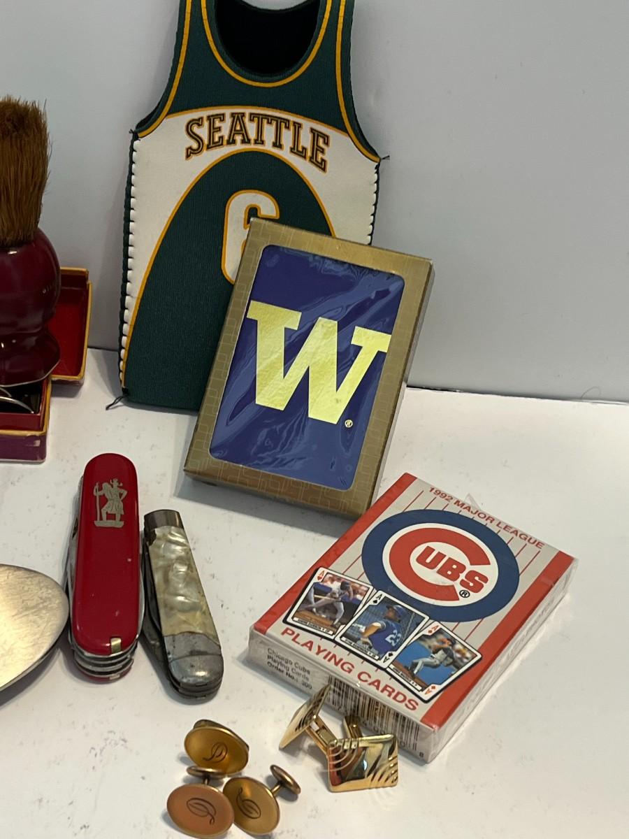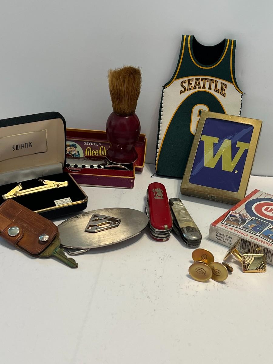 A variety of men's items including a Superman Belt buckle, swiss knives, cuff links, unopened CUBS playing cards, unopened UW playing cards, Seattle Sonics bottle cozy sleeve, Seydel's Glee Club harmonica, Swank tie clip, Mercury Lincoln leather key holder.