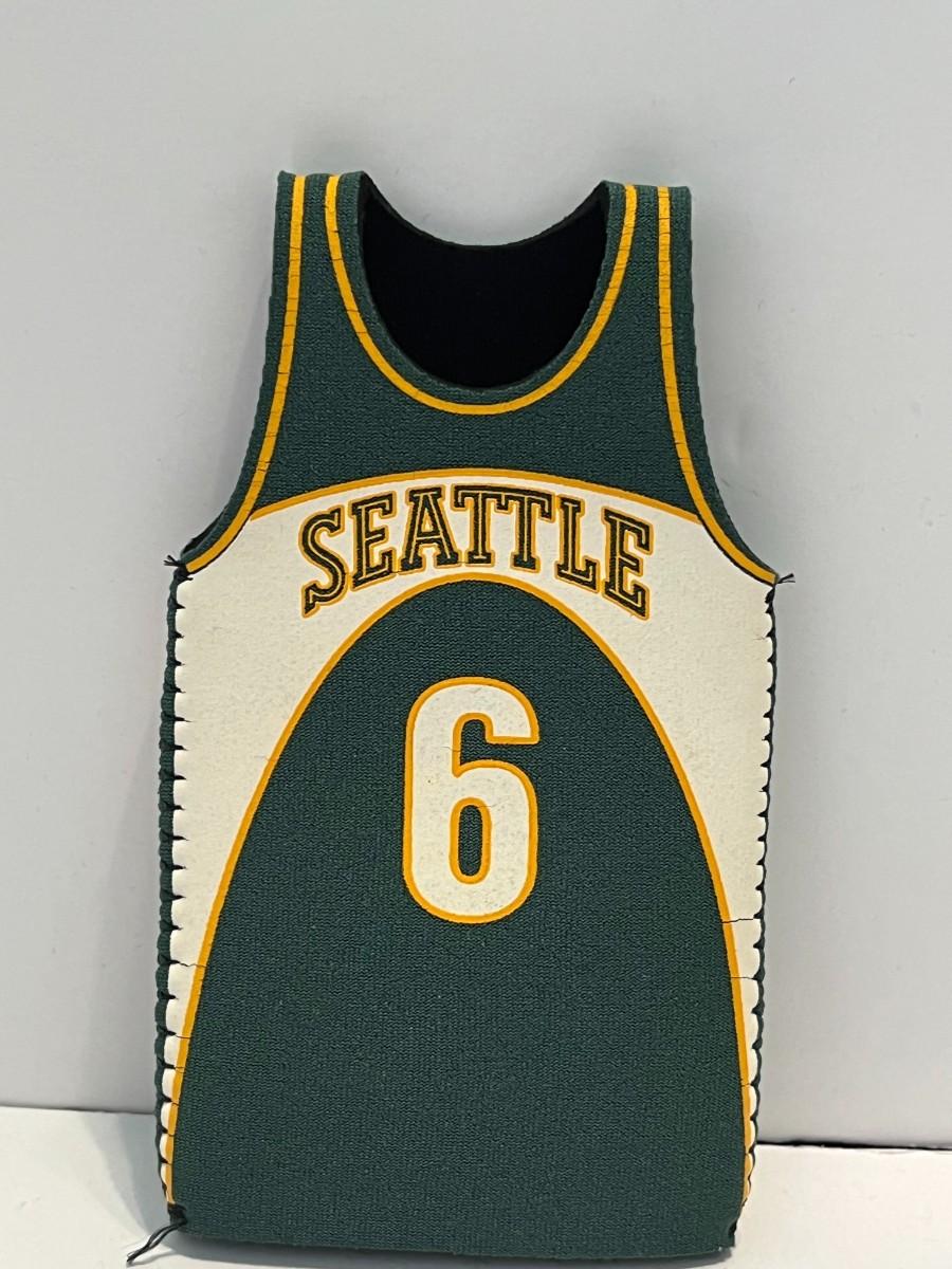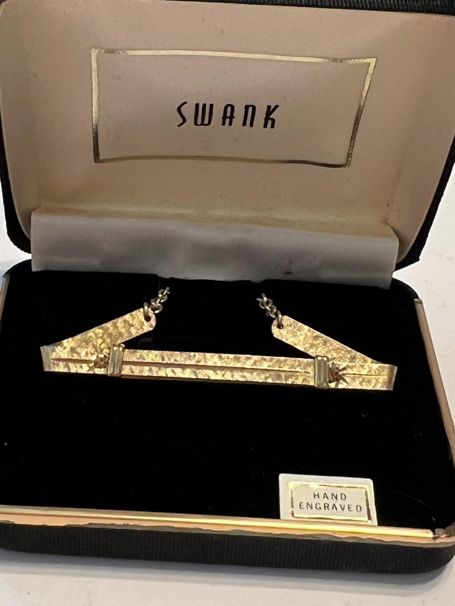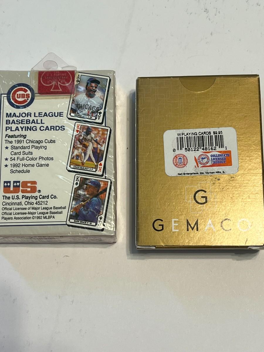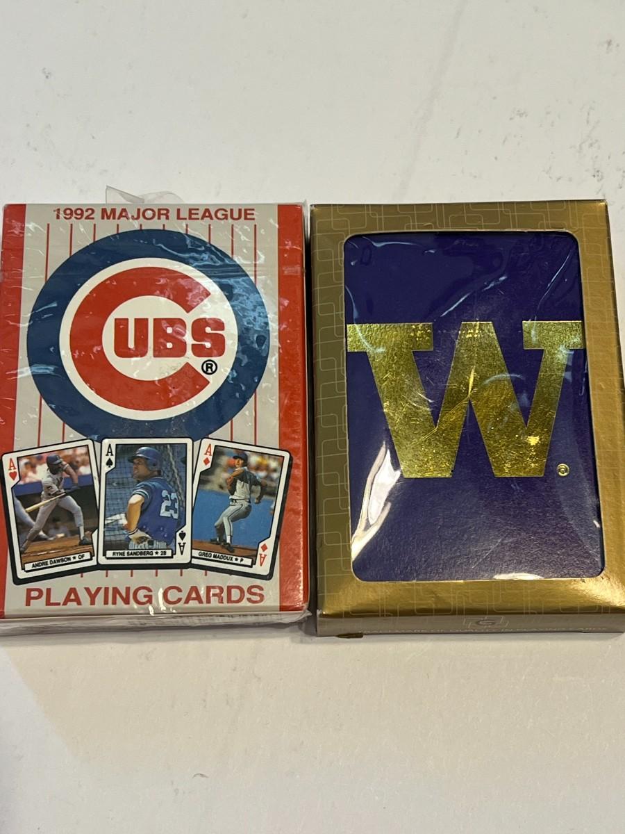 A variety of men's items including a Superman Belt buckle, swiss knives, cuff links, unopened CUBS playing cards, unopened UW playing cards, Seattle Sonics bottle cozy sleeve, Seydel's Glee Club harmonica, Swank tie clip, Mercury Lincoln leather key holder.