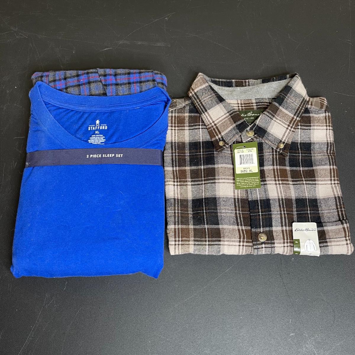 Button front and collar on EDDIE BAUER flannel shirt. STAFFORD Long sleeve t-shirt and flannel pj pants. See photo for sizes.