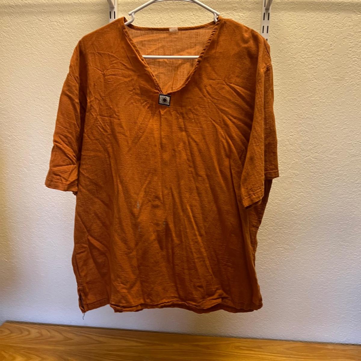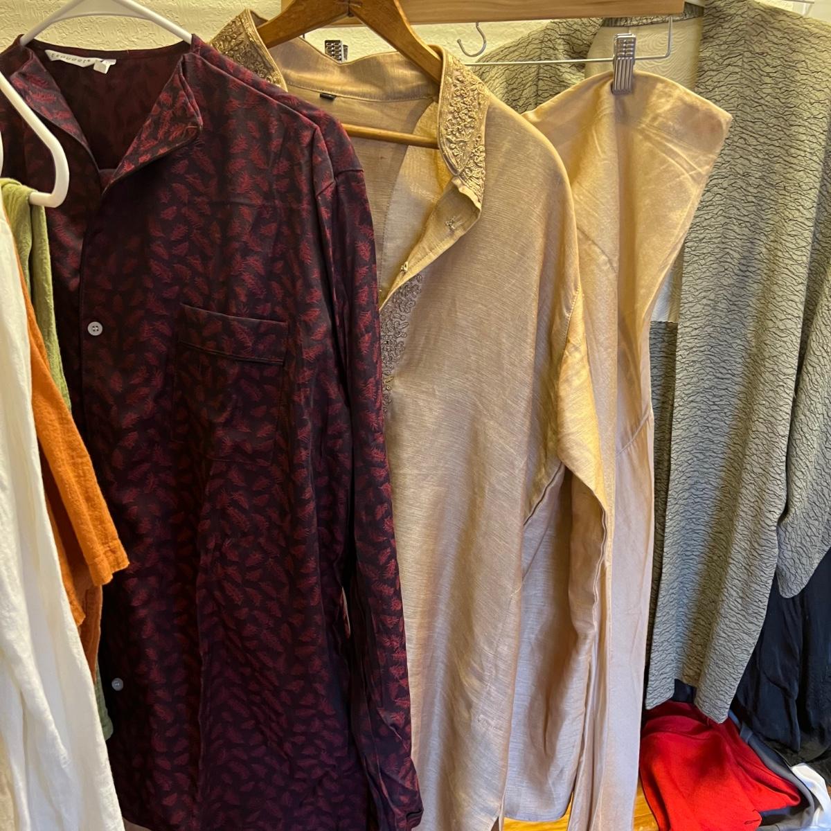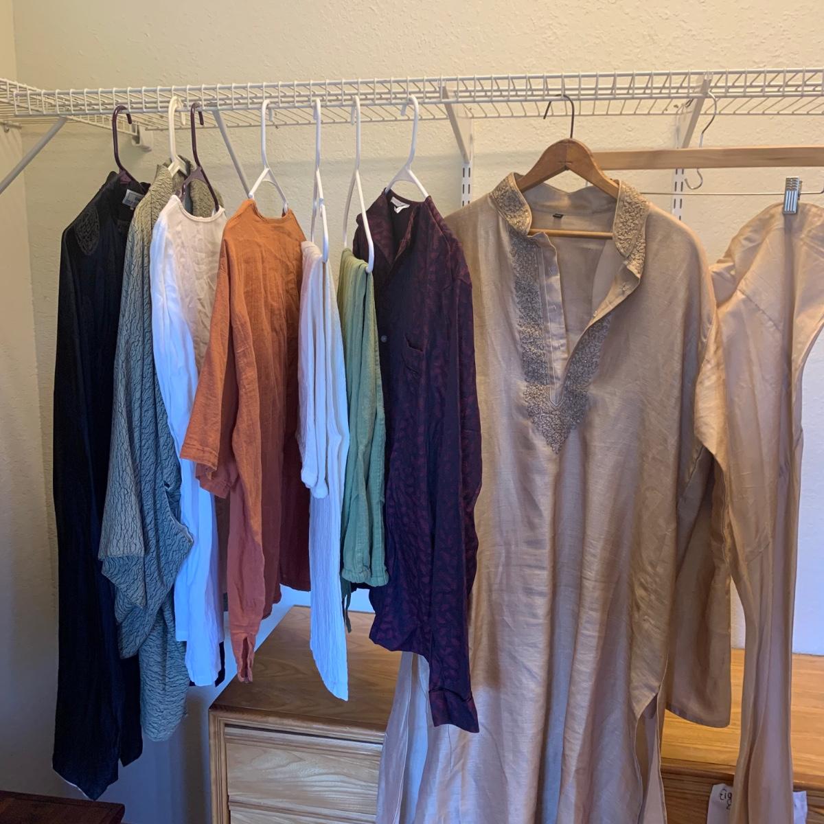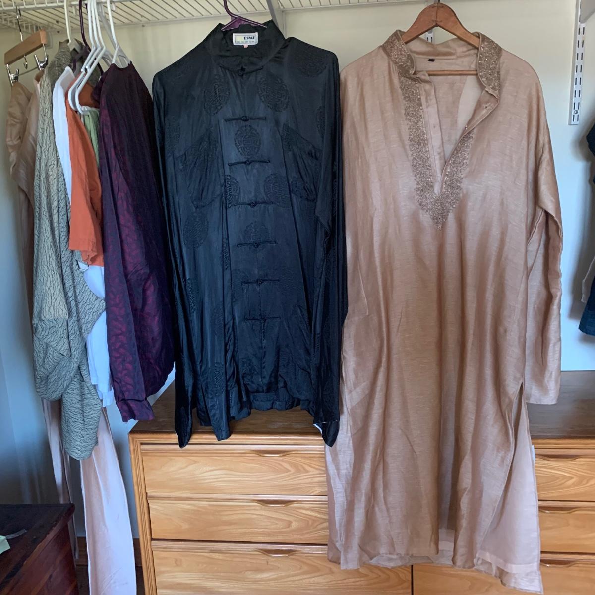 An assortment of very unique garments, linen and silk like material. Many of the items do not have labels or size. Where size was available it was photographed. Six shirts and three pants.
