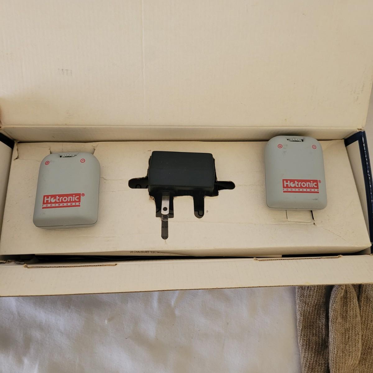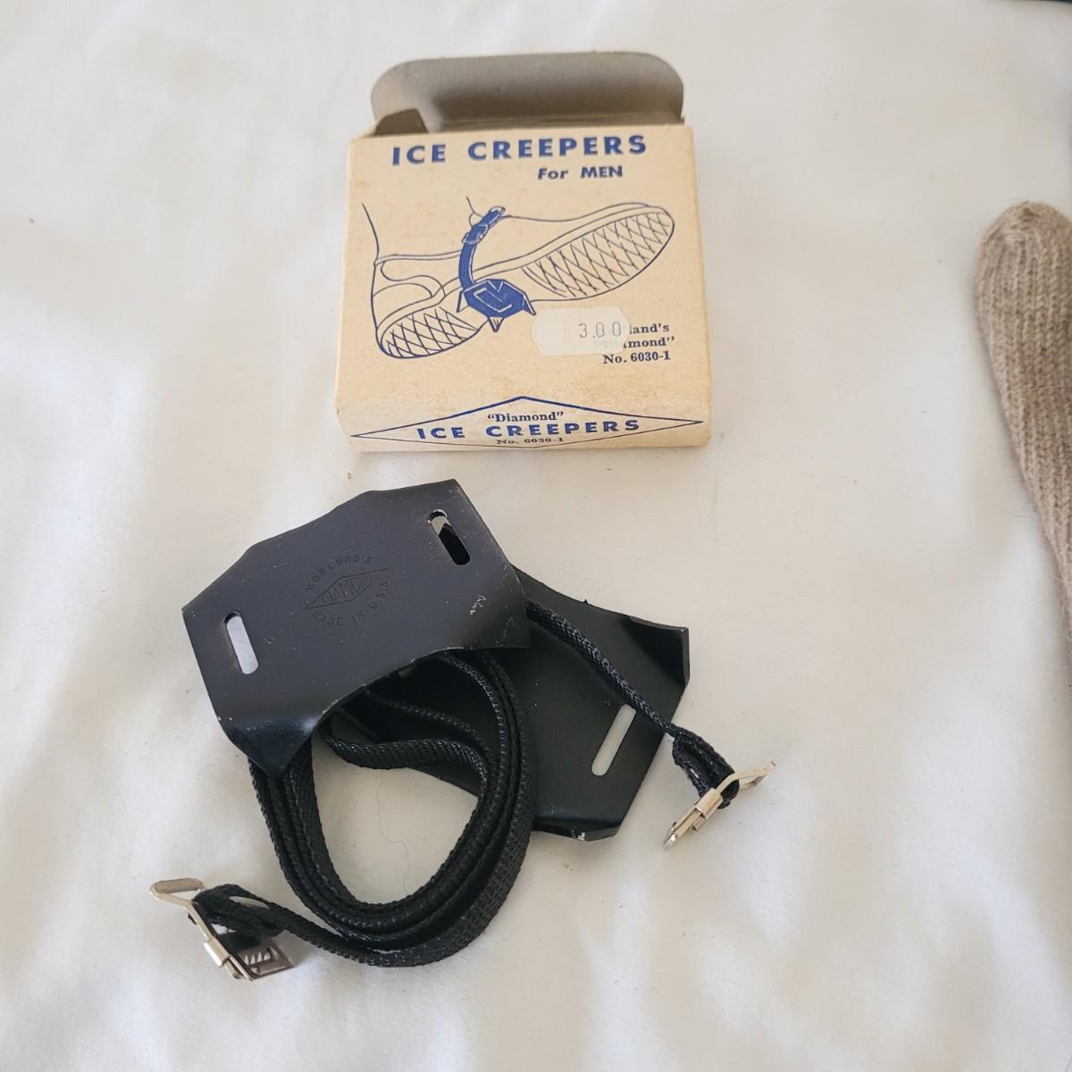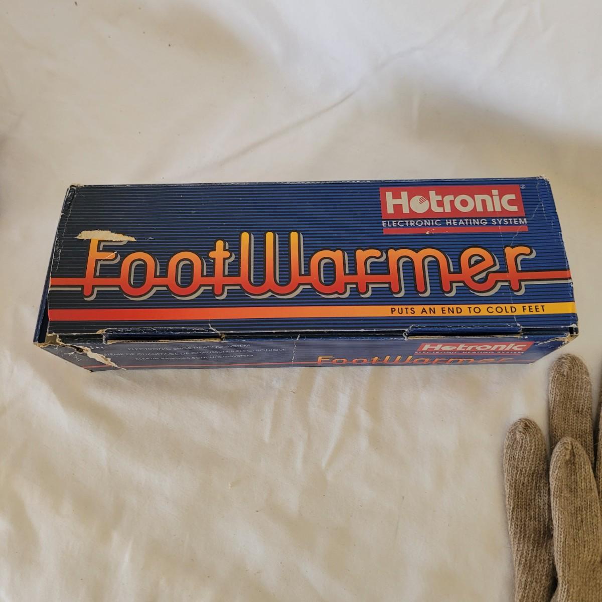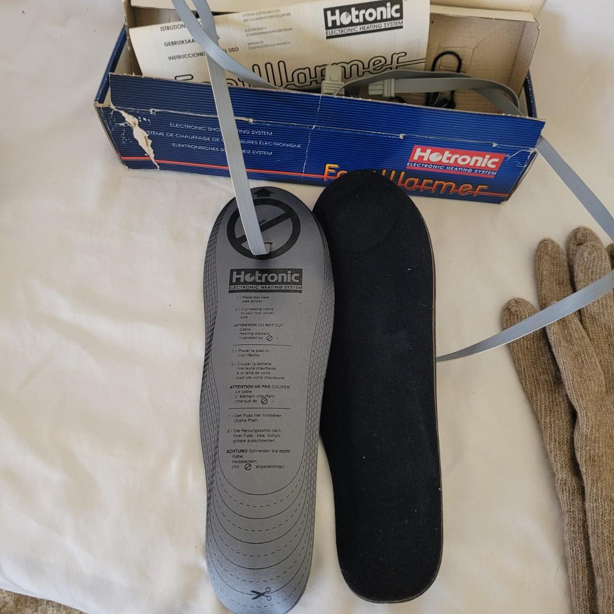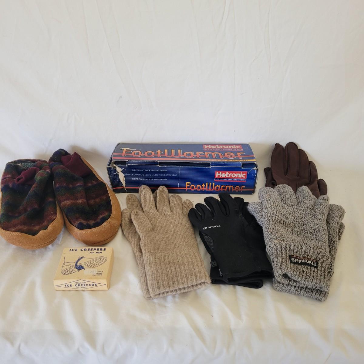 This lot includes Hotronic electronic foot warmers, Acorn Polar Pair slippers, Diamond Ice Creepers ice boot straps, and a variety of gloves. Foot warmers power on when plugged in. Shipping available.
