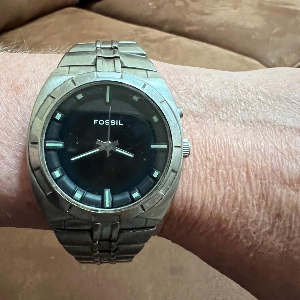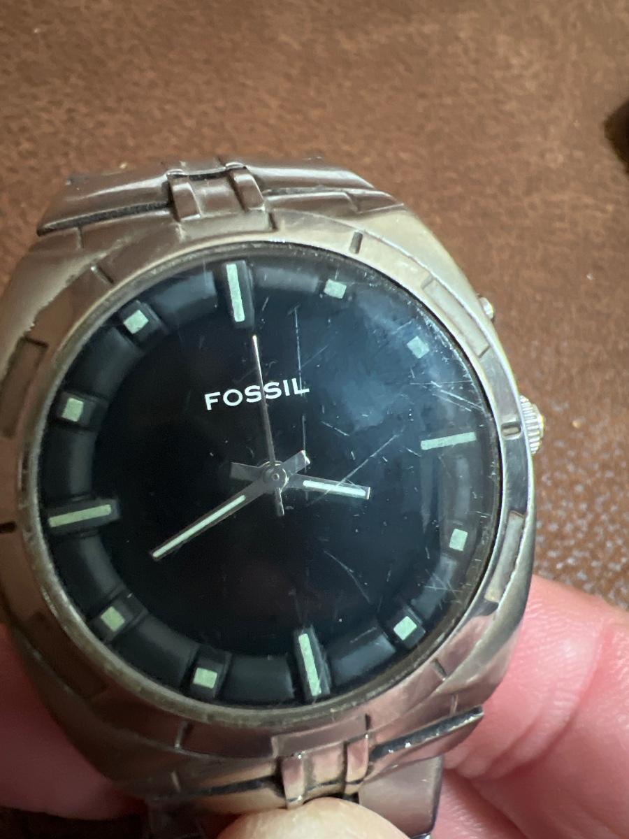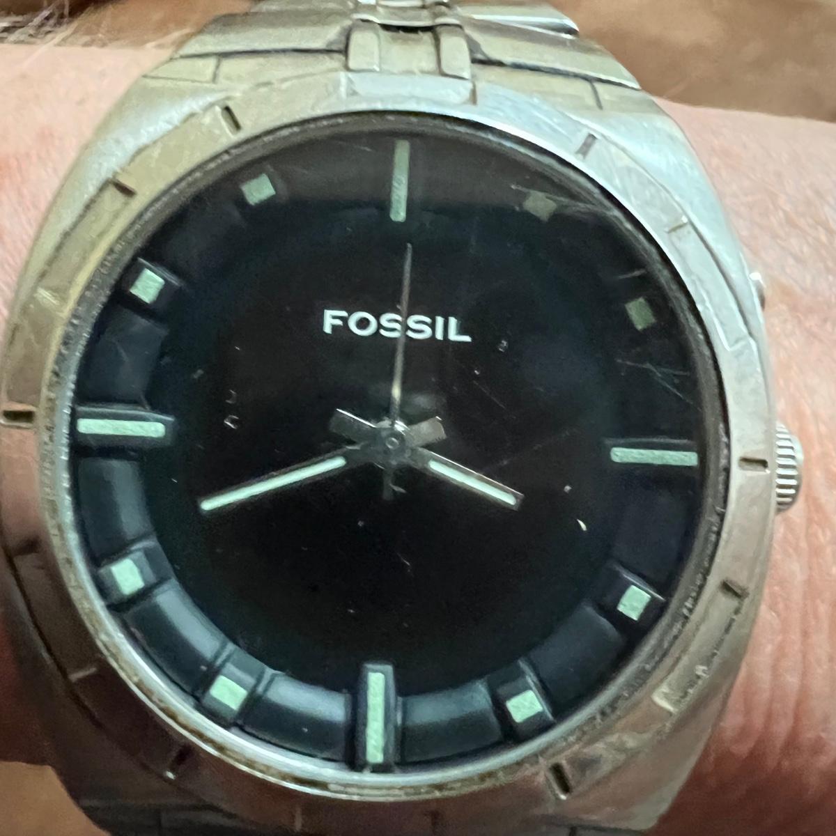 This Fossil watch has a stainless steel wristband and a black face. Watch has not been tested. Face has some light scratches. All sales final. No refunds so please bid accordingly.