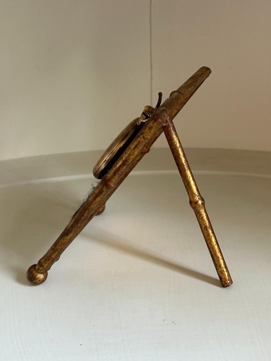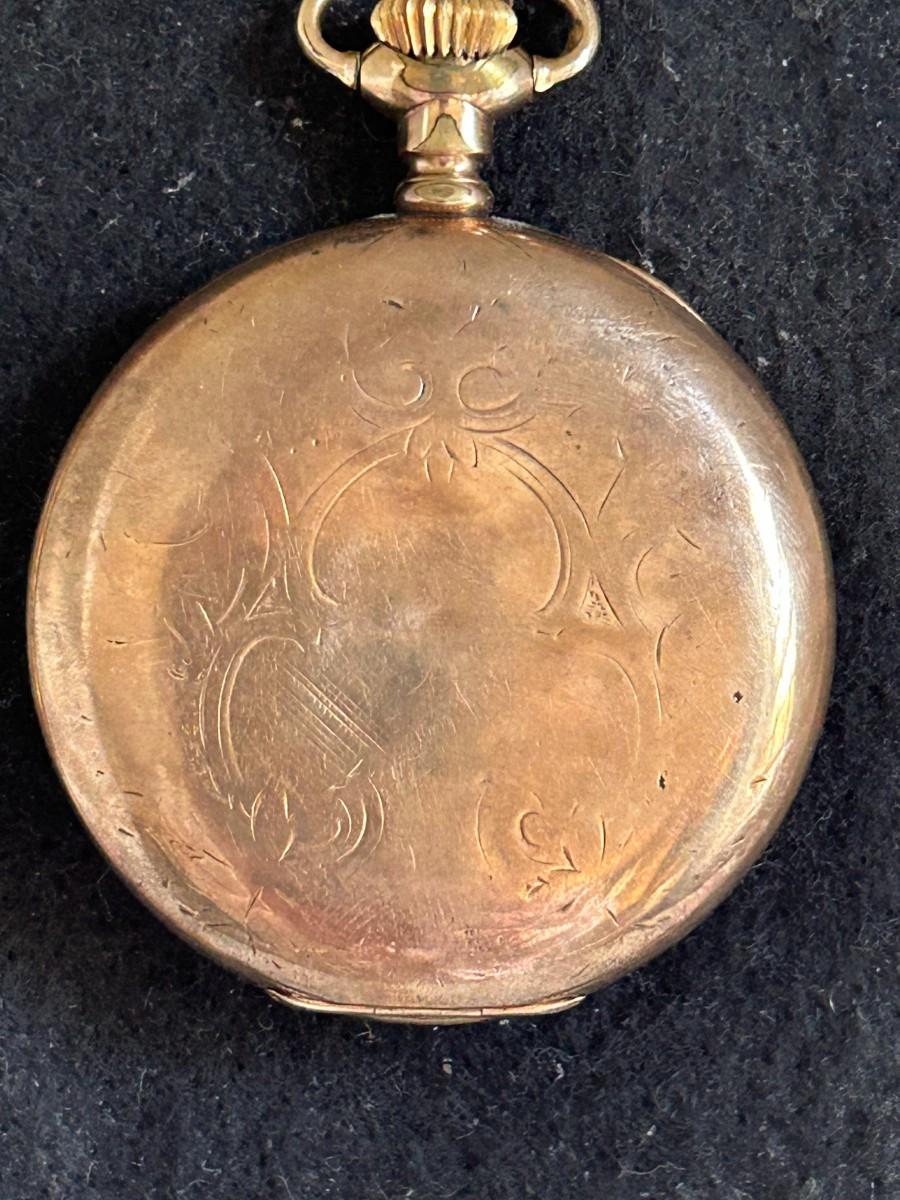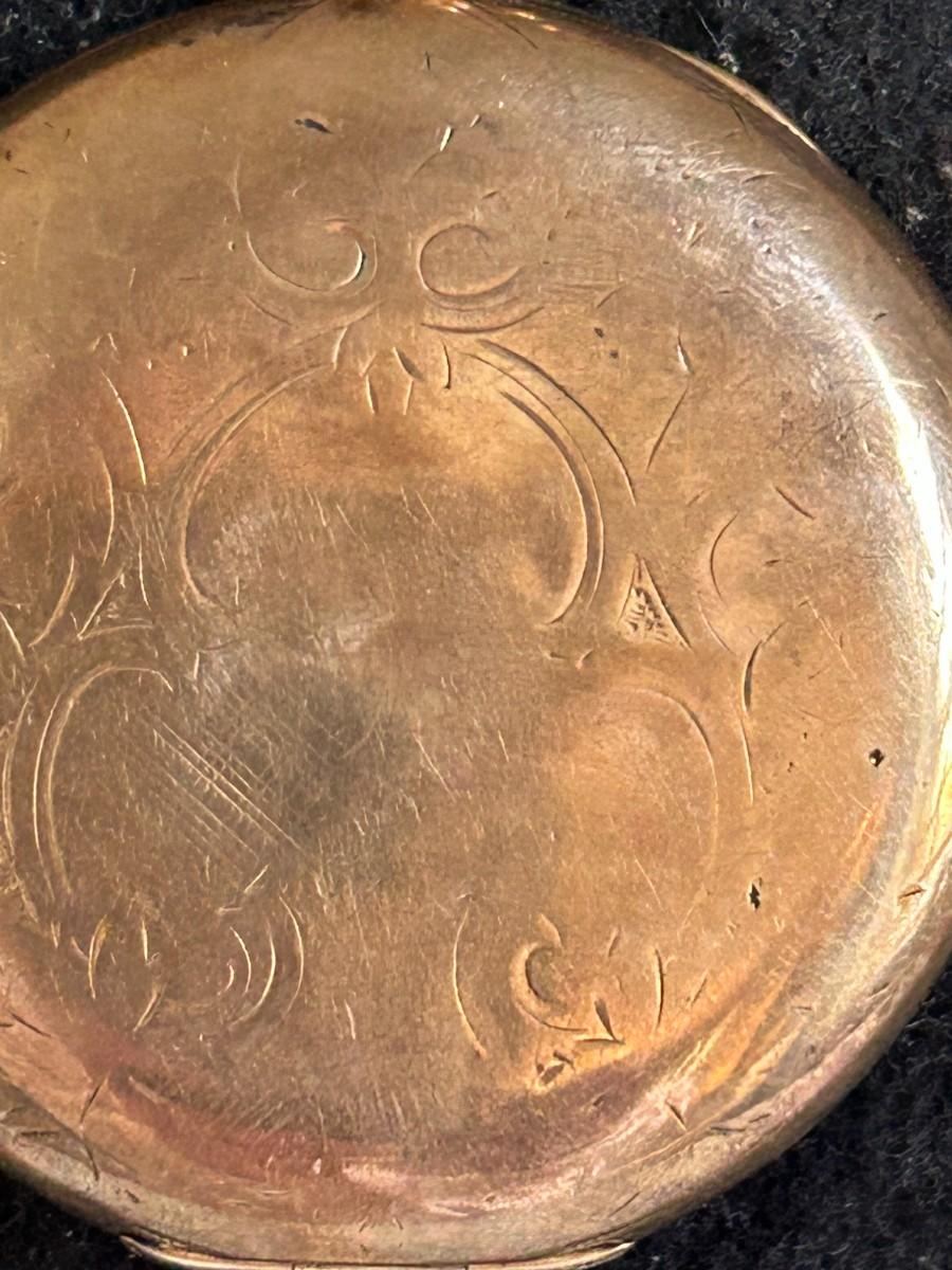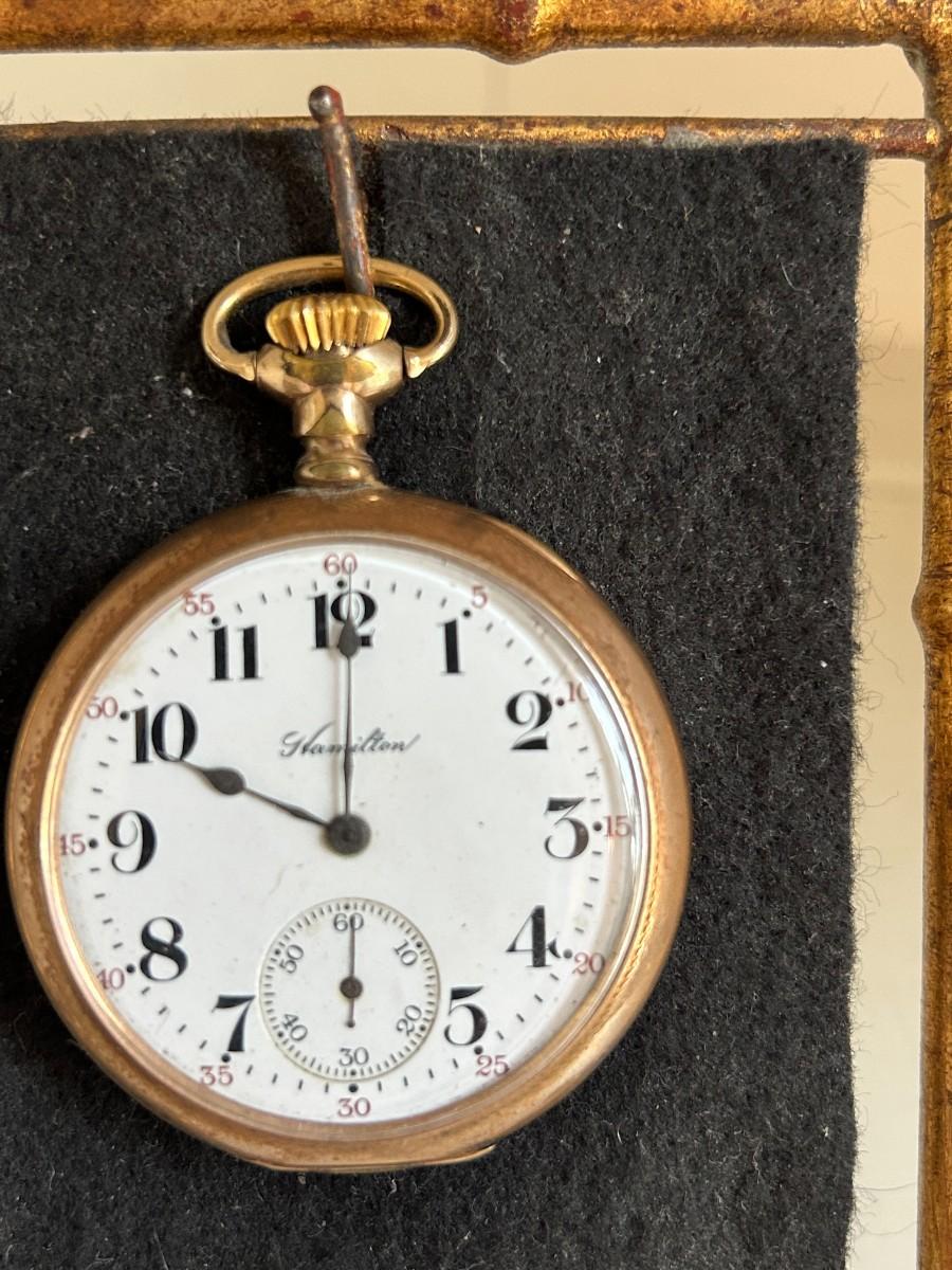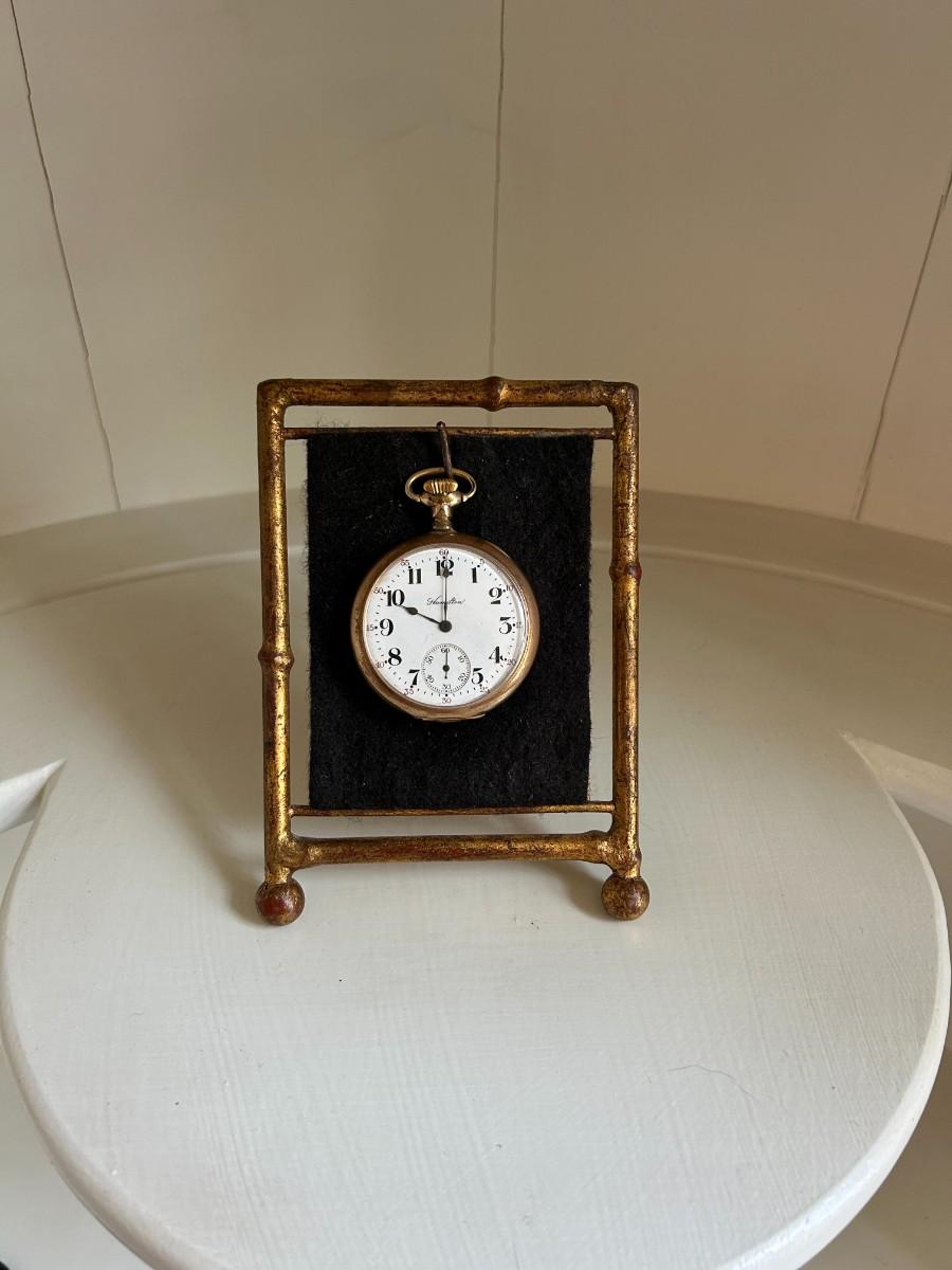 Hamilton watch company became popular for their accurate railroad watches which ensured precise timing which was crucial for preventing train accidents. Own a piece of history with this gold-filled case hung on this matted tripod for all to witness.