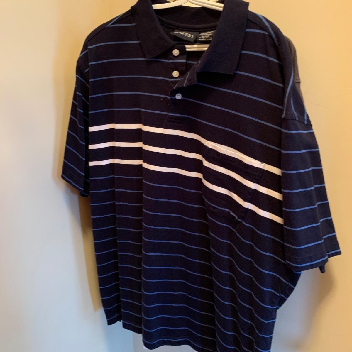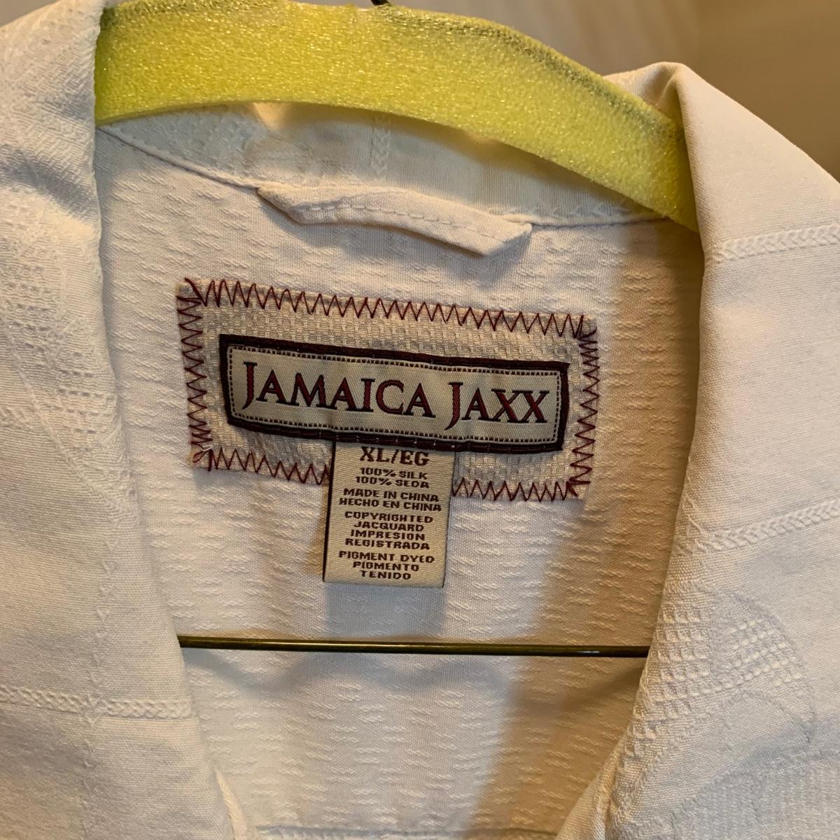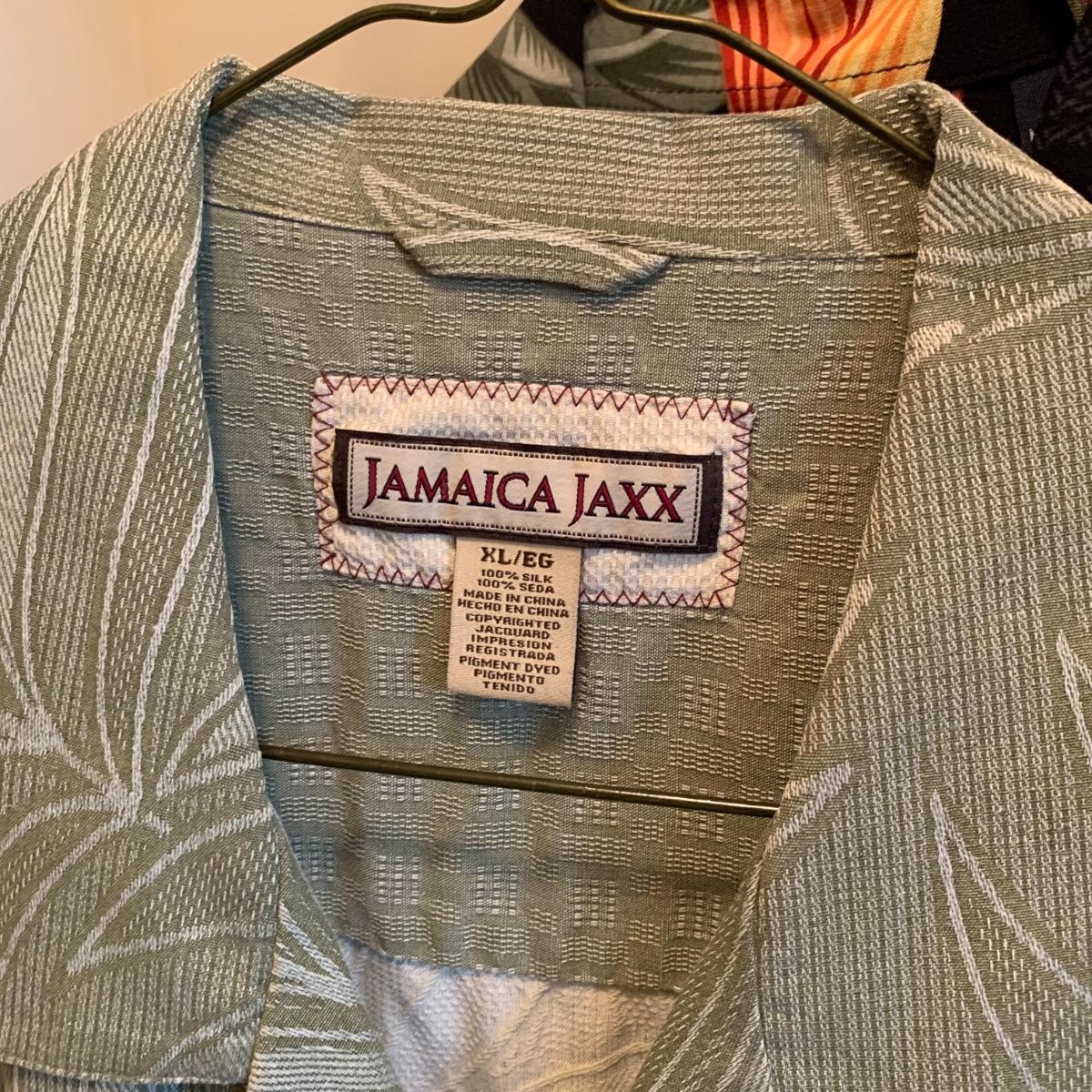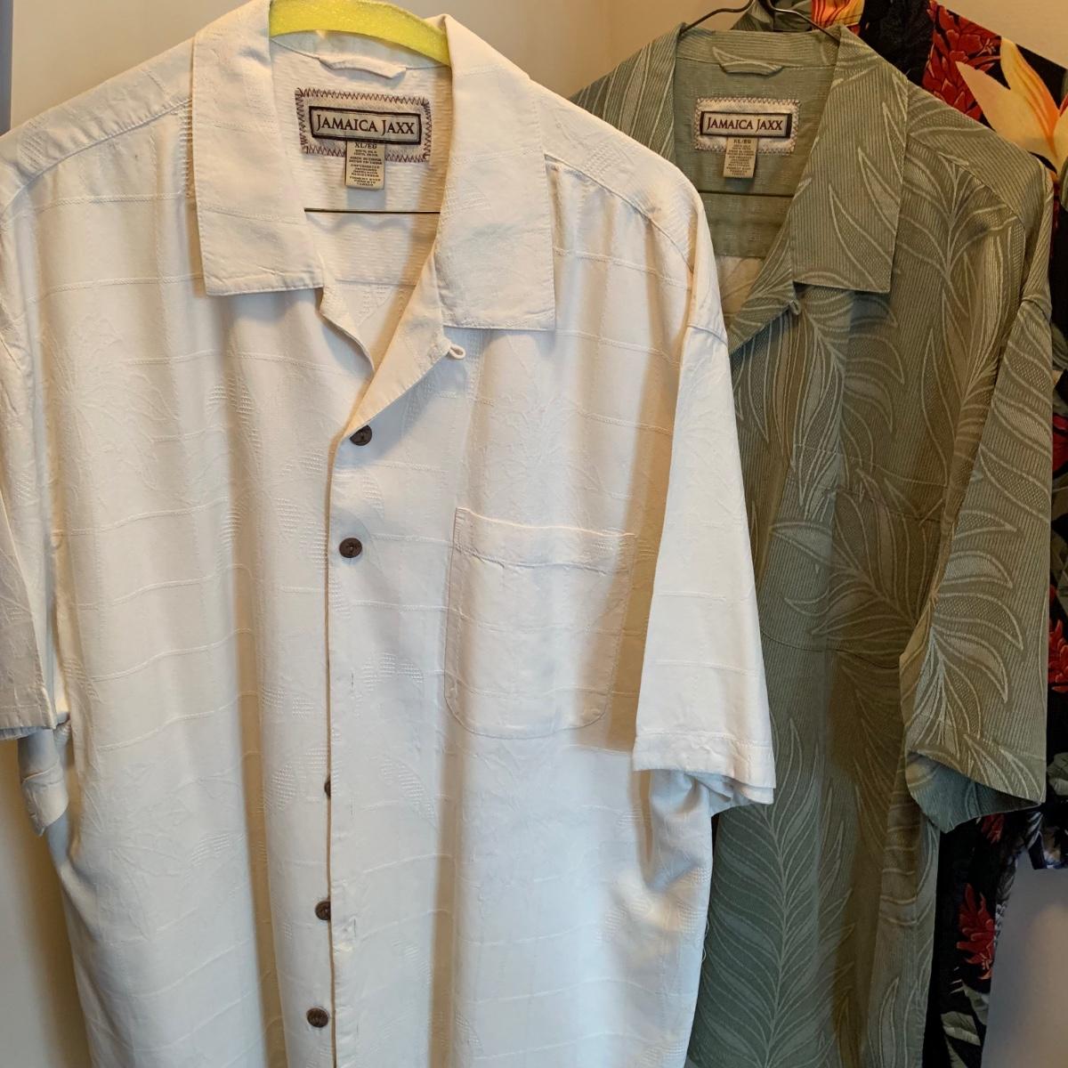 Six men’s Hawaiian style button down shirts, including two 100% silk Jamaican Jaxx shirts. Four more short sleeve button downs and two long sleeve button downs, as well as 13 short sleeve collared knit cotton shirts are part of this lot. Sizes are XL and 2X.