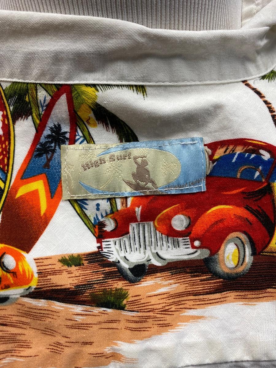 Men's High Surf button front Hawaiian shirt featuring a classic car beach theme design. Short sleeve, 100% cotton shirt, size medium. In good condition. No spots or holes.