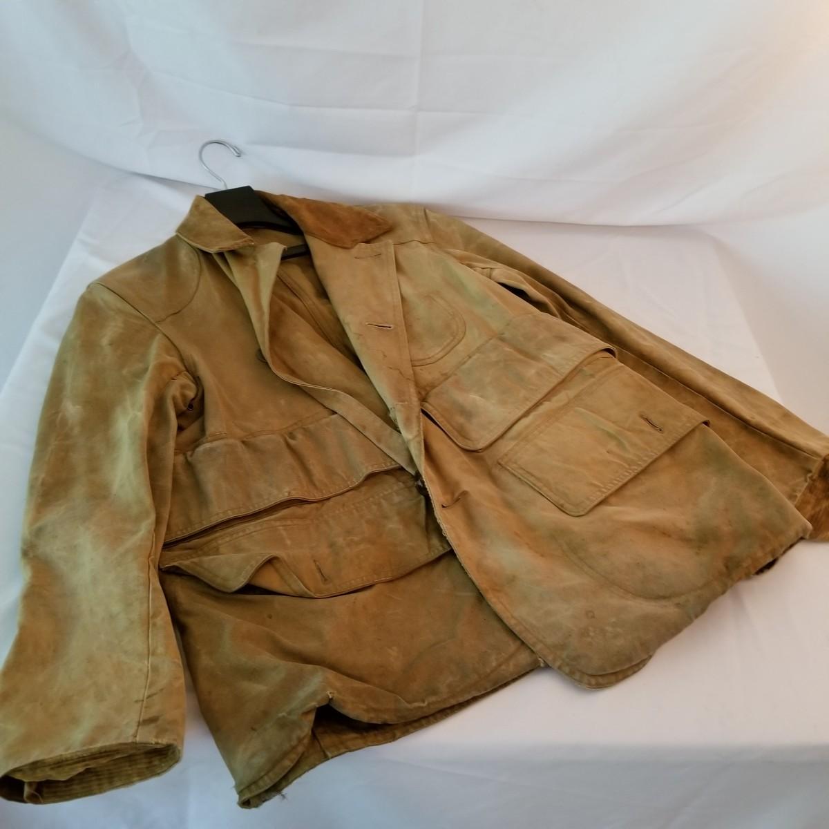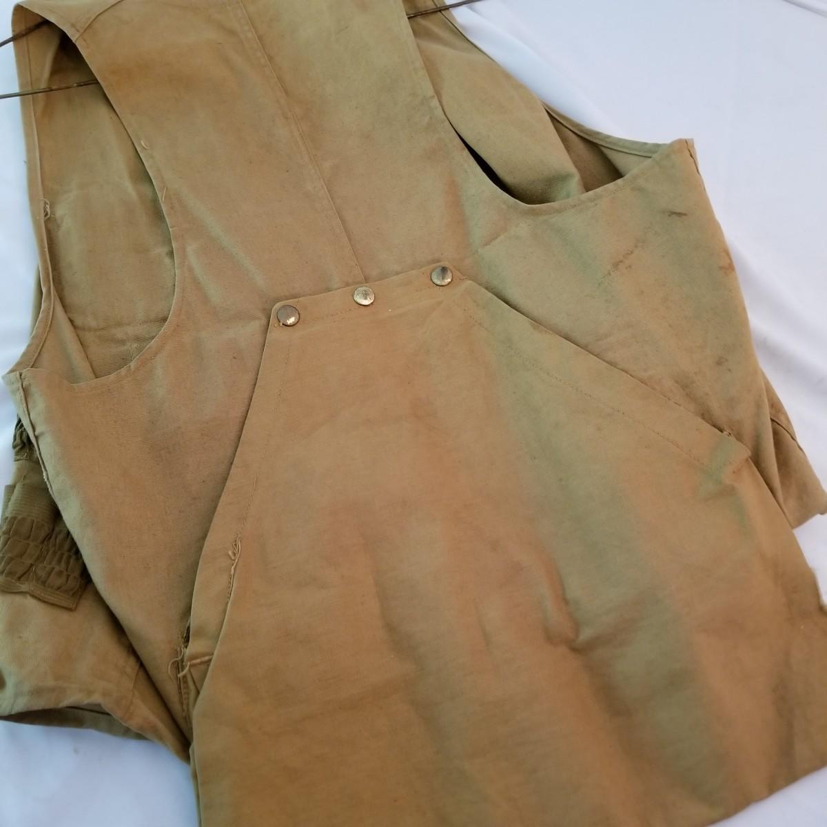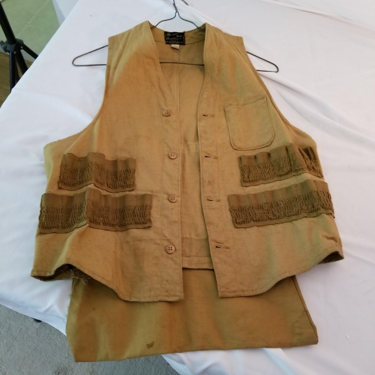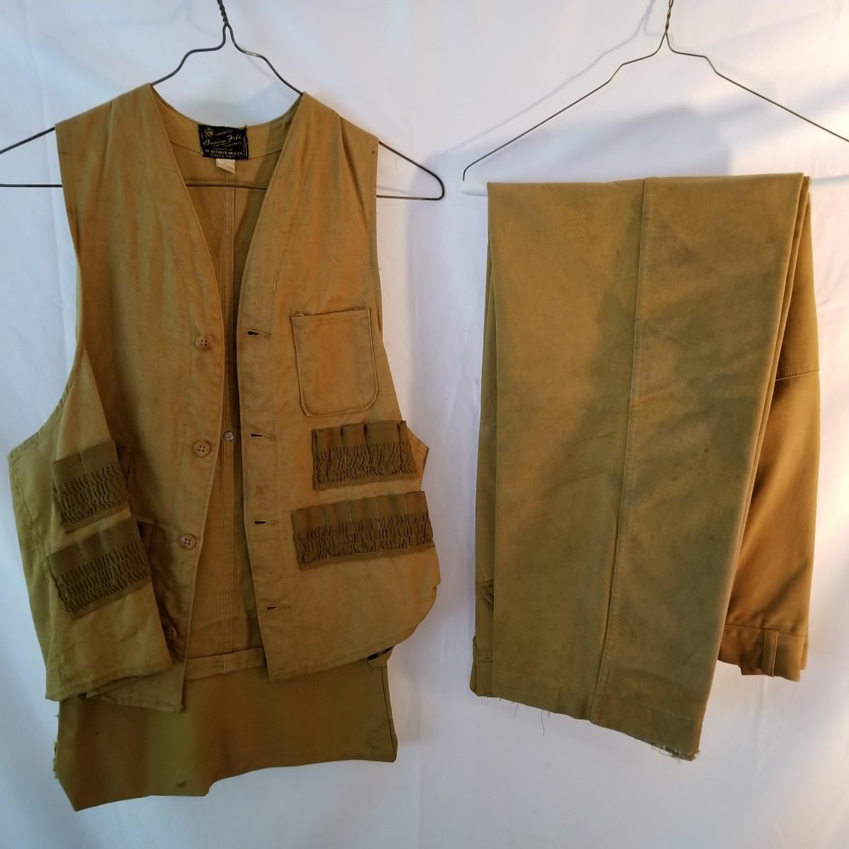Three piece set of heavy canvas clothing for hunting. Jacket, pants, and vest are field tan color. Vest and jacket have rear game pockets. Sizes approximately large - XL. Items in fair condition, see photos for detail.  Shipping available.