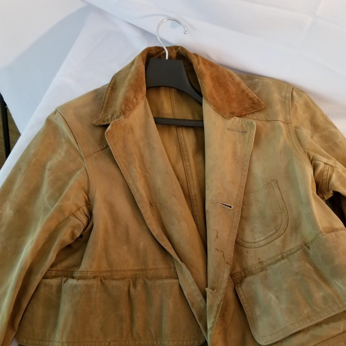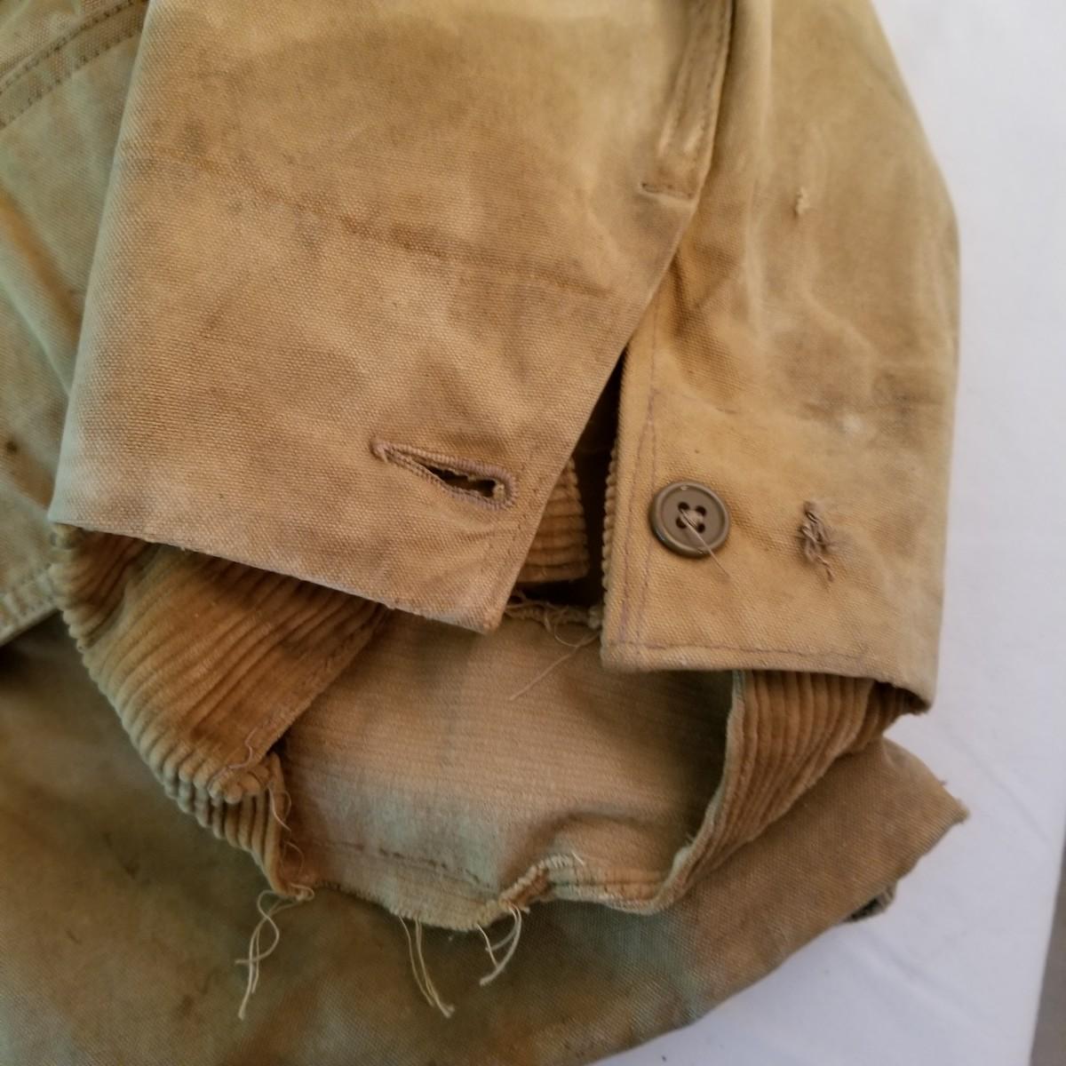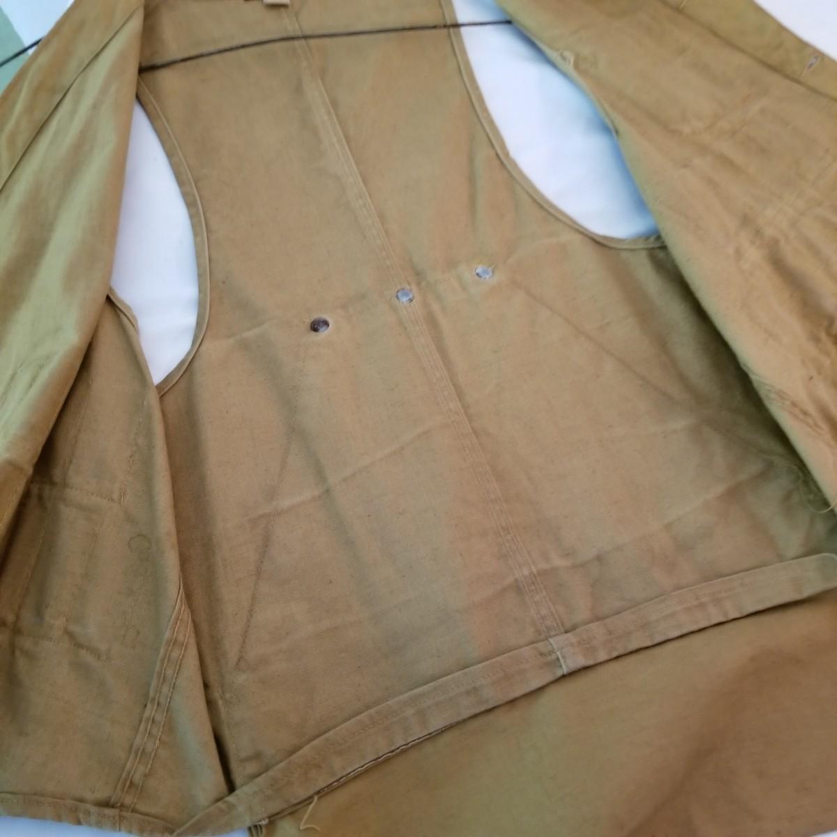 Three piece set of heavy canvas clothing for hunting. Jacket, pants, and vest are field tan color. Vest and jacket have rear game pockets. Sizes approximately large - XL. Items in fair condition, see photos for detail.  Shipping available.