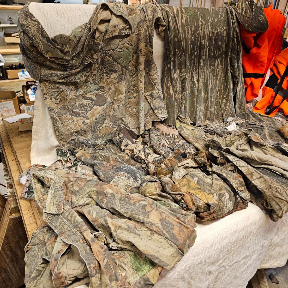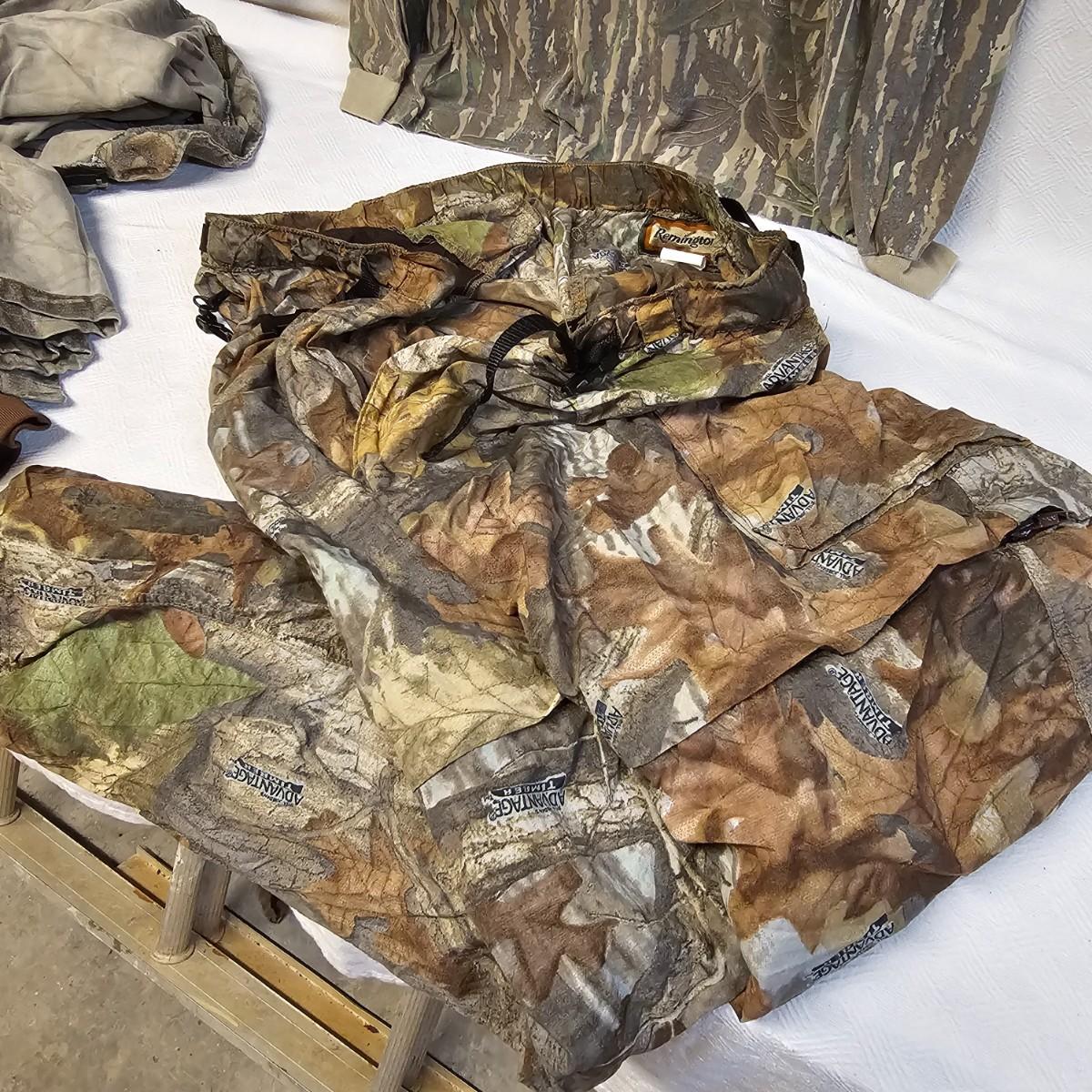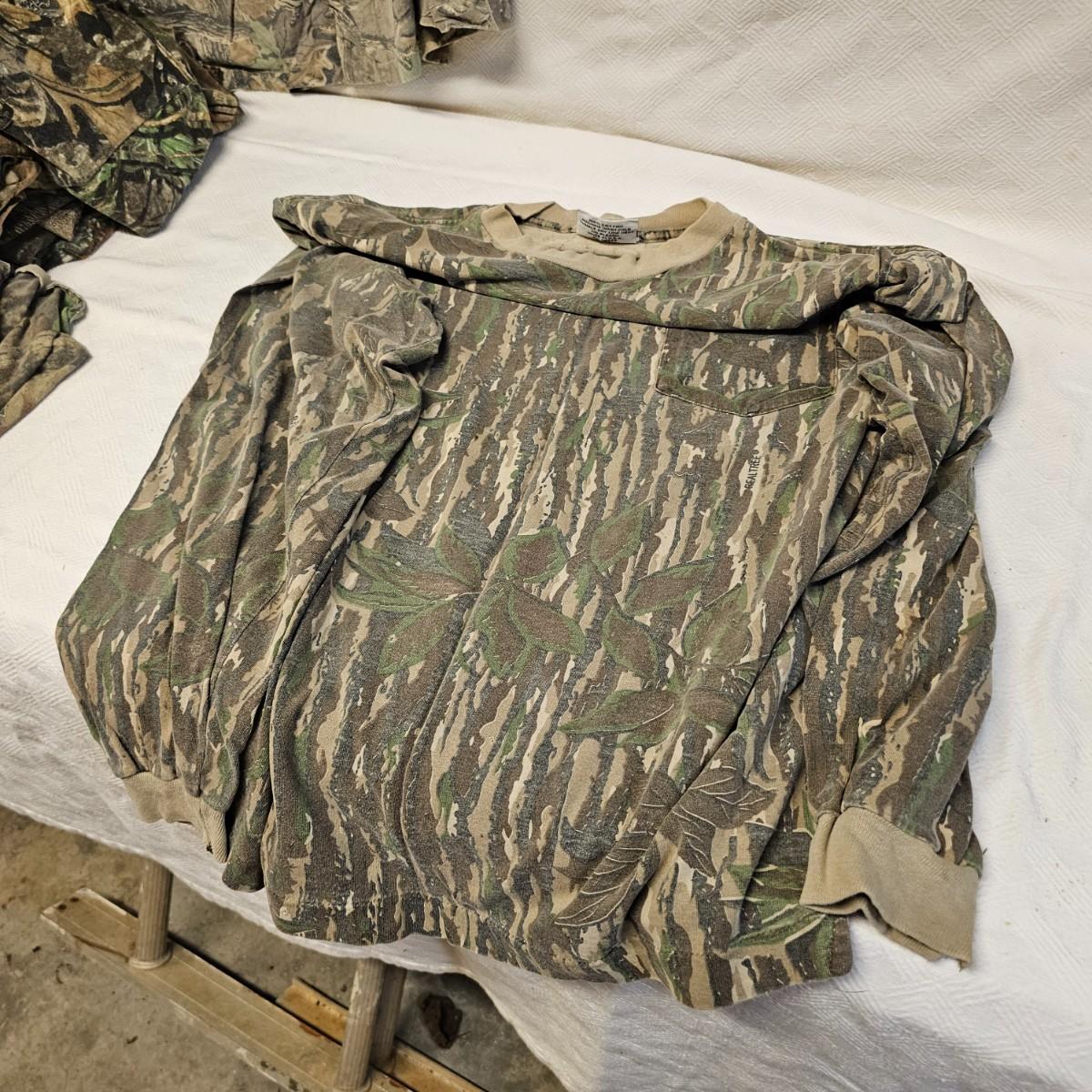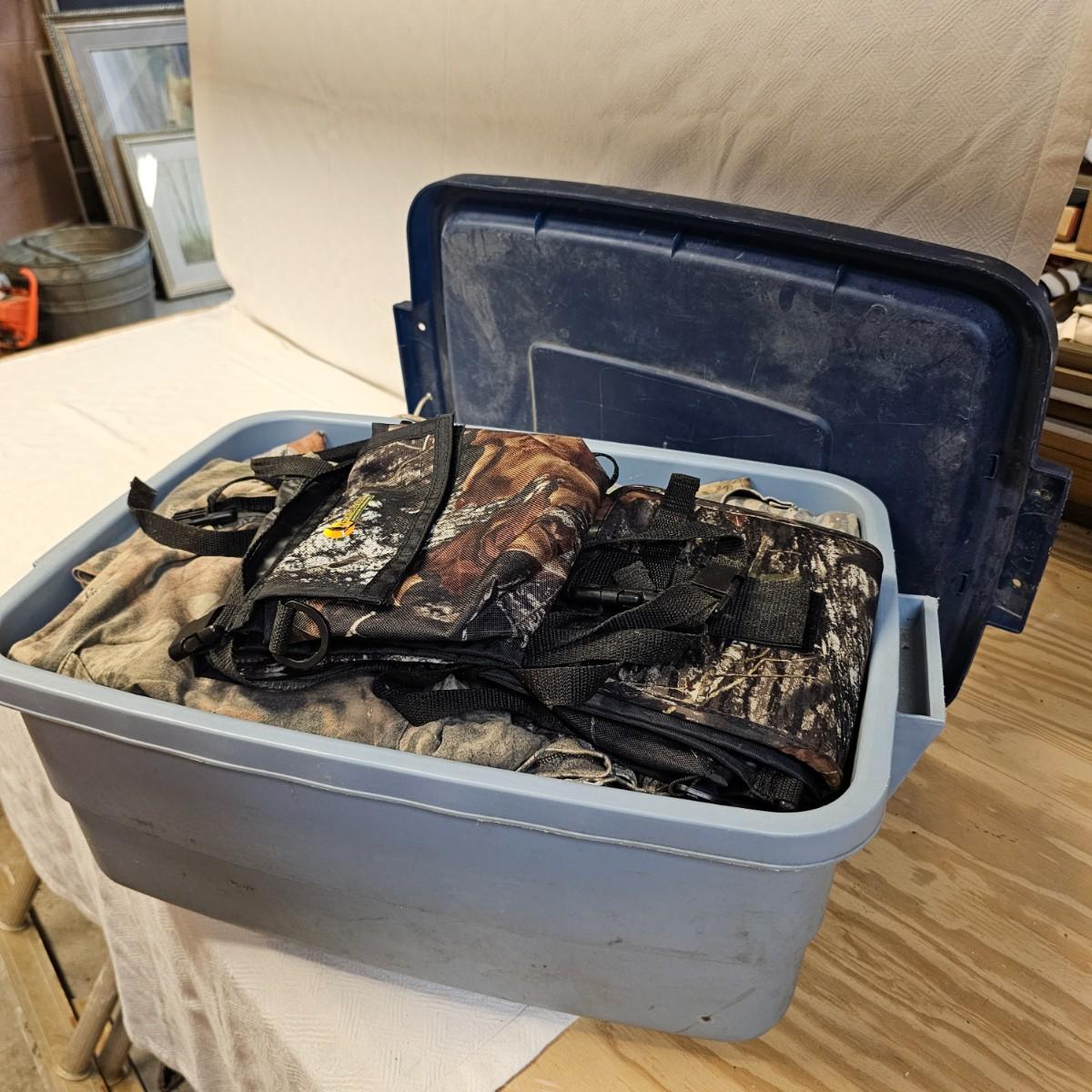 An entire tub of camo shirts and pants. Three pair of pants, most 40" x 30". Two jackets, size large. Six long sleeve shirts and three short sleeve shirts, most are lsrge to extra large. Brands by Liberty, RealTree, others. Four orange safety vests, three caps and one pair of fingerless gloves. Also includes two waist packs, and the tub it all is in. See photos for details. Shipping available.