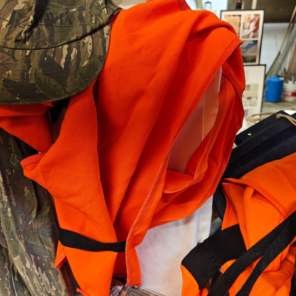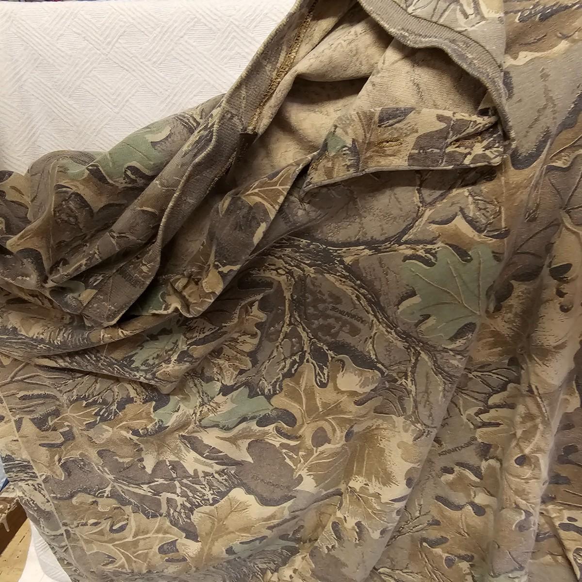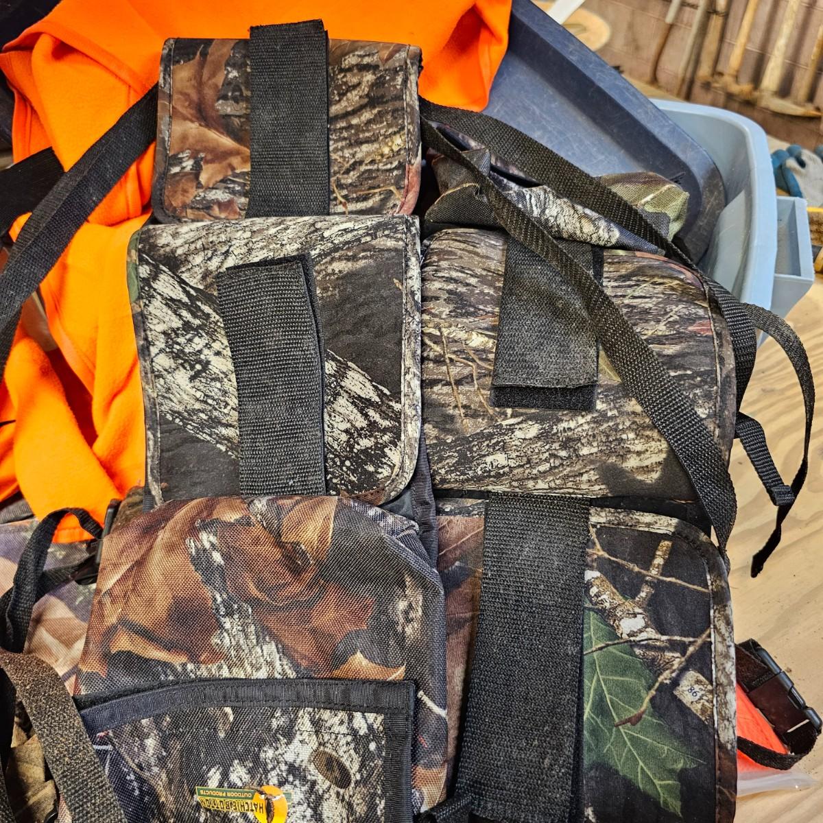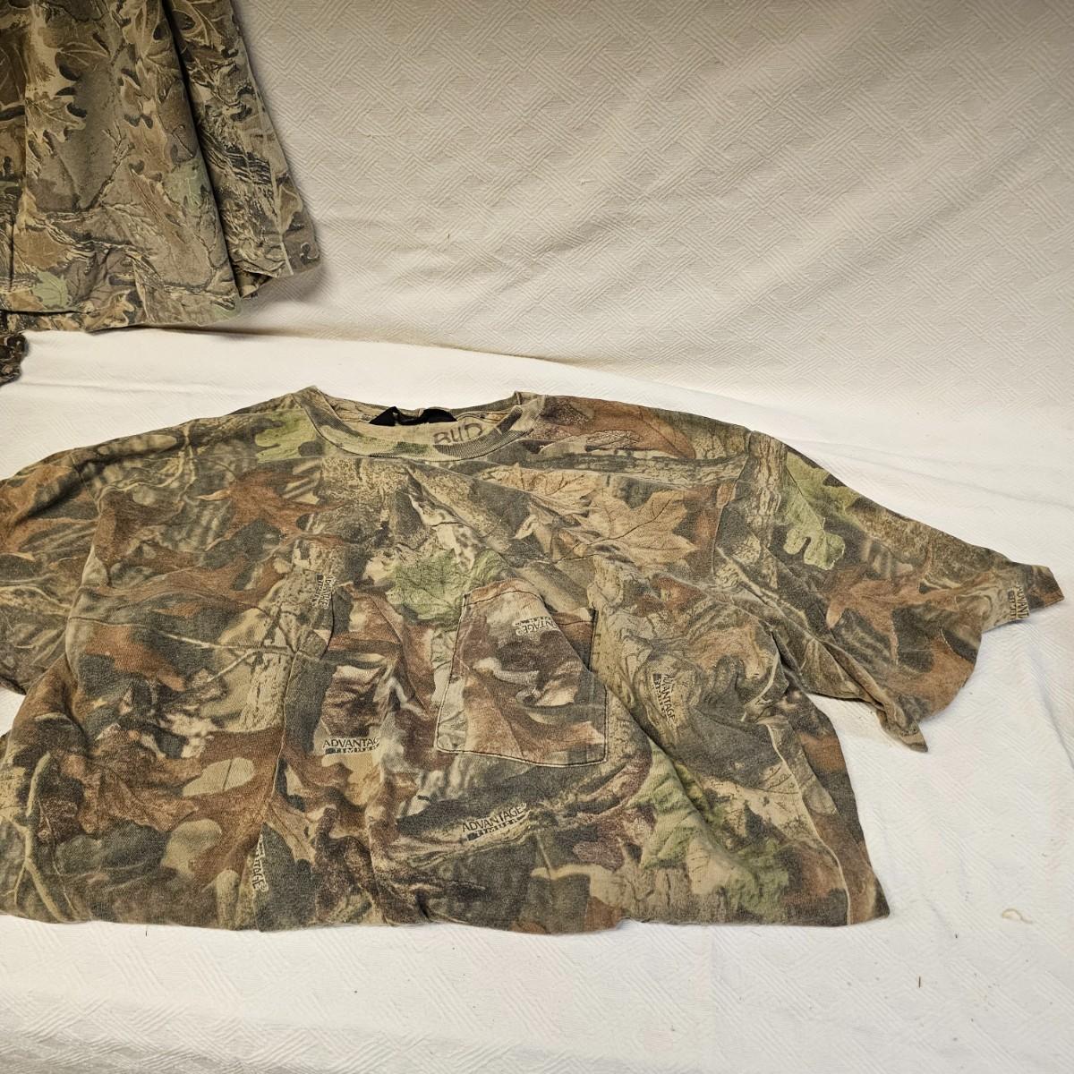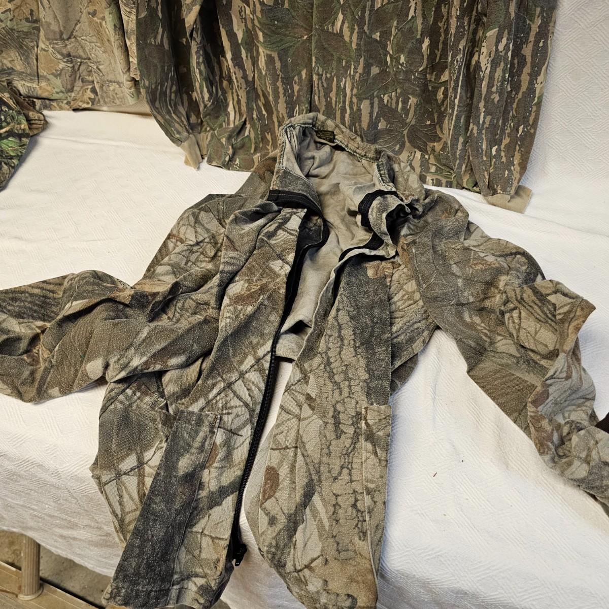 An entire tub of camo shirts and pants. Three pair of pants, most 40" x 30". Two jackets, size large. Six long sleeve shirts and three short sleeve shirts, most are lsrge to extra large. Brands by Liberty, RealTree, others. Four orange safety vests, three caps and one pair of fingerless gloves. Also includes two waist packs, and the tub it all is in. See photos for details. Shipping available.