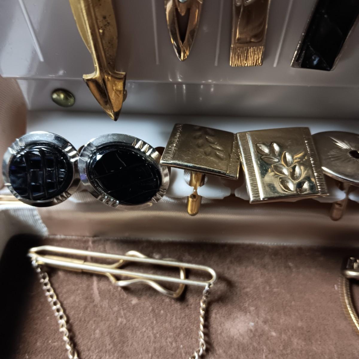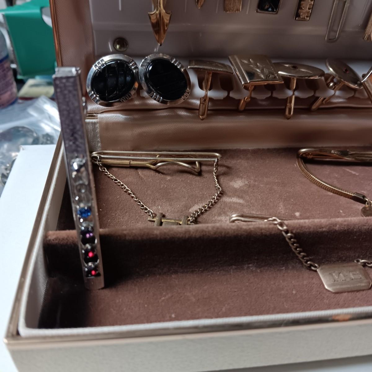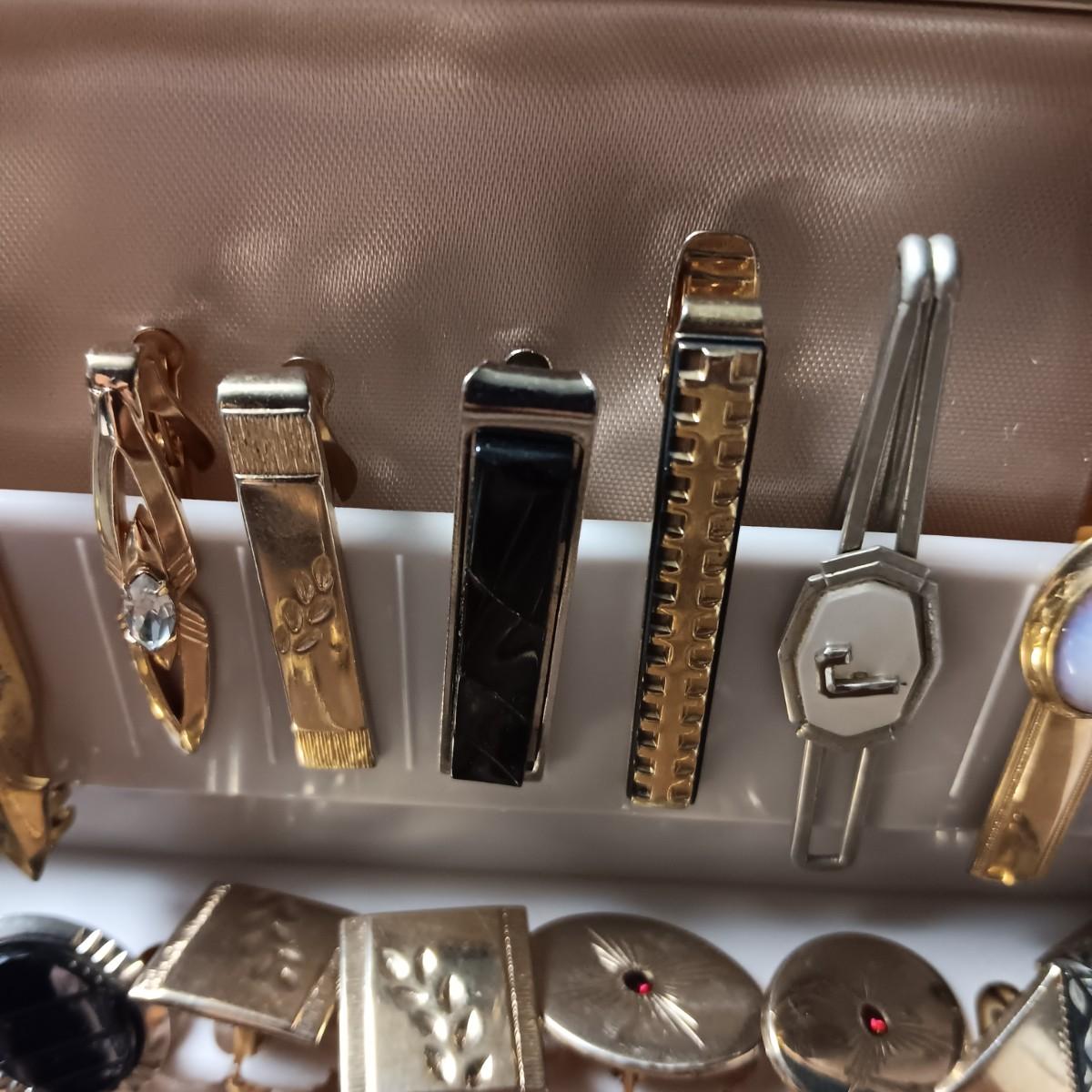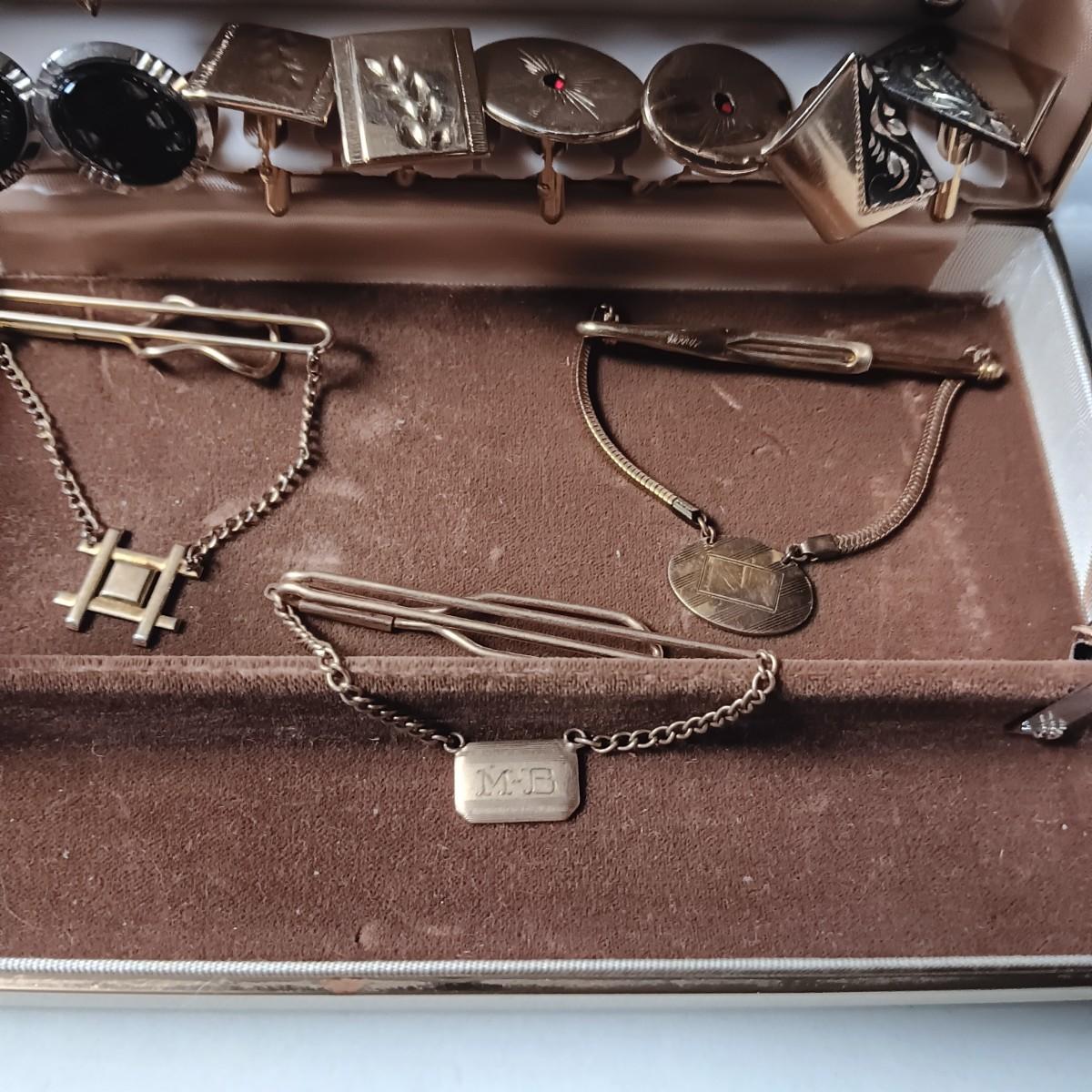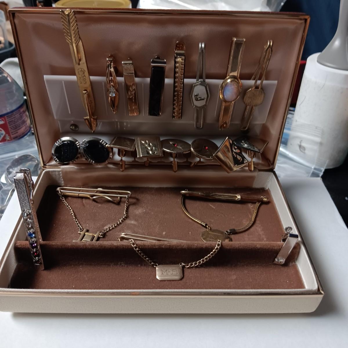 MEN'S JEWELRY BOX WITH 2 STERLING TIE CLIPS AMONG MANY OTHER TIE CLIPS AND CUFFLINKS