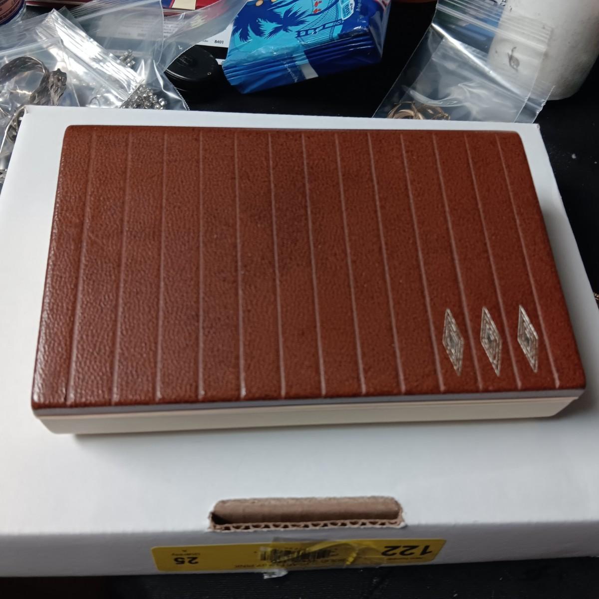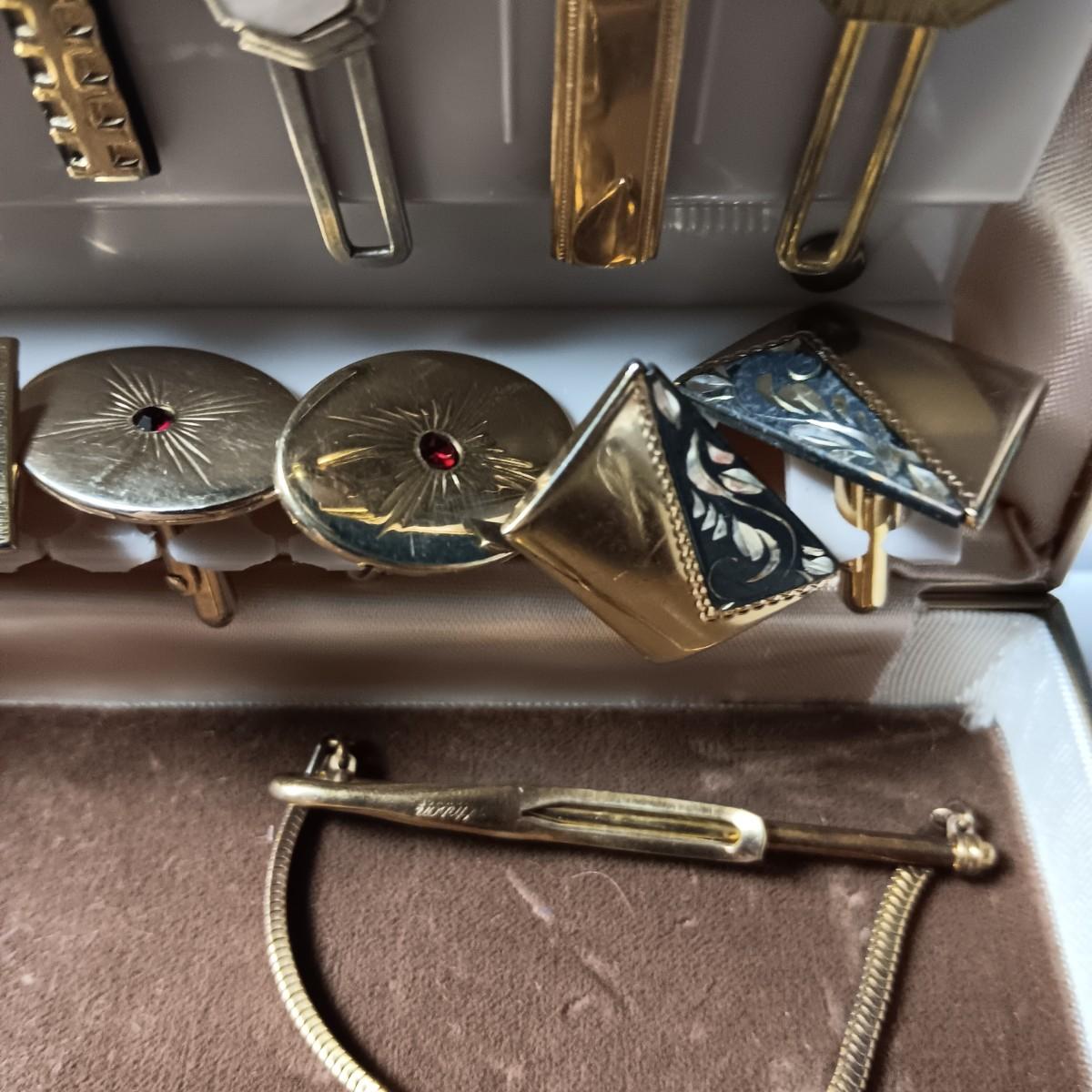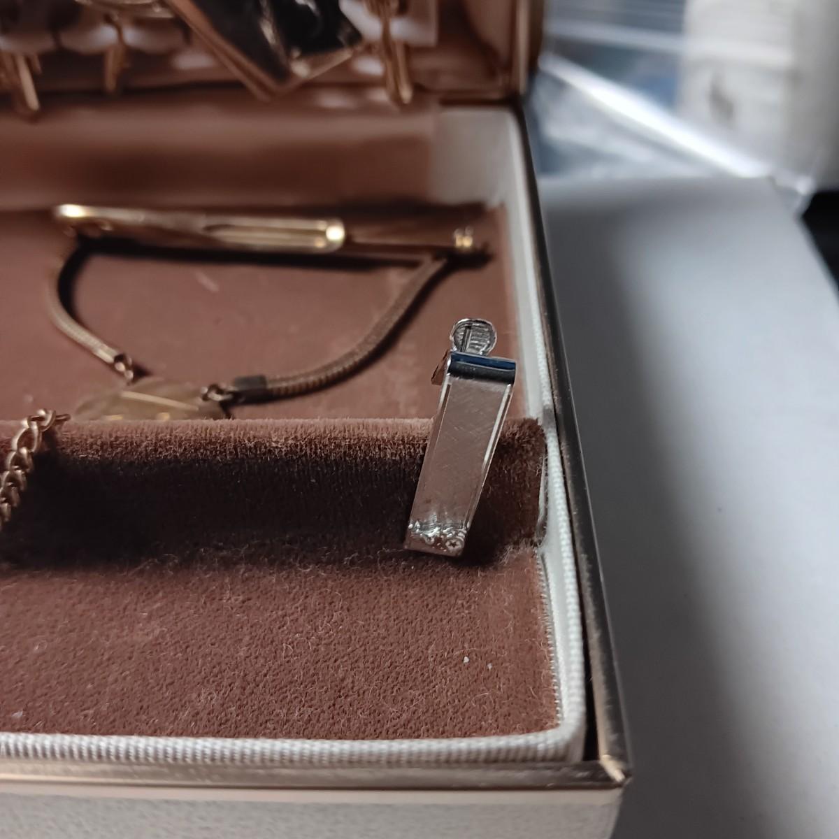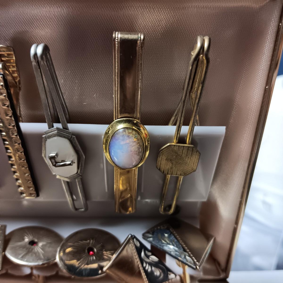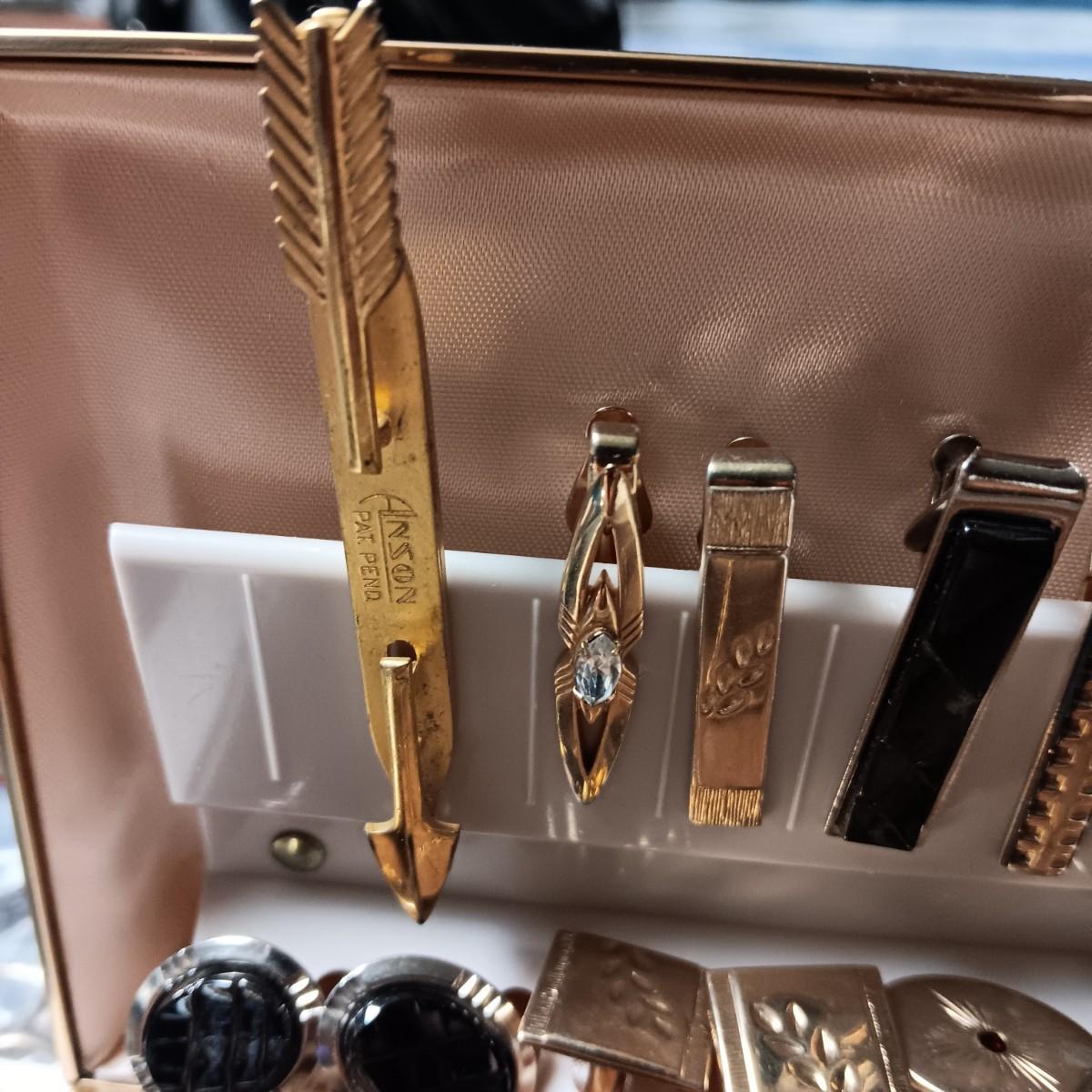 MEN'S JEWELRY BOX WITH 2 STERLING TIE CLIPS AMONG MANY OTHER TIE CLIPS AND CUFFLINKS