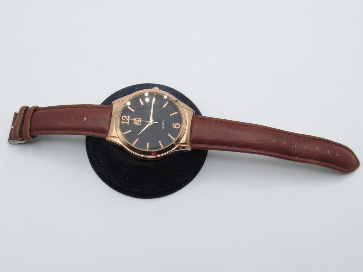 Men's K Rose Gold Tone with Brown Strap Round Face Watch