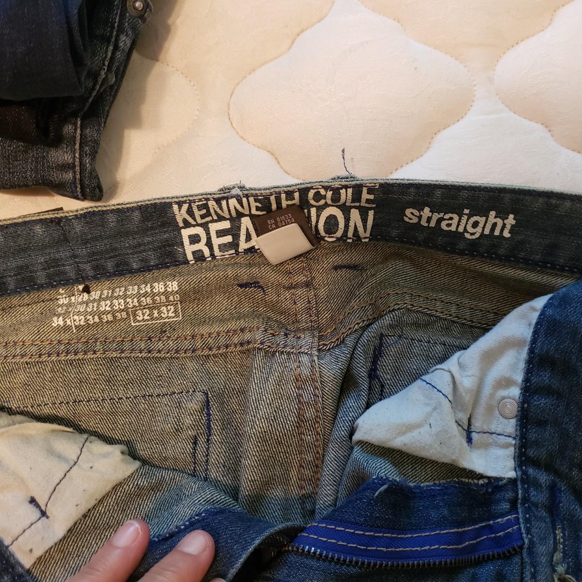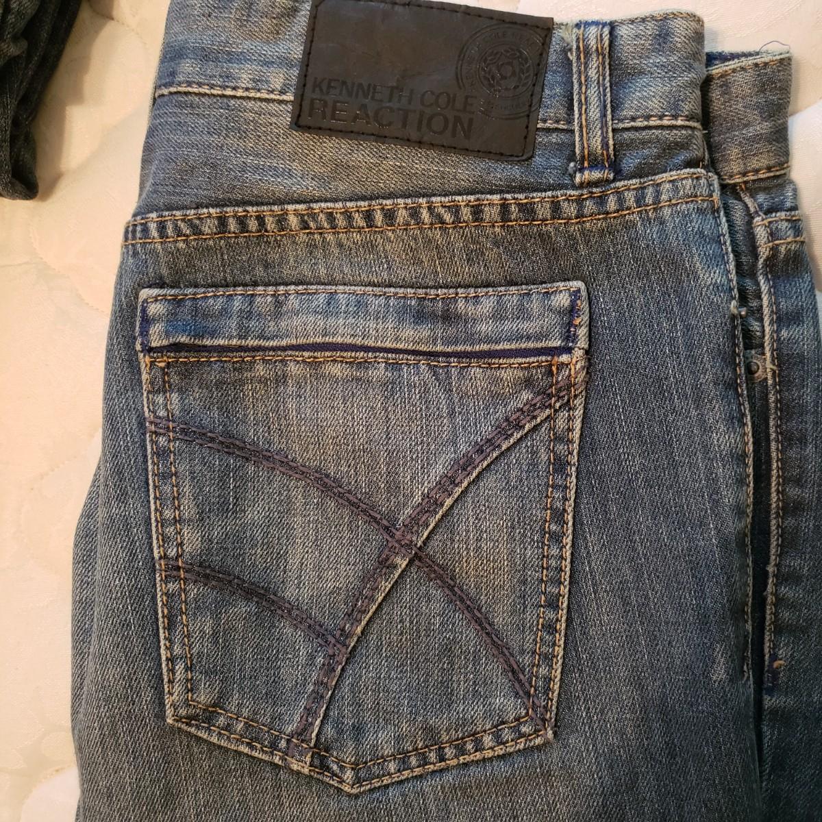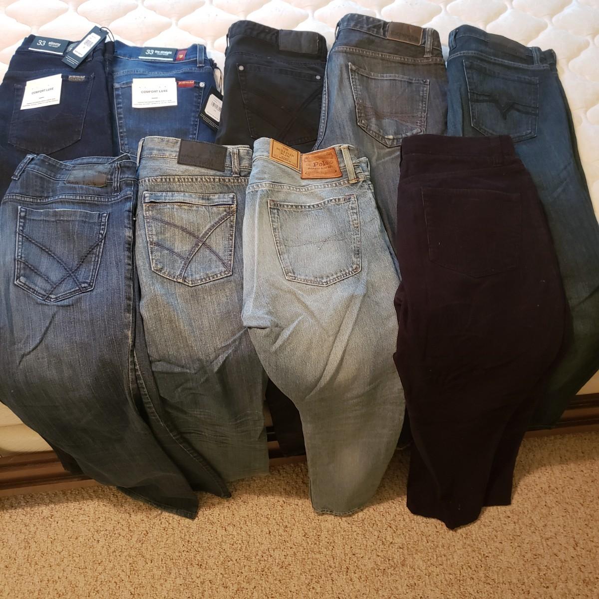 This lot contains eight pairs of men's jeans and and one pair of black corduroy pants. Sizes are 34x32 or 33x32, see pictures for details. There are four pairs of Kenneth Cole Reaction, one pair of new Pilot, by Ralph Lauren, one pair of Express Jeans, Berle black corduroy pants (the pictures don't show the black, but they are), and two new 7 For All Mankind jeans.