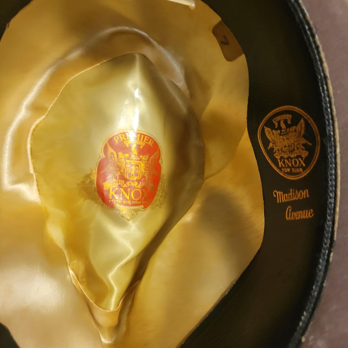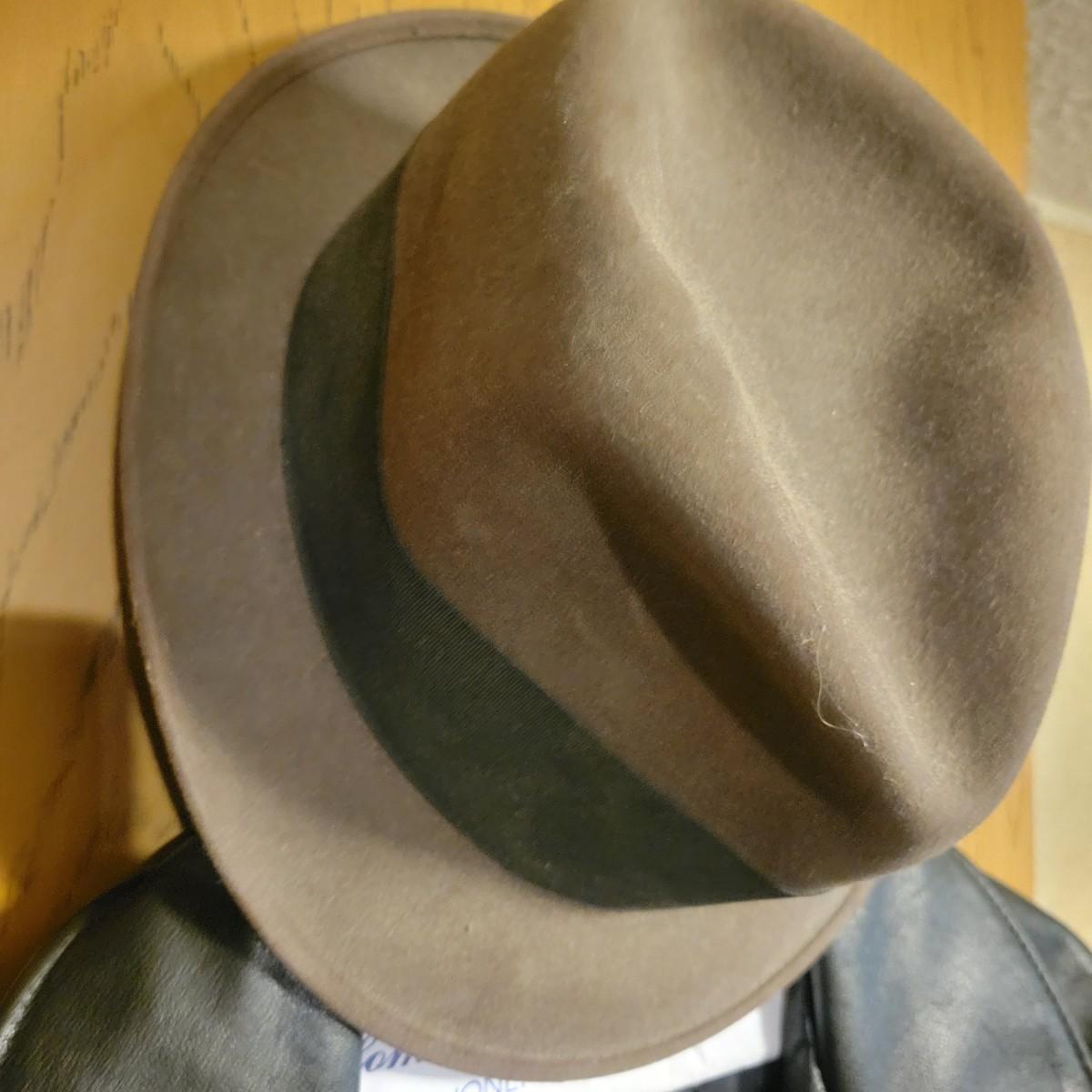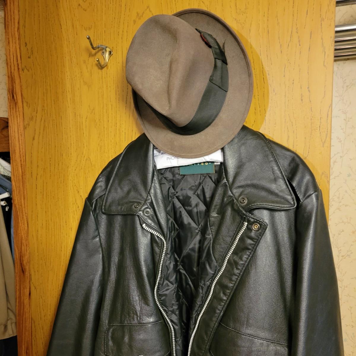 A man's felt dress hat made by Knox and is in good condition with some minor wear from use. Hat is a sz7. Also included is a men's leather jacket manufactured by Oakton Limited in good condition with some minor wear from use. Jacket is XL Tall. Shipping available