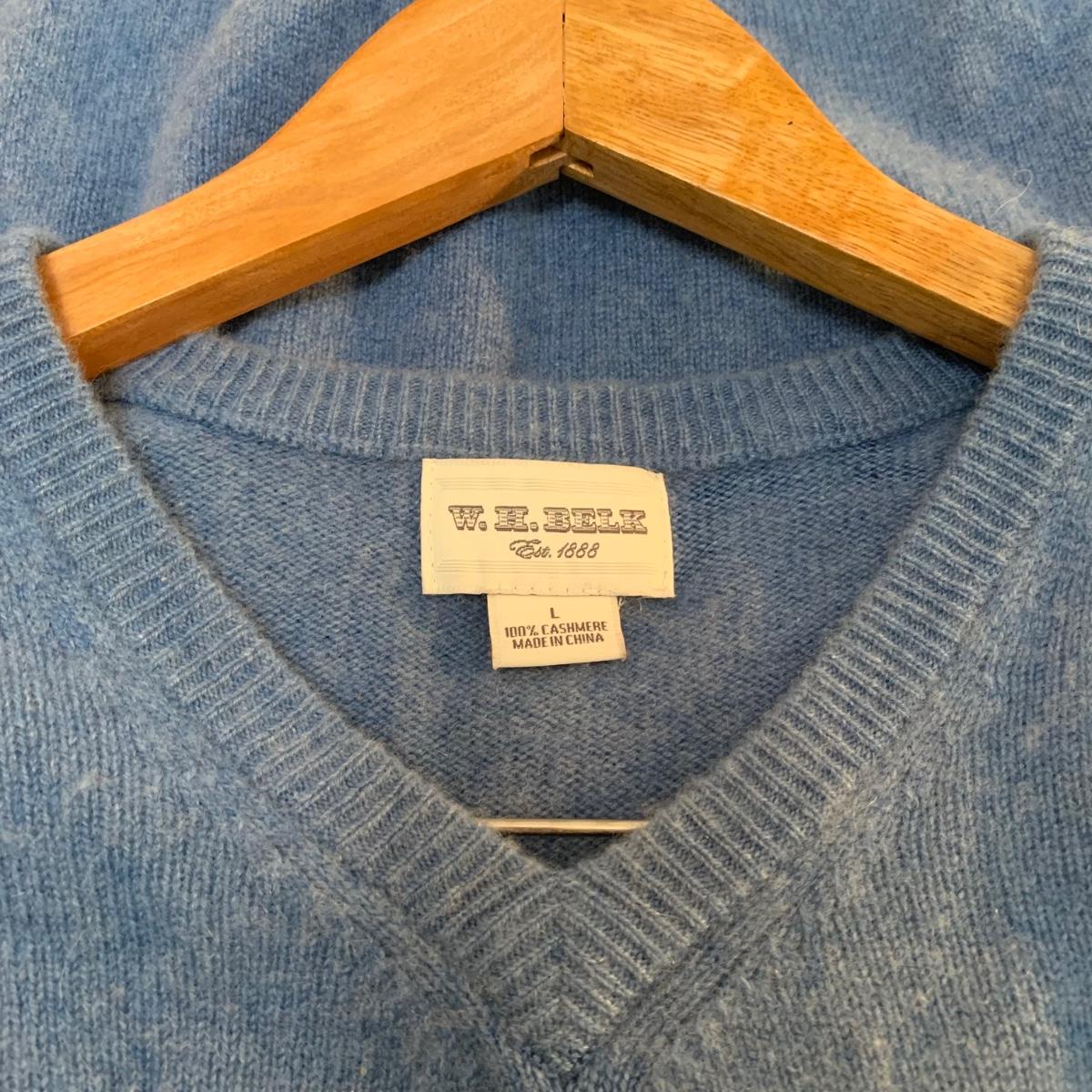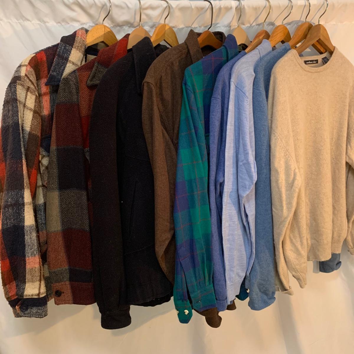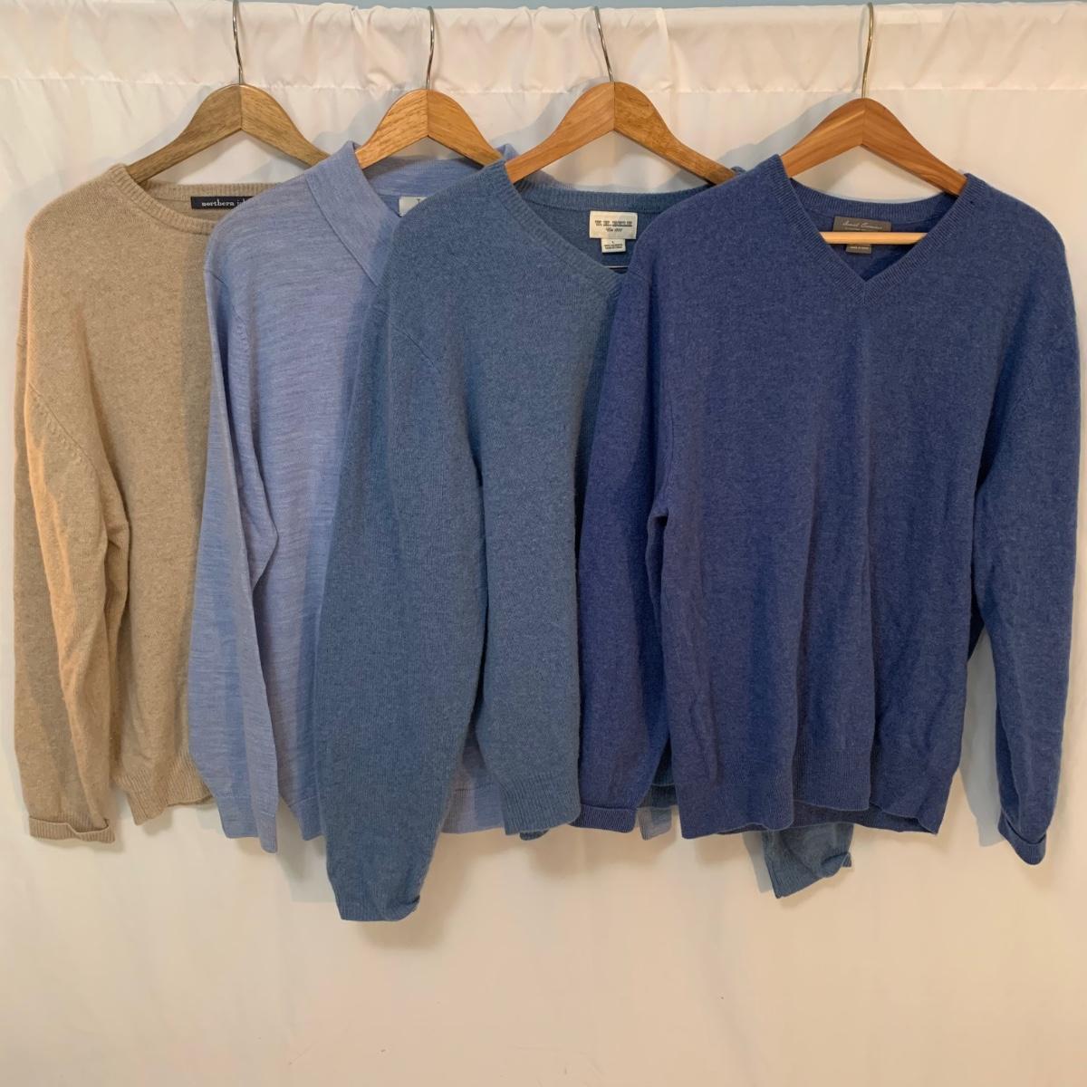 Includes are two mens plaid patterned jackets, black Lakeland jacket, two flannel shirts, and an assortment of cashmere and merino wool sweaters. Brands include Northern Isles, WH Belk, Turnbury Merino, and Daniel Cremieux Cashmere. Sizes on all items are large. Black Lakeland jacket needs cleaning from storage, otherwise all items are in good condition.