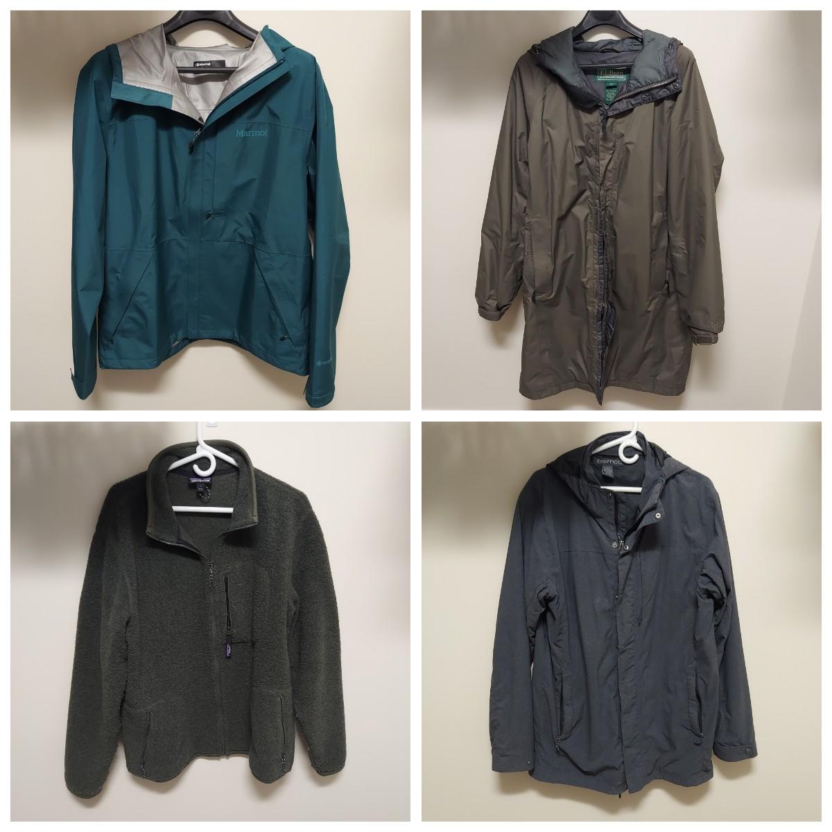 Nine coats and jackets in men's size large. Brands include L.L. Bean, Marmot, Mountain Hardware, Patagonia and more. Brown Mt. Hardware coat has spots on front. Please see photos for details. Shipping available