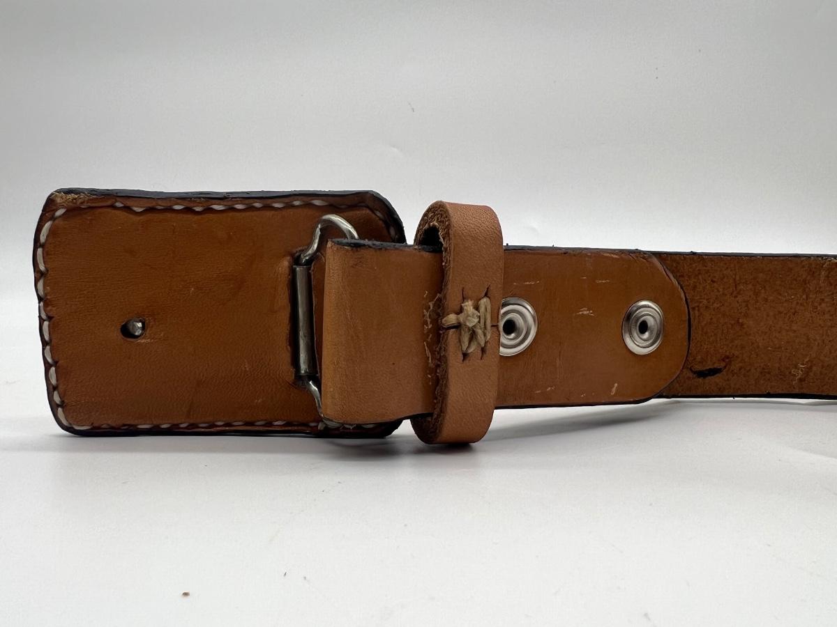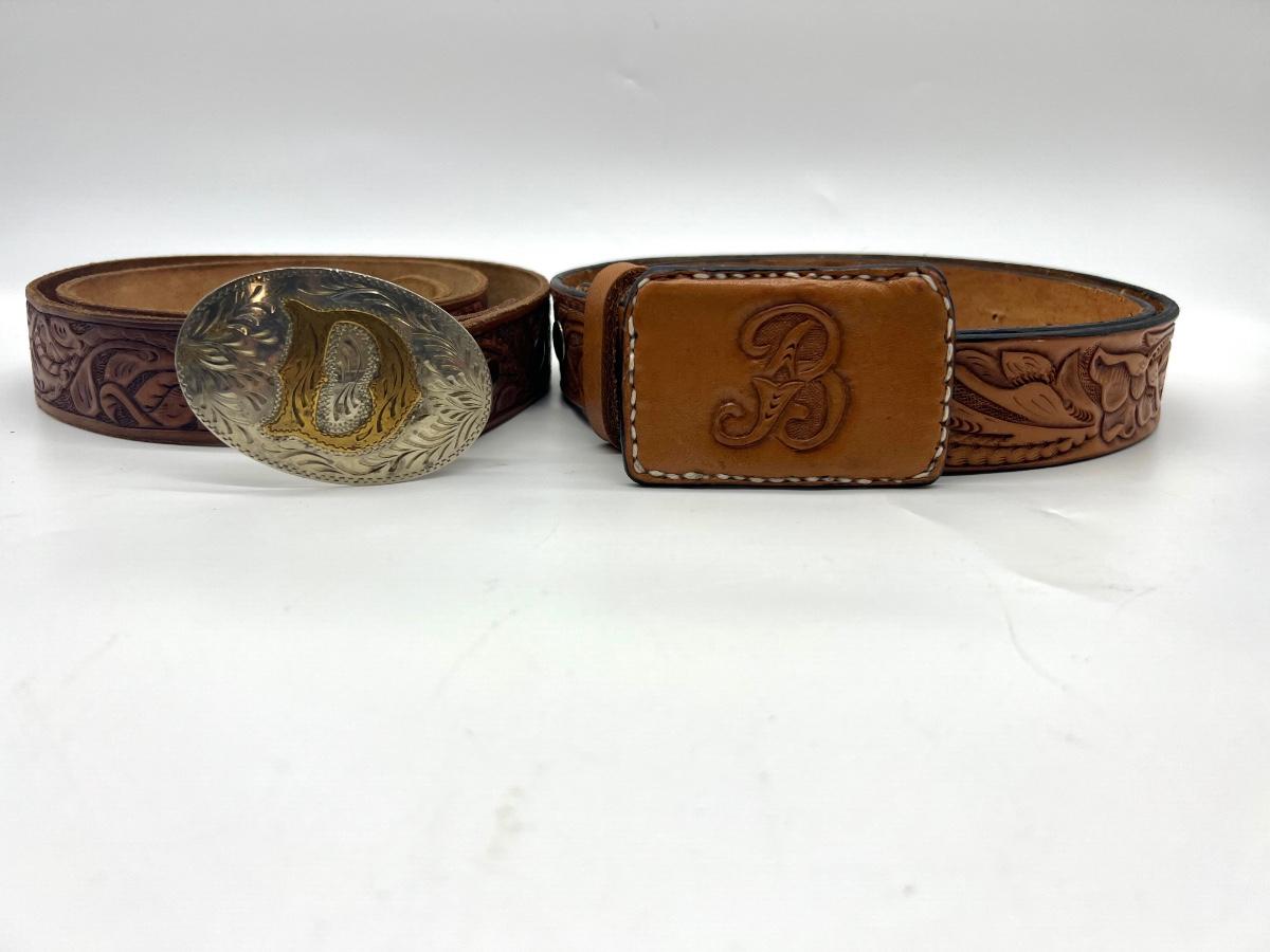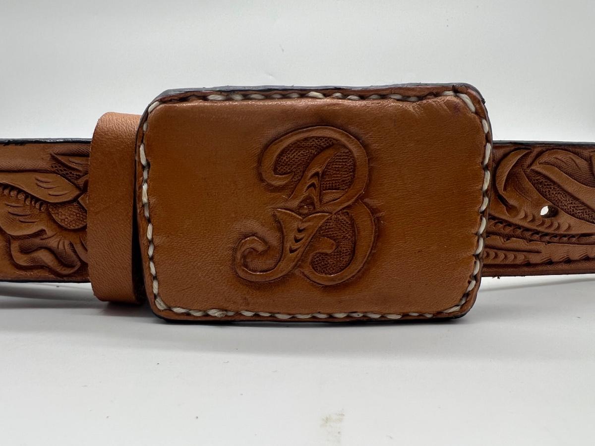Leather buckle with letter B measures 3 1/2" × 2 1/2" rectangle, belt is 48" long.