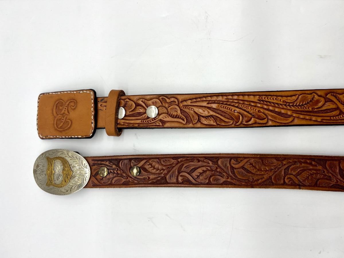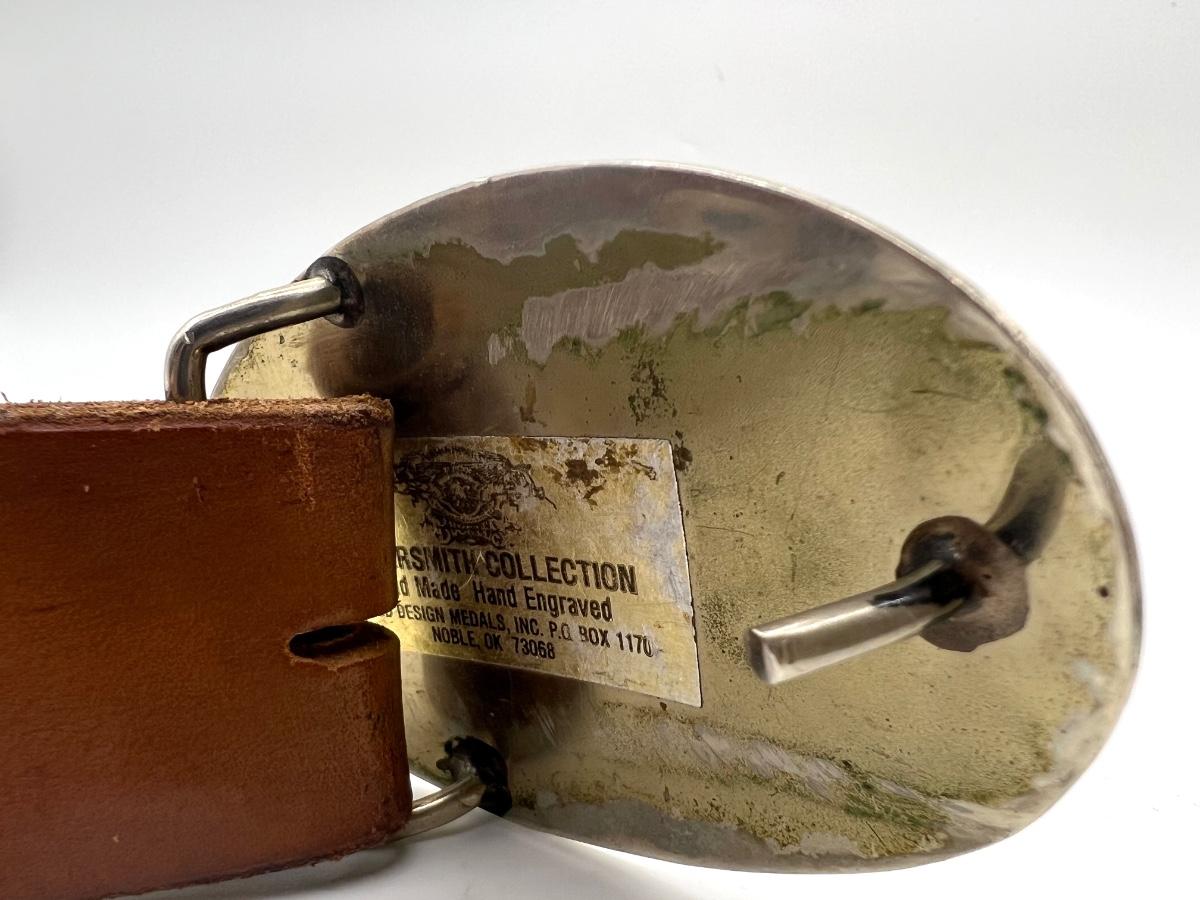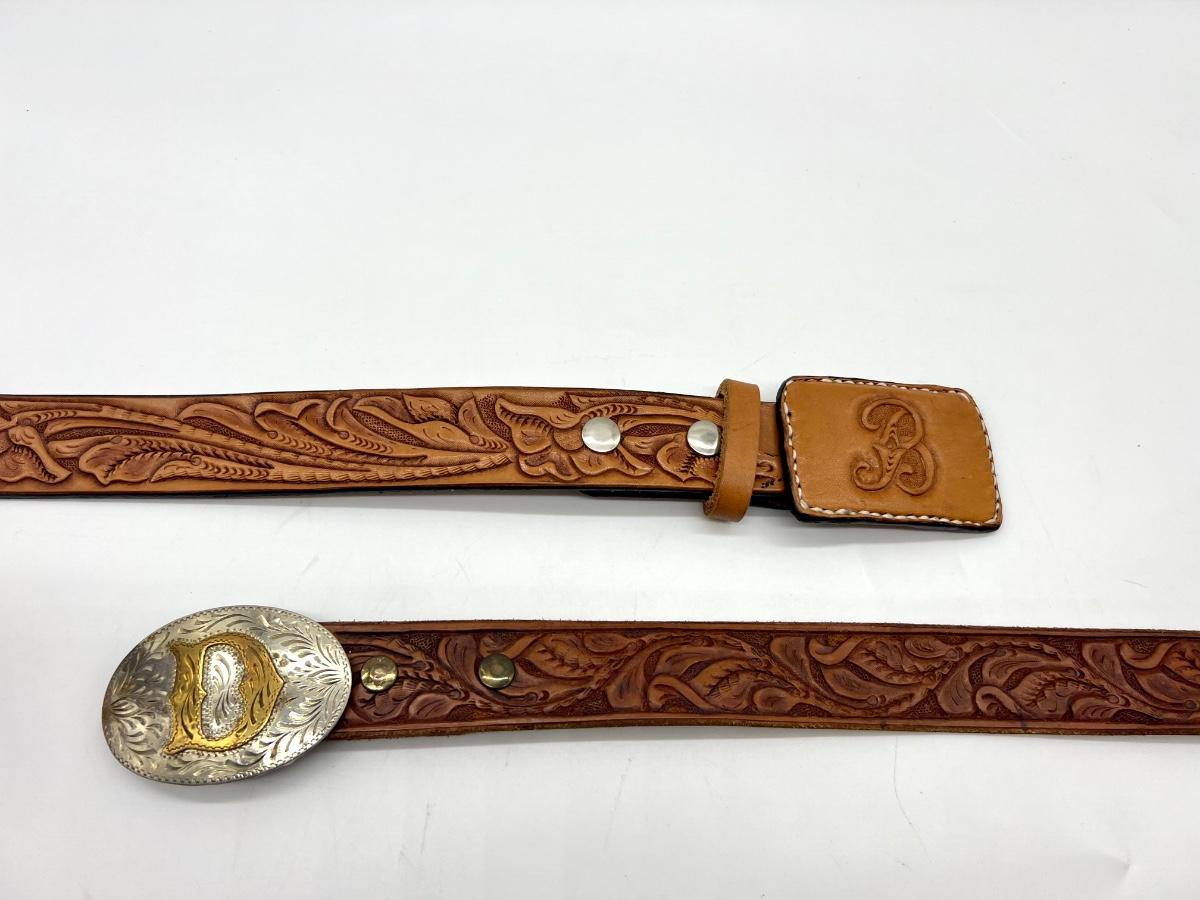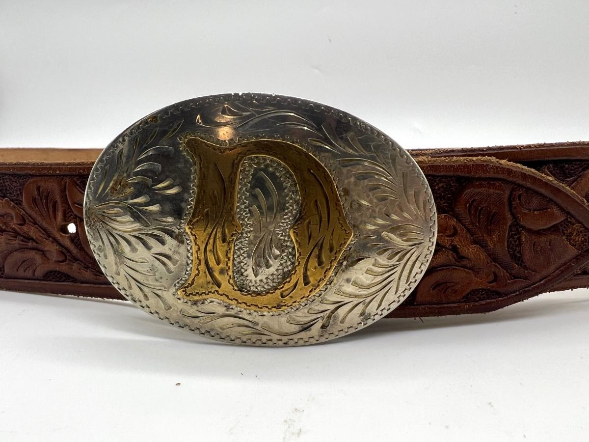 Silversmith Collection Metal buckle letter D measures 3 1/2" oblong, leather belt is 46" long.