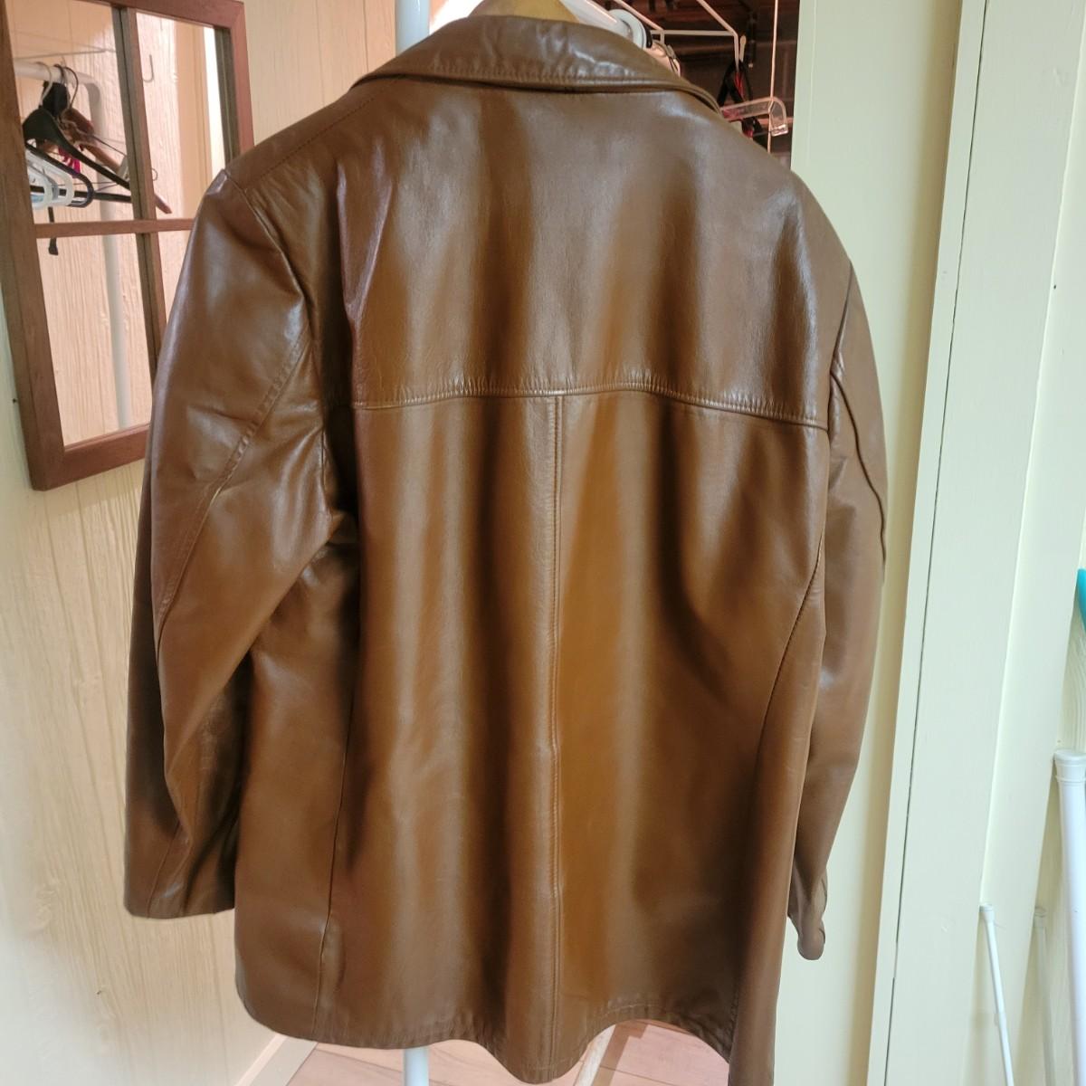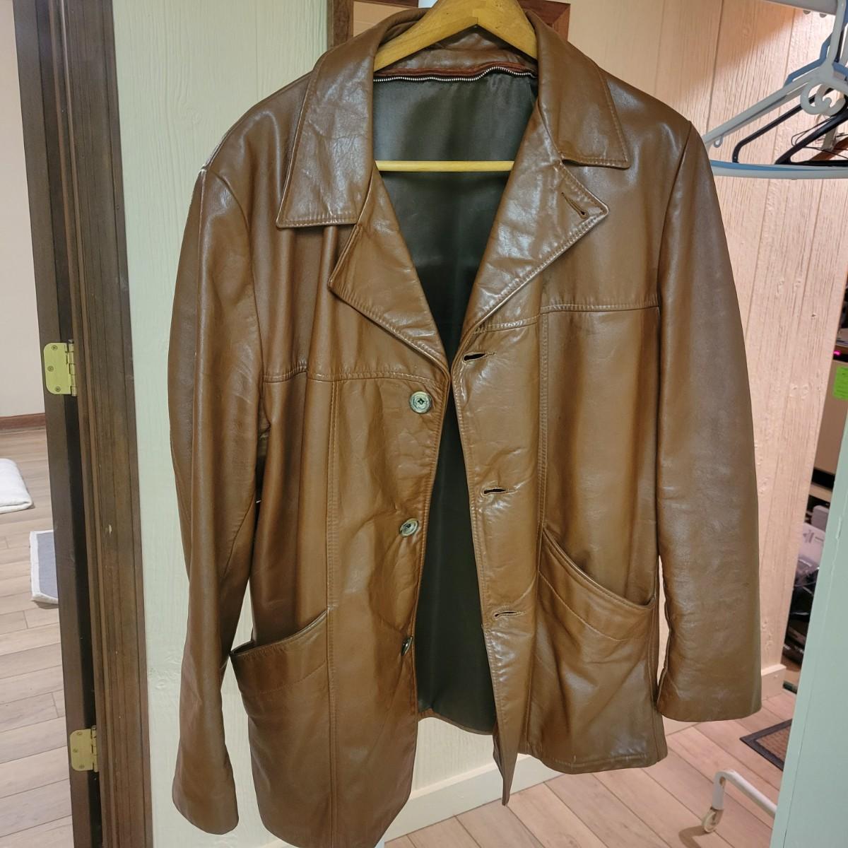A men's vintage brown leather jacket with no manufacturers name. It is a size 44D. Shipping available