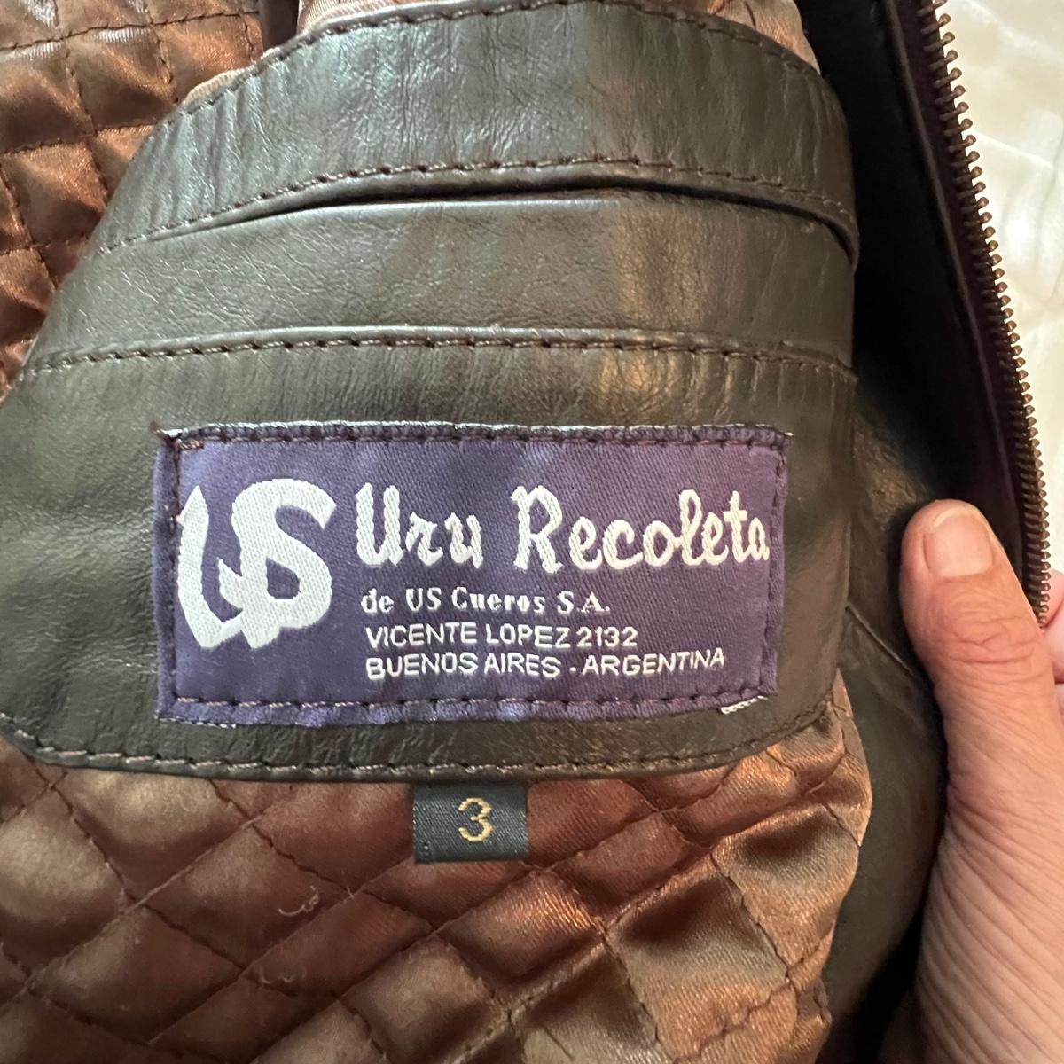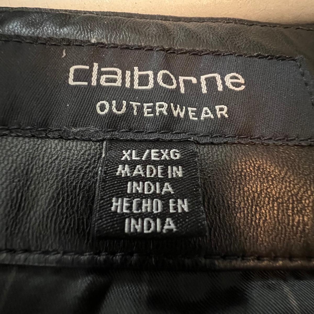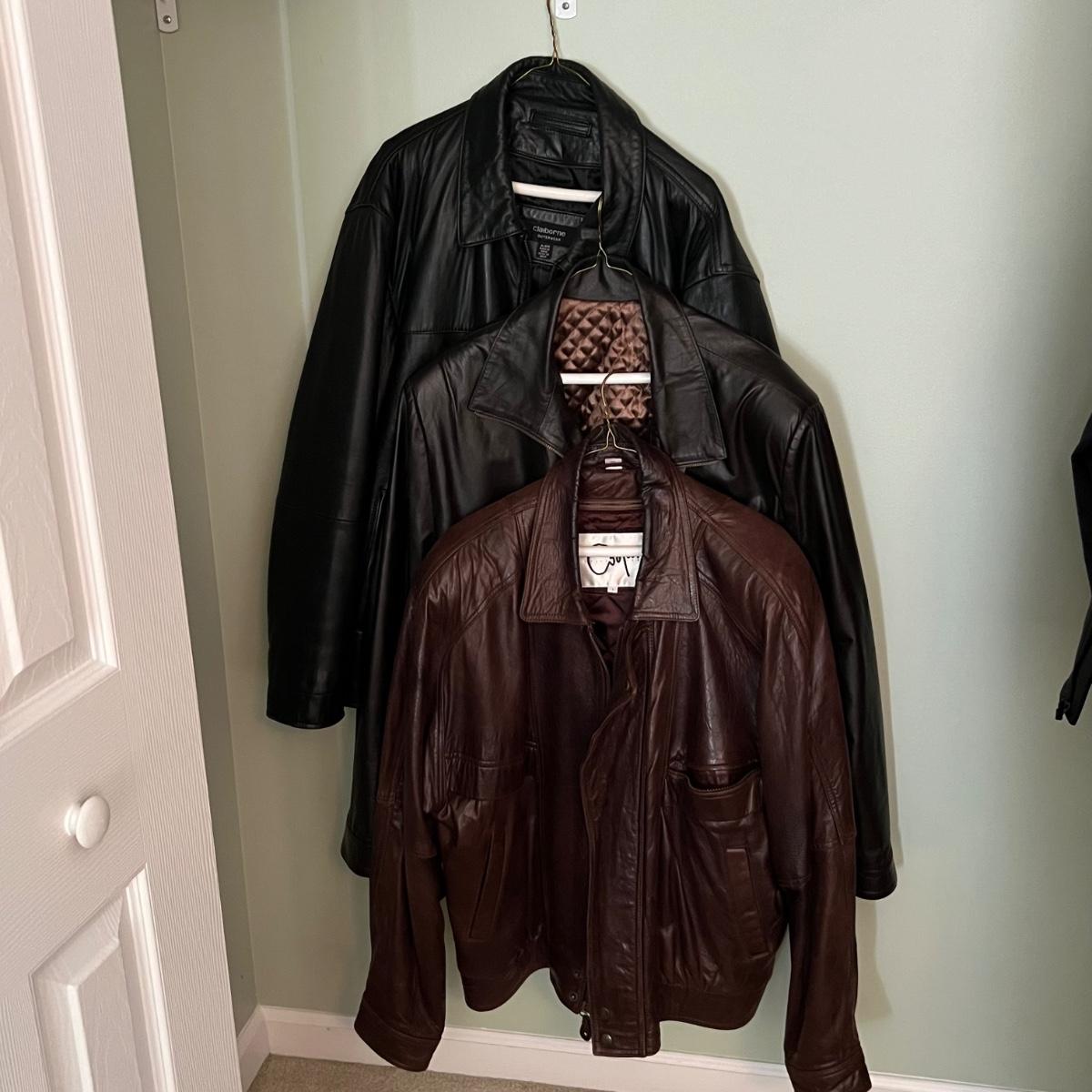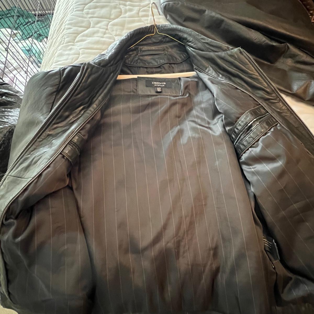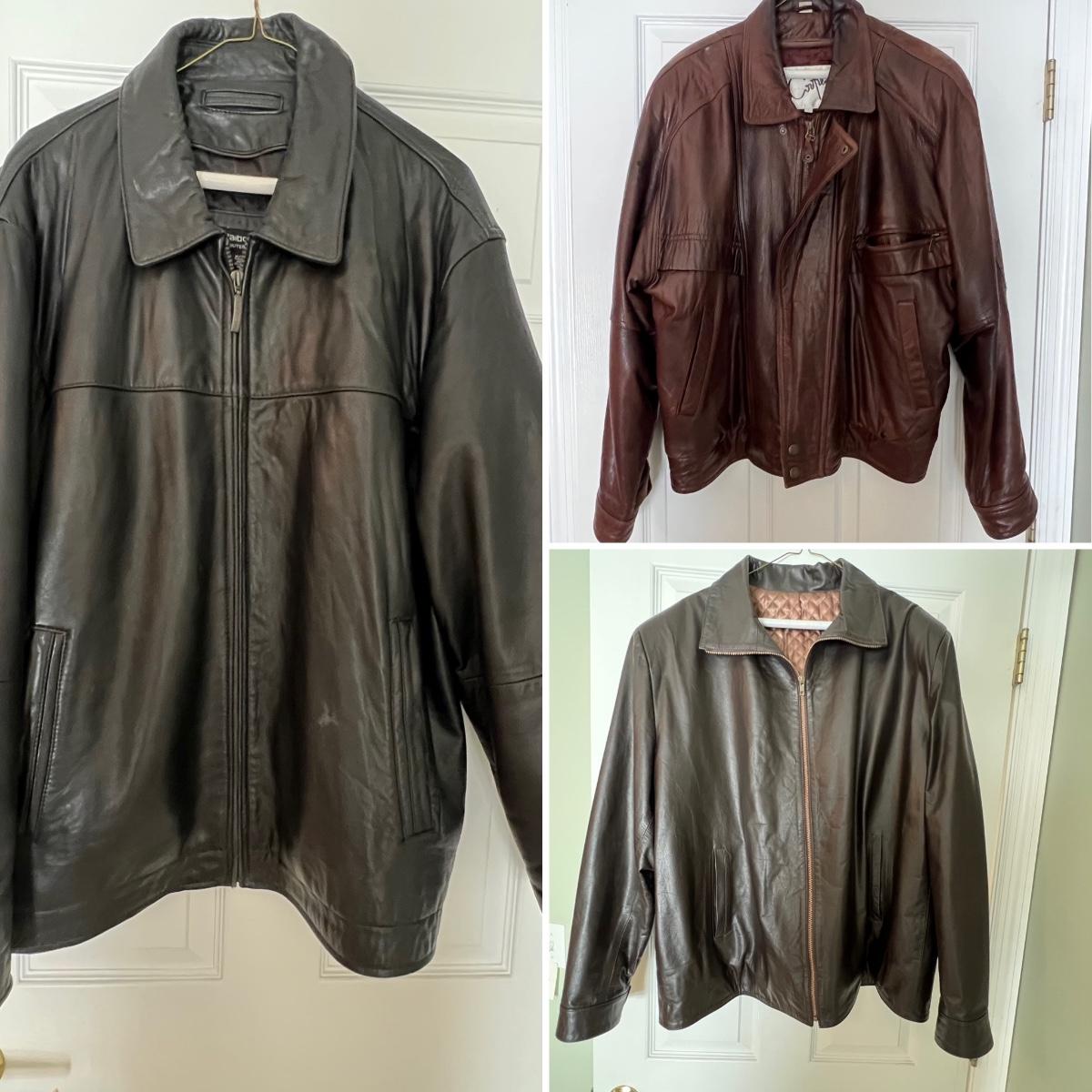 Three leather jackets. The Uru Recoleta is size 3 which is a U.S. large, it is black with a zipper and a quilted brown lining. The brown leather bomber style jacket has a removable quilted lining. The Claiborne black jacket is XL. All three are labeled leather.