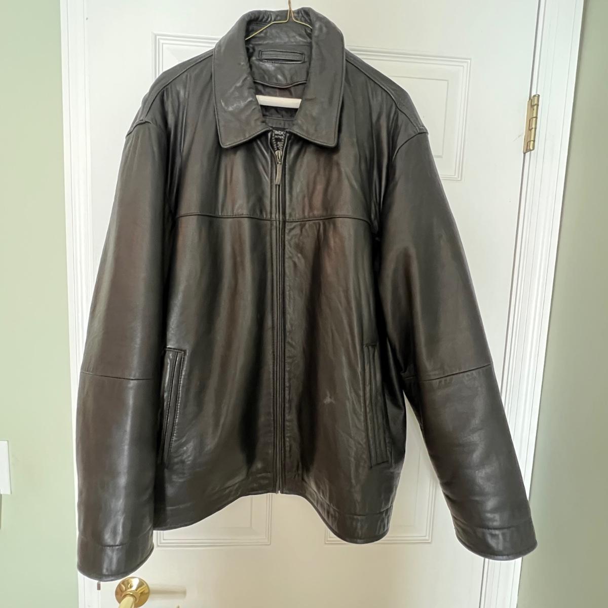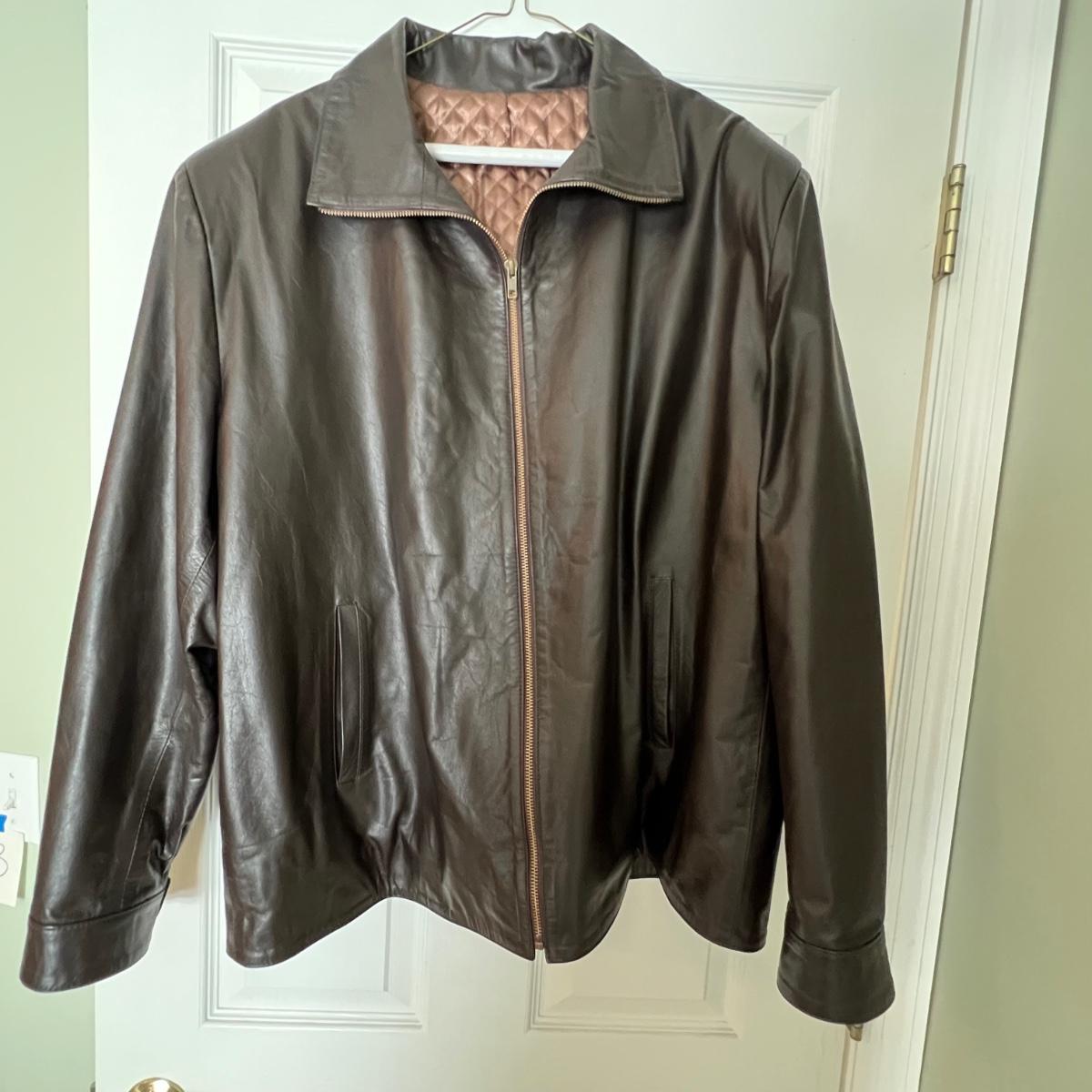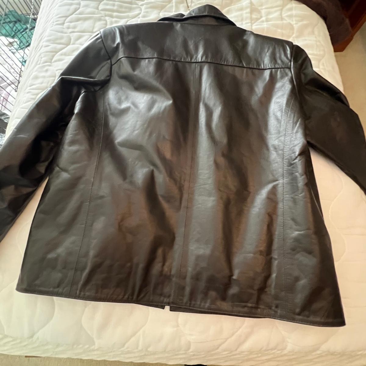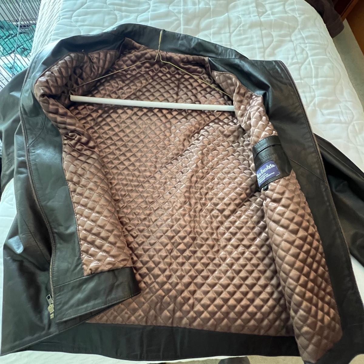 Three leather jackets. The Uru Recoleta is size 3 which is a U.S. large, it is black with a zipper and a quilted brown lining. The brown leather bomber style jacket has a removable quilted lining. The Claiborne black jacket is XL. All three are labeled leather.