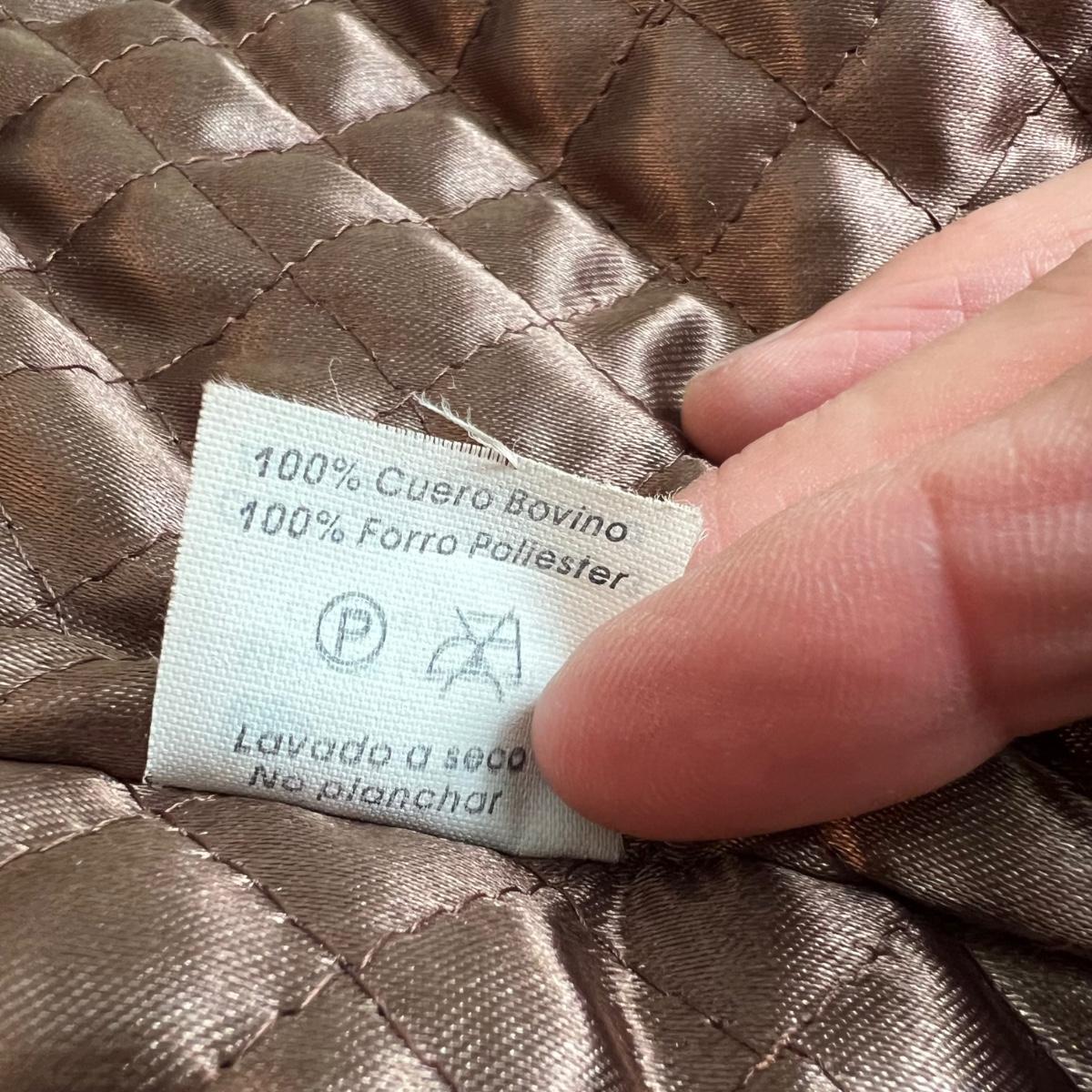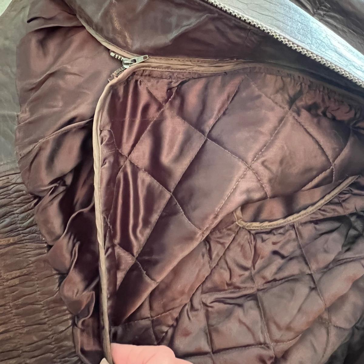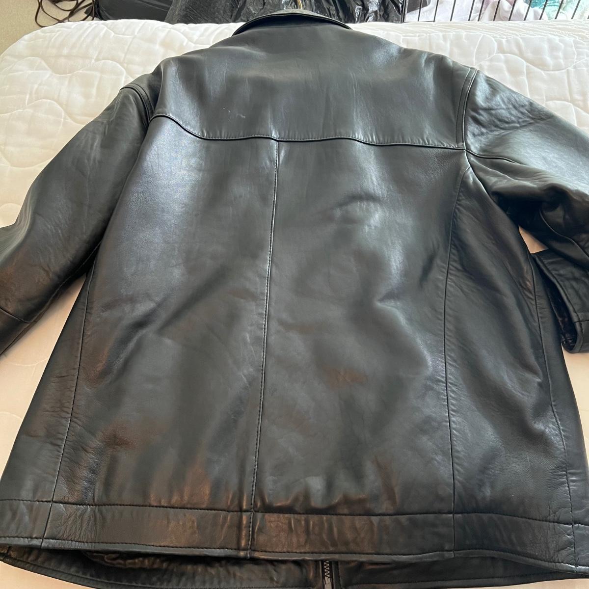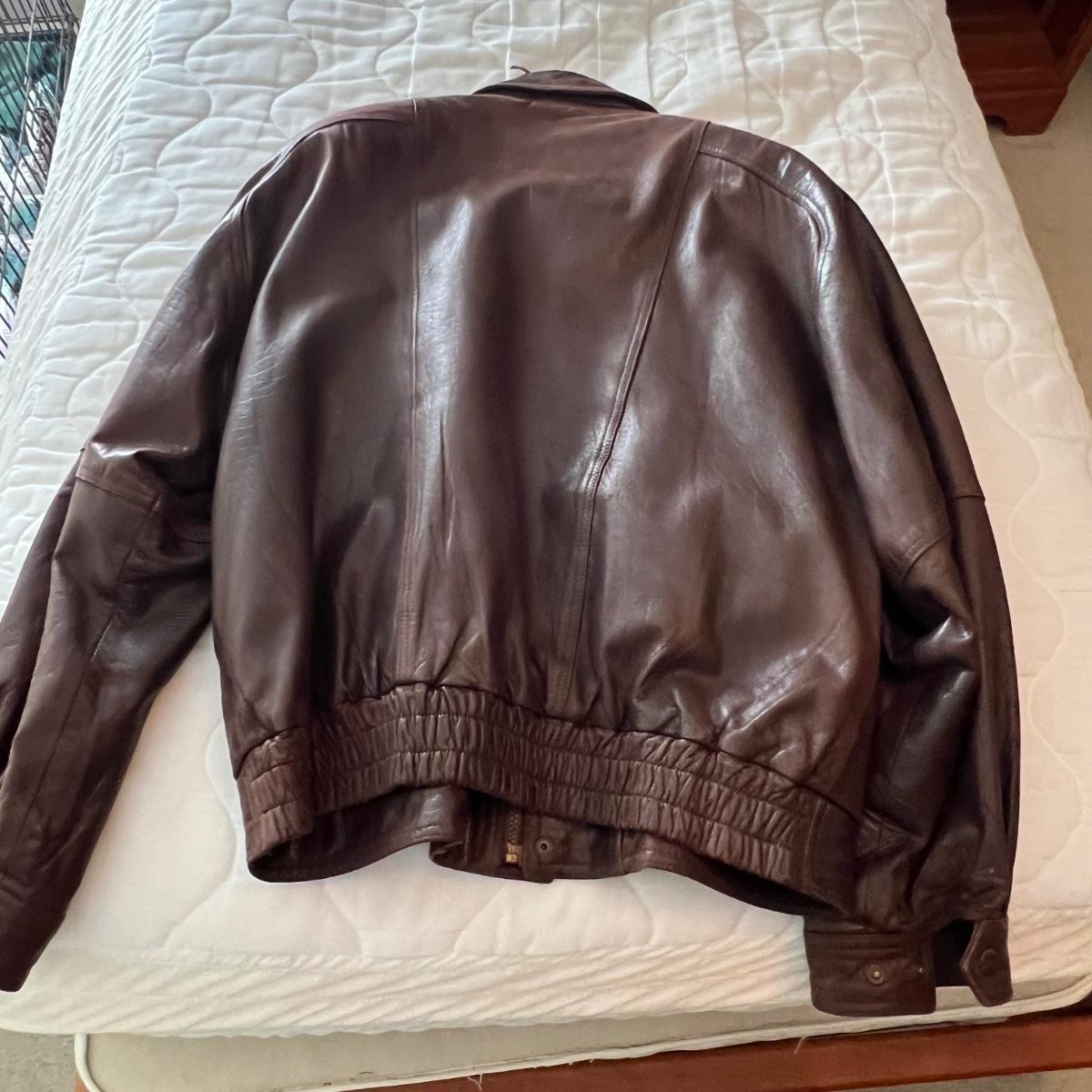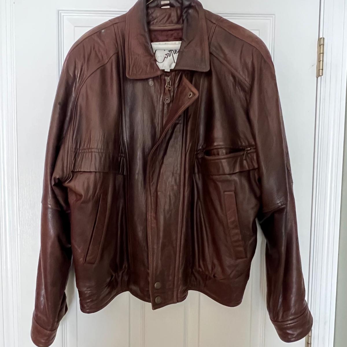 Three leather jackets. The Uru Recoleta is size 3 which is a U.S. large, it is black with a zipper and a quilted brown lining. The brown leather bomber style jacket has a removable quilted lining. The Claiborne black jacket is XL. All three are labeled leather.