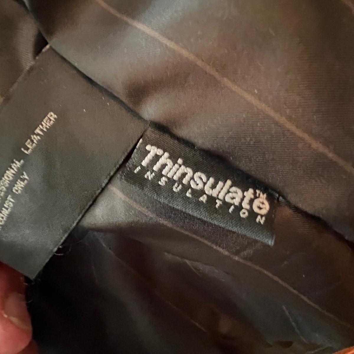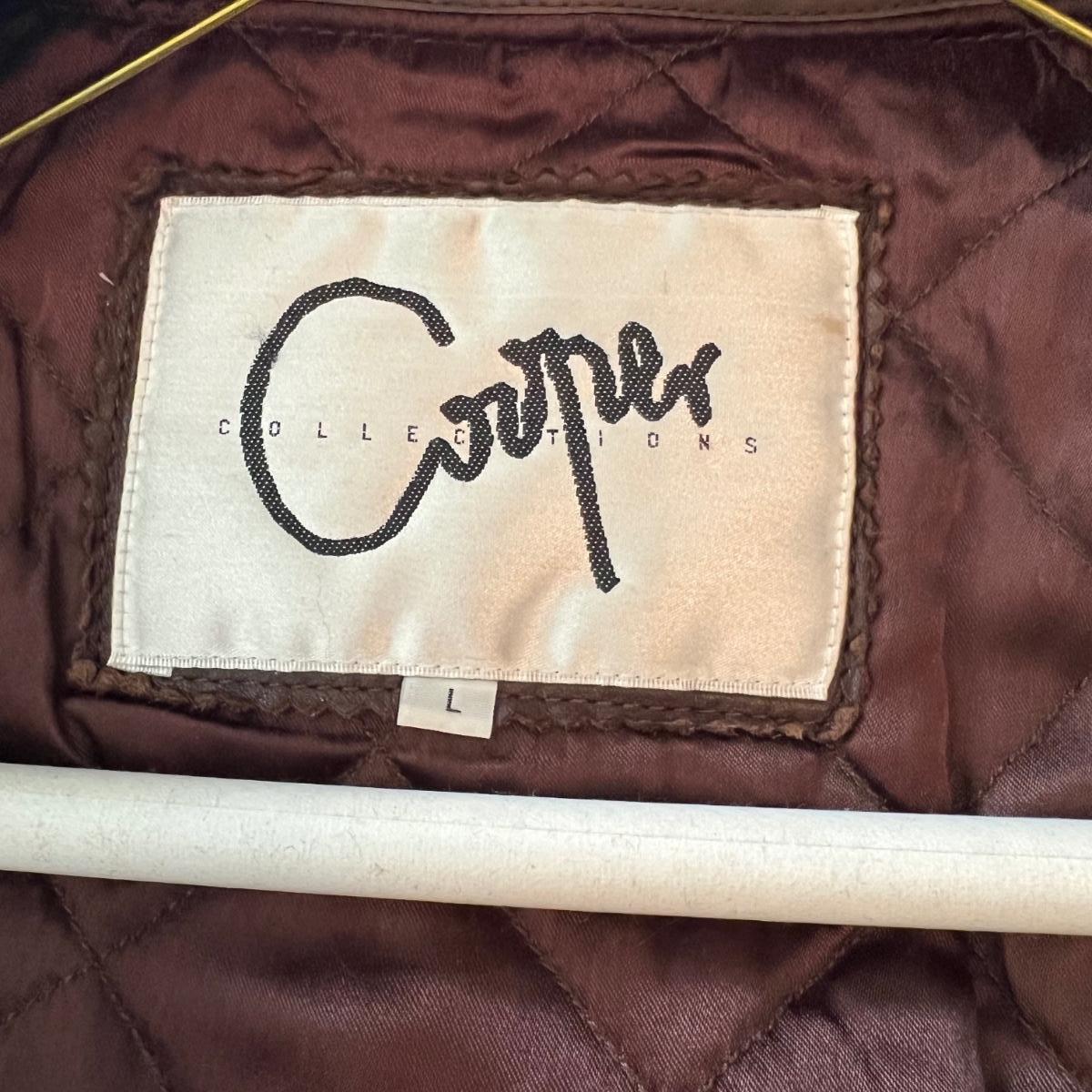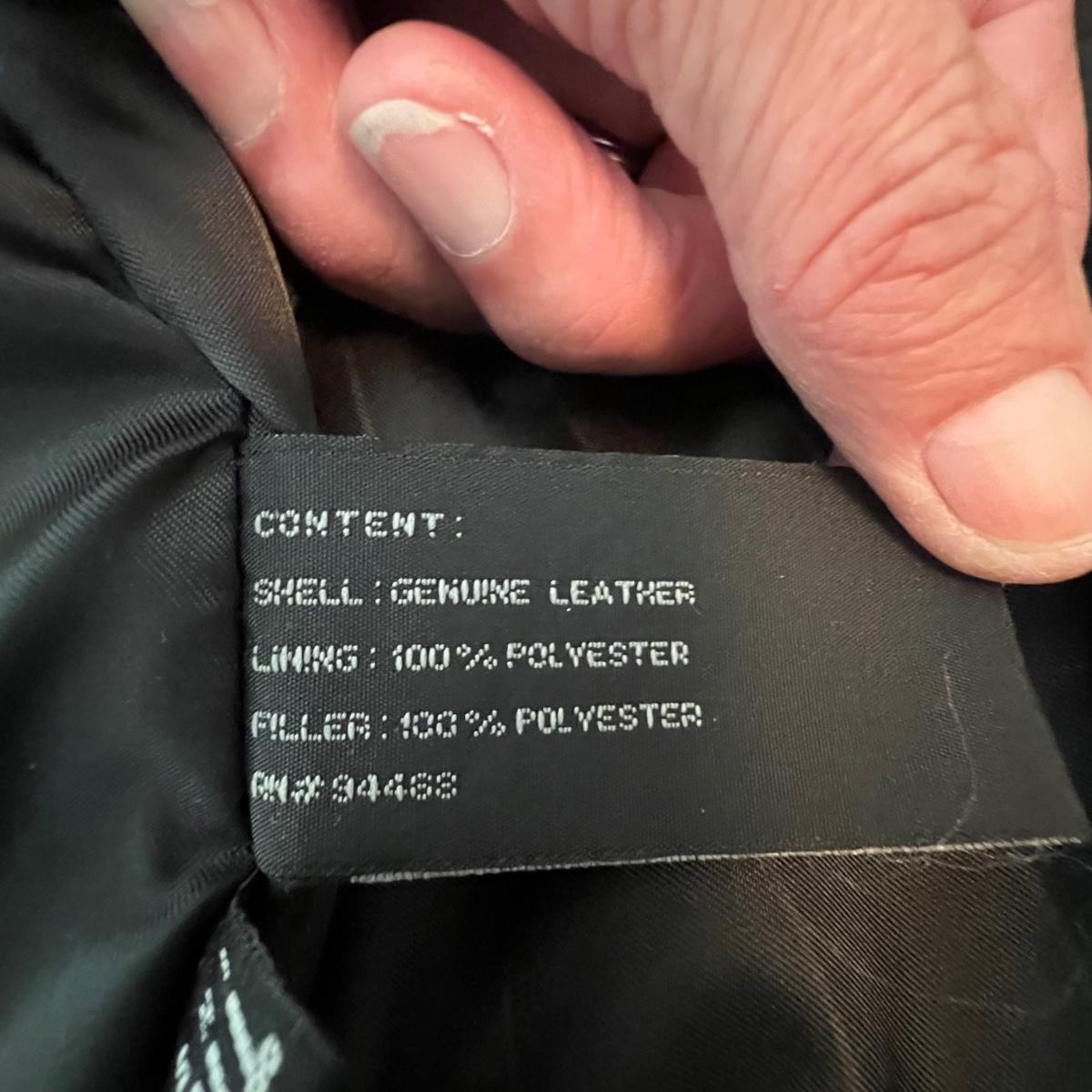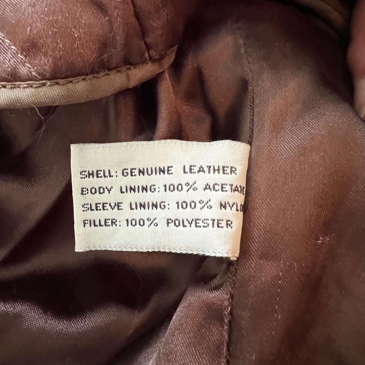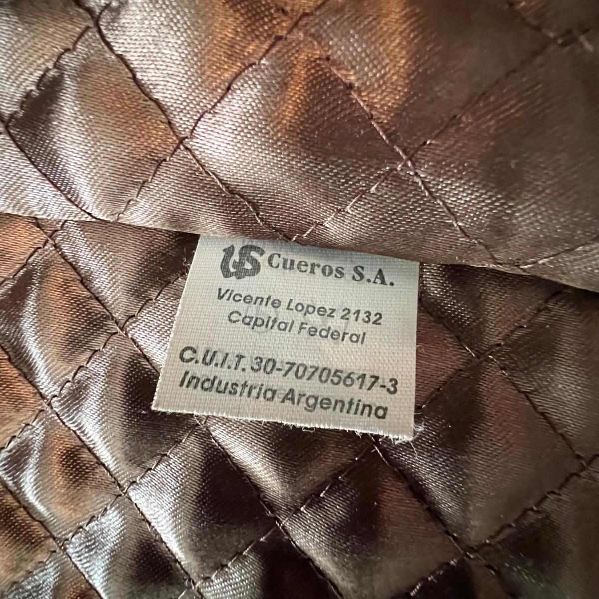 Three leather jackets. The Uru Recoleta is size 3 which is a U.S. large, it is black with a zipper and a quilted brown lining. The brown leather bomber style jacket has a removable quilted lining. The Claiborne black jacket is XL. All three are labeled leather.