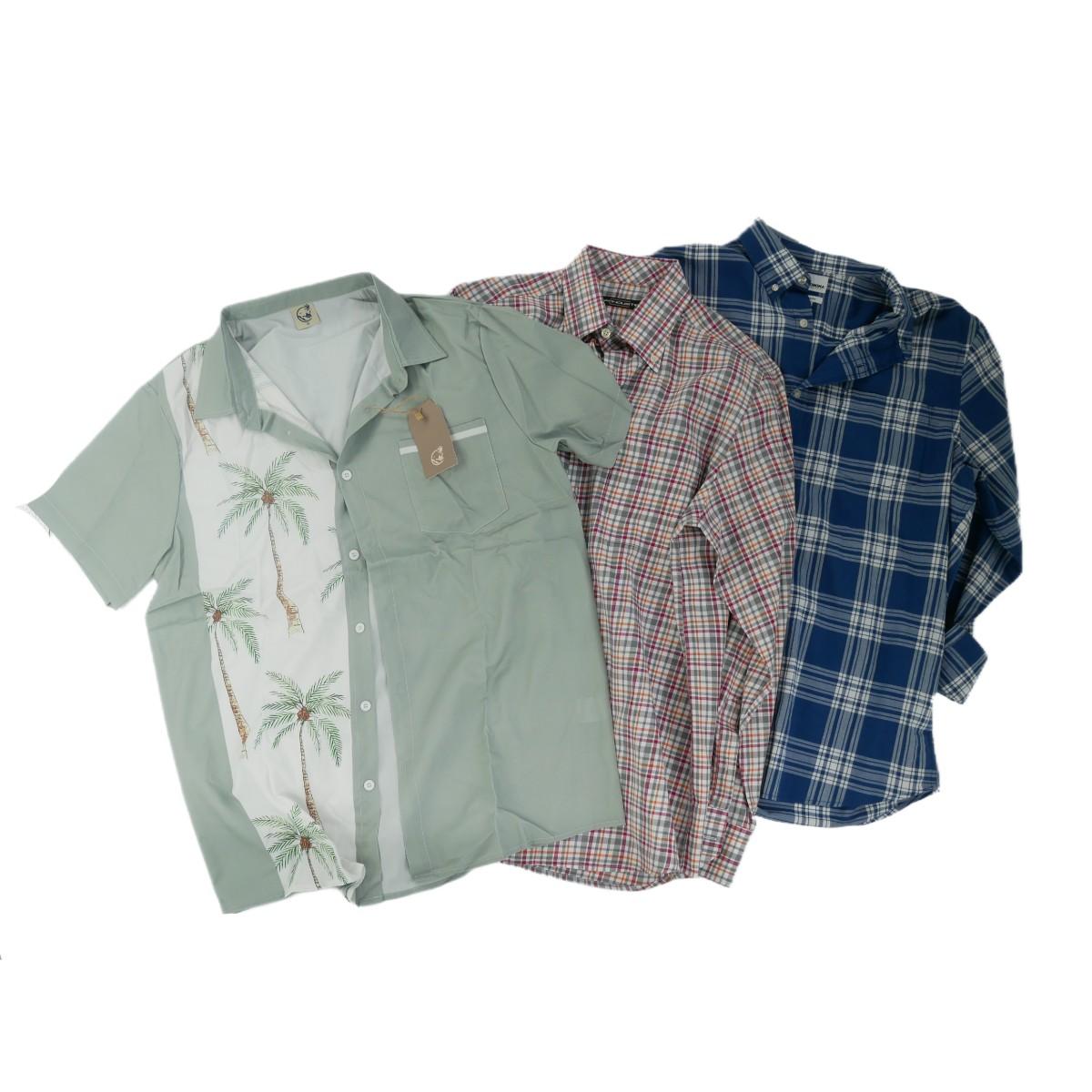 Three button down men's shirts size medium. Blue plaid Sonoma, multicolored Carnoustie, and new with tags palm tree Hawaiian shirt