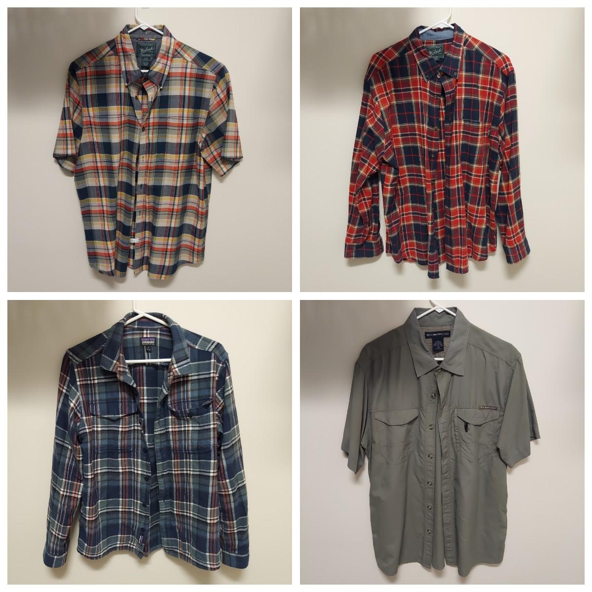 Lot of 15+ plaid button down shirts in sizes medium and large. Brands include Woolrich, Patagonia, L.L. Bean, ExOfficio and more. Please see photos for details. Not all items are shown individually. Please schedule a preview appointment if you are interested in seeing each piece.