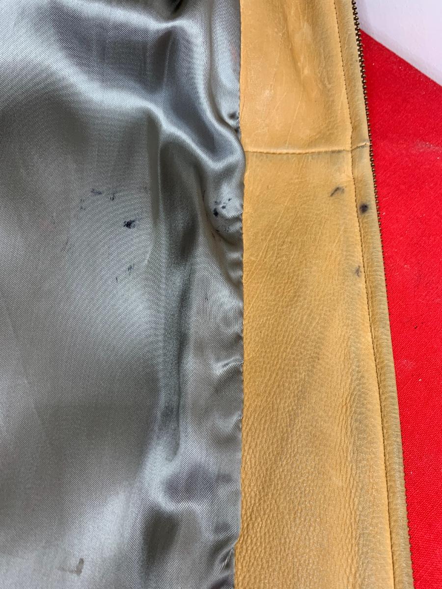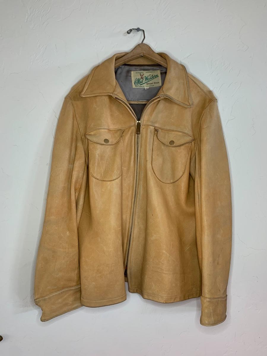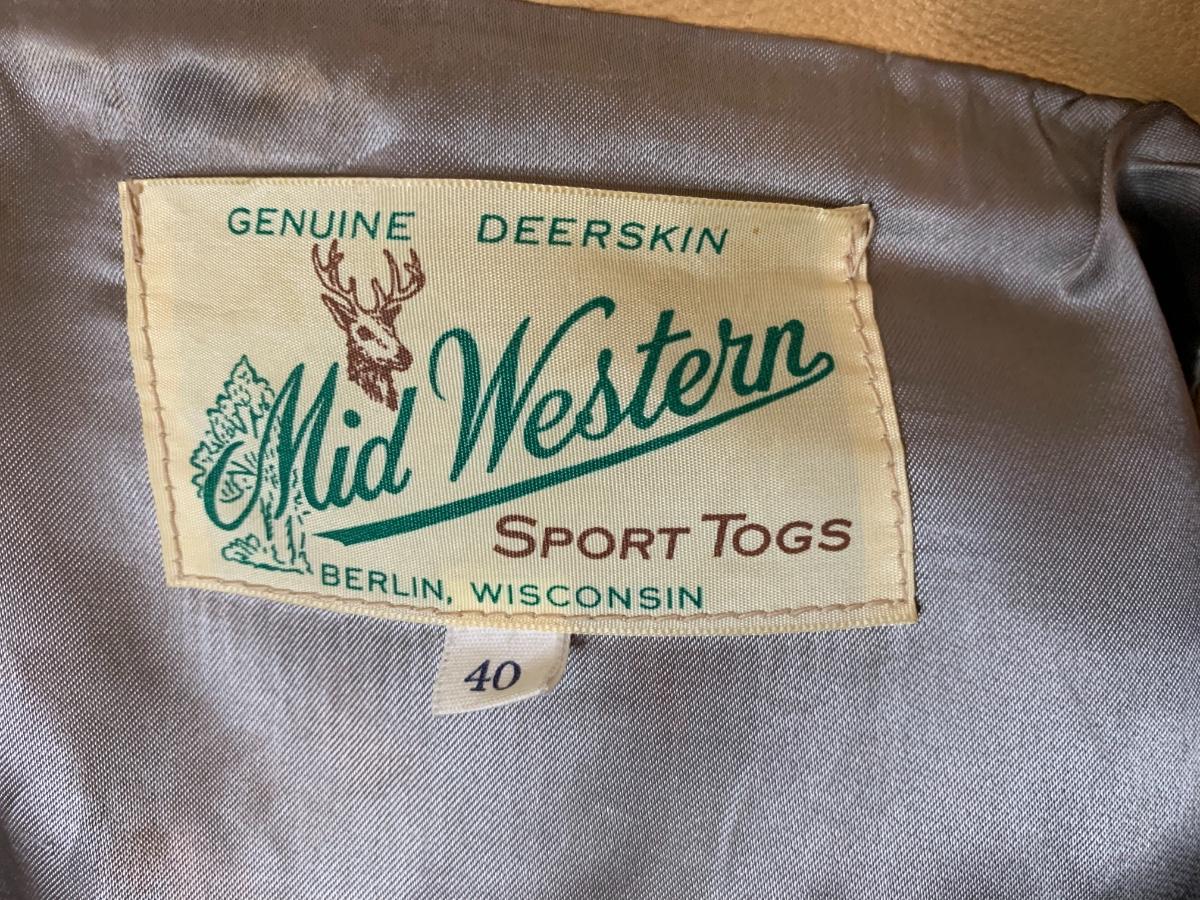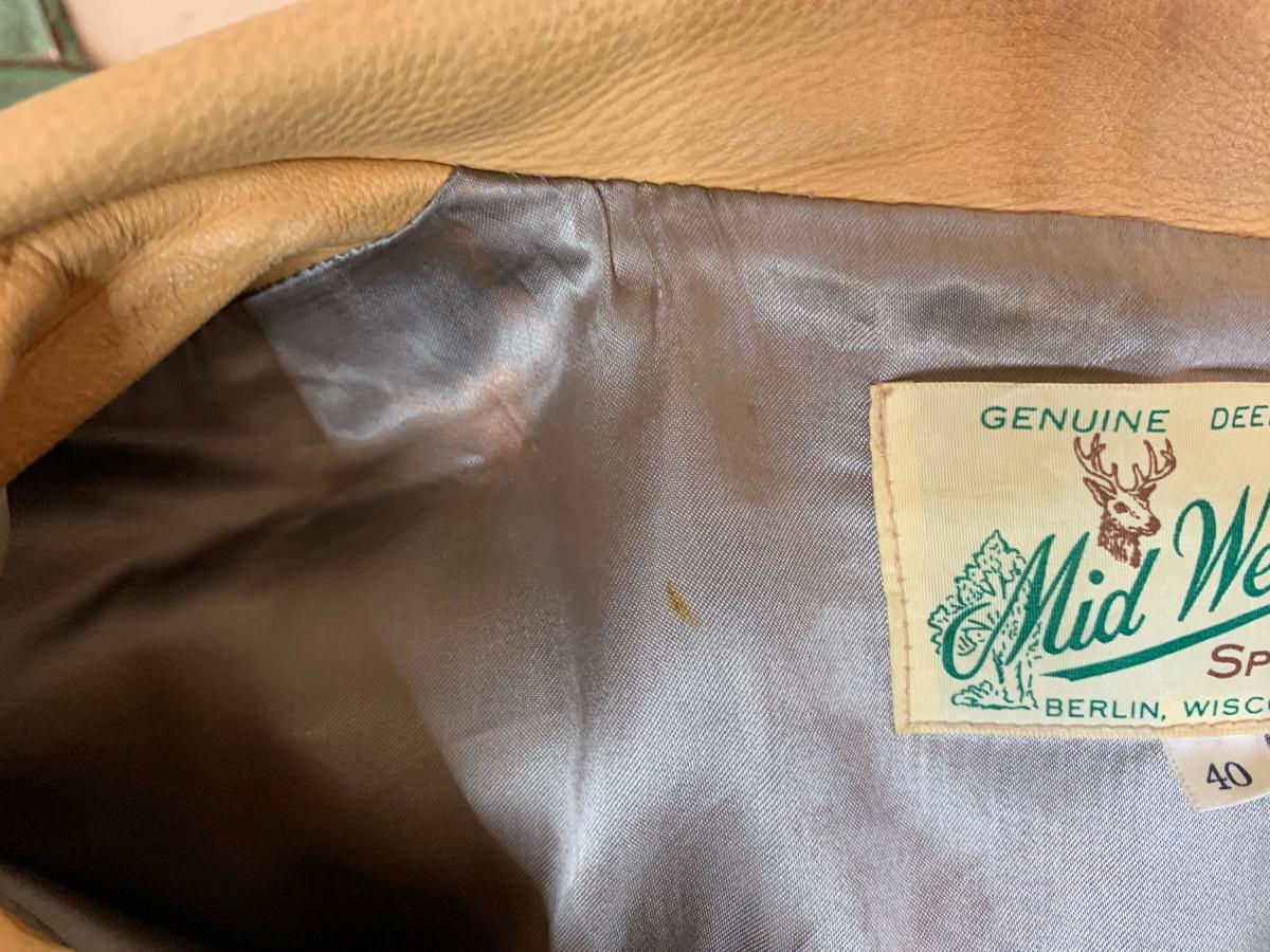 Men's Midwestern Sports Togs Coat from Berlin, Wisconsin. Size 40. Genuine Deer Skin with grey satin lining vintage piece with normal wear but still sturdy and in good condition. With a metal zipper, snap pockets on both breasts and cuffs. Some light stains and scuffs on the back, one small spot on the front and some staining on the wrists. Very soft and supple.