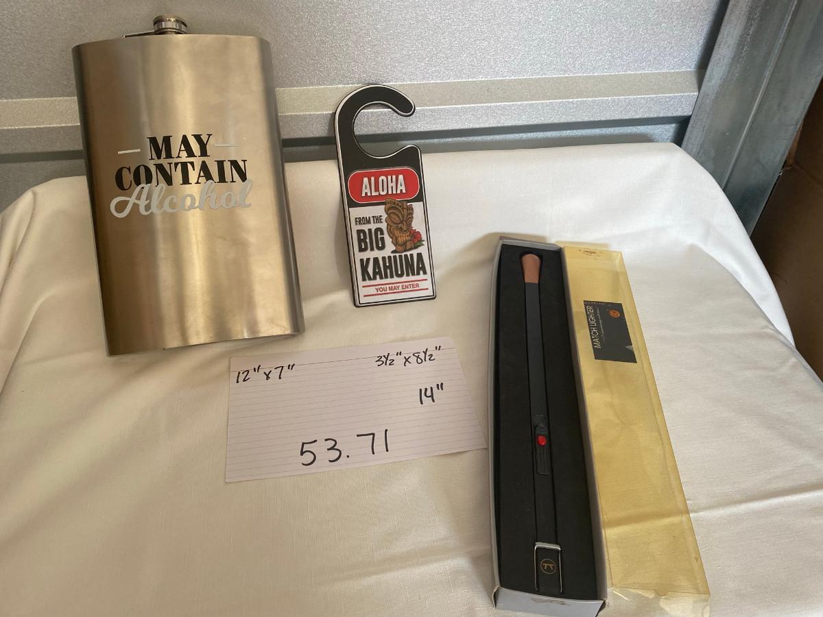 Flask H-12" x W-7", lighter H-14", door knob hanger 3.5" x 8.5"