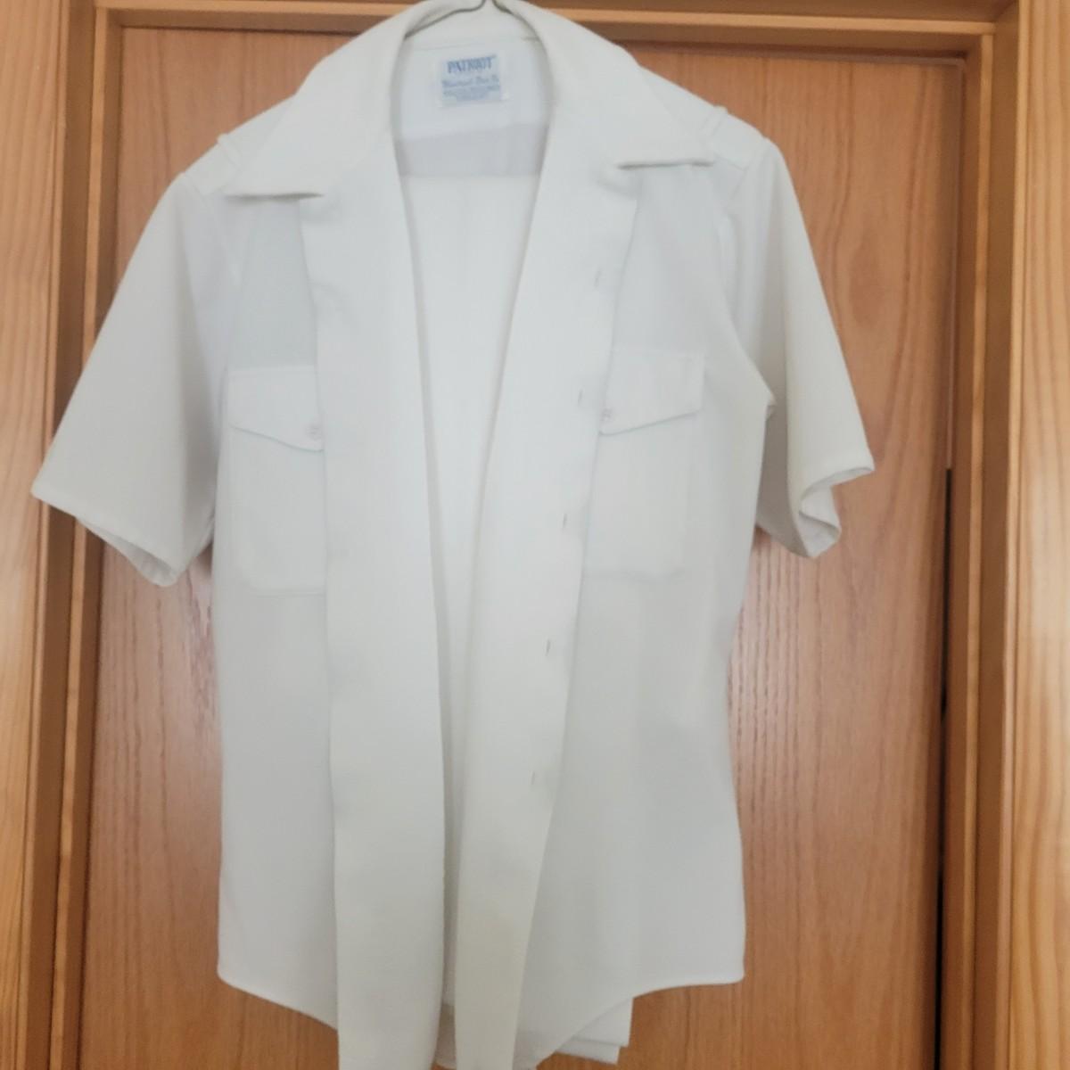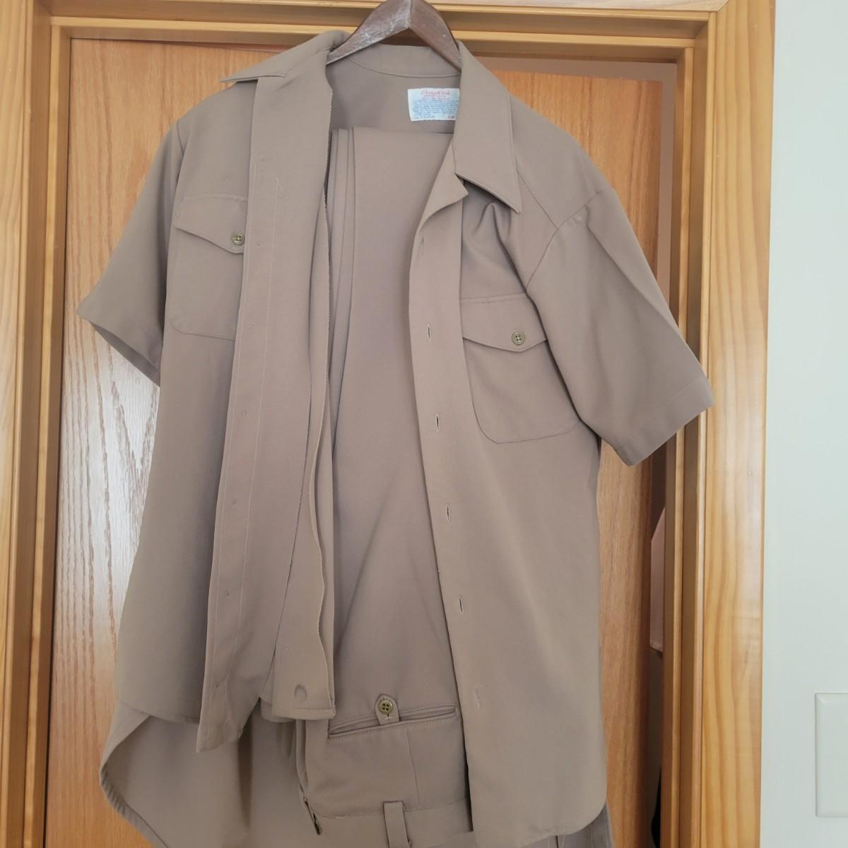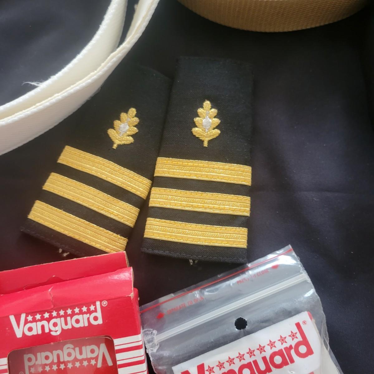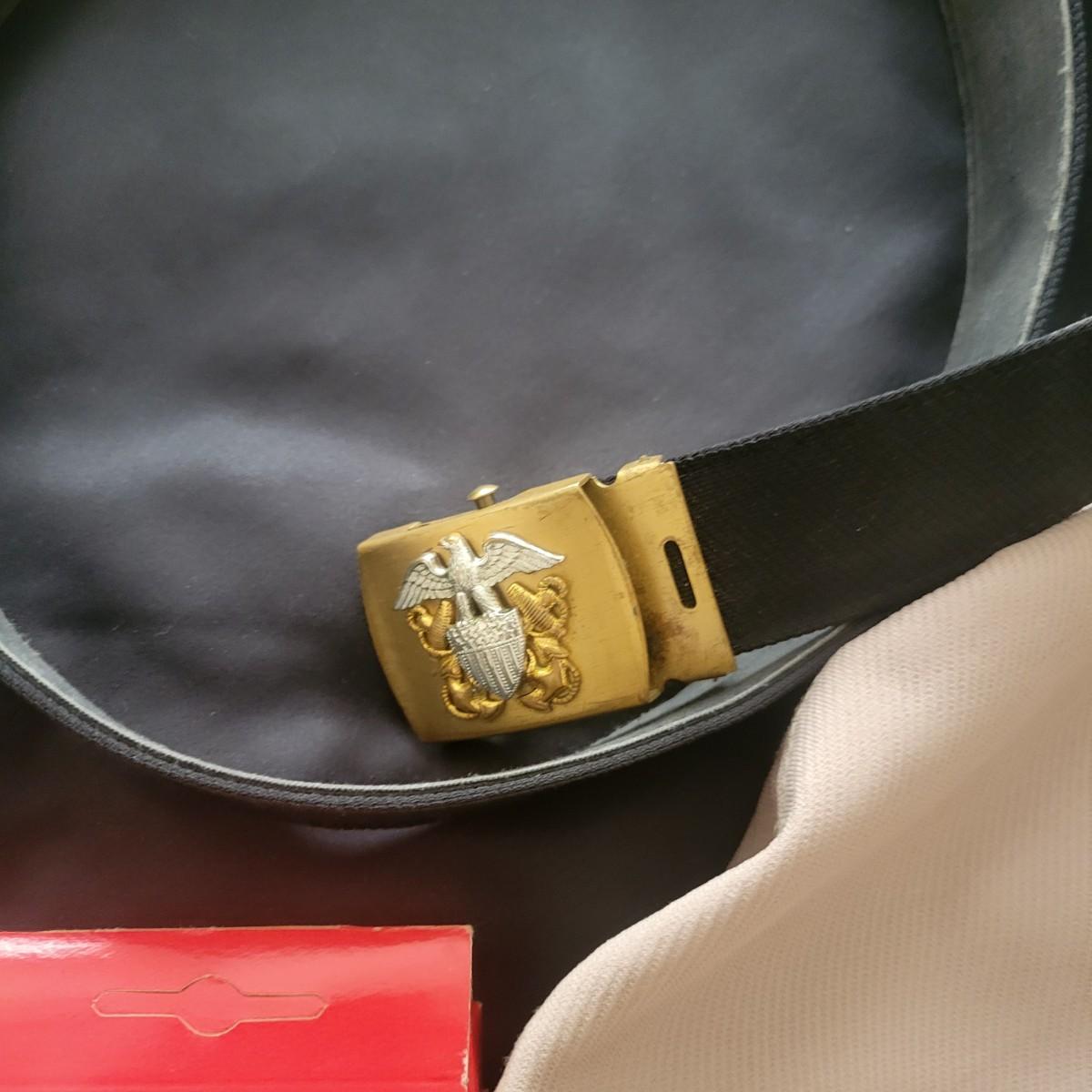 An assortment of men's navy uniforms. This lot includes whites, khakis and a deep blue uniform. They appear to be sized to 16-33 for shirts and 34 for pant waist size, but not all were labeled with size. The navy and white uniforms include a pair of pants each, and the khakis has two shirts and three pairs of pants including accessories. Shipping available