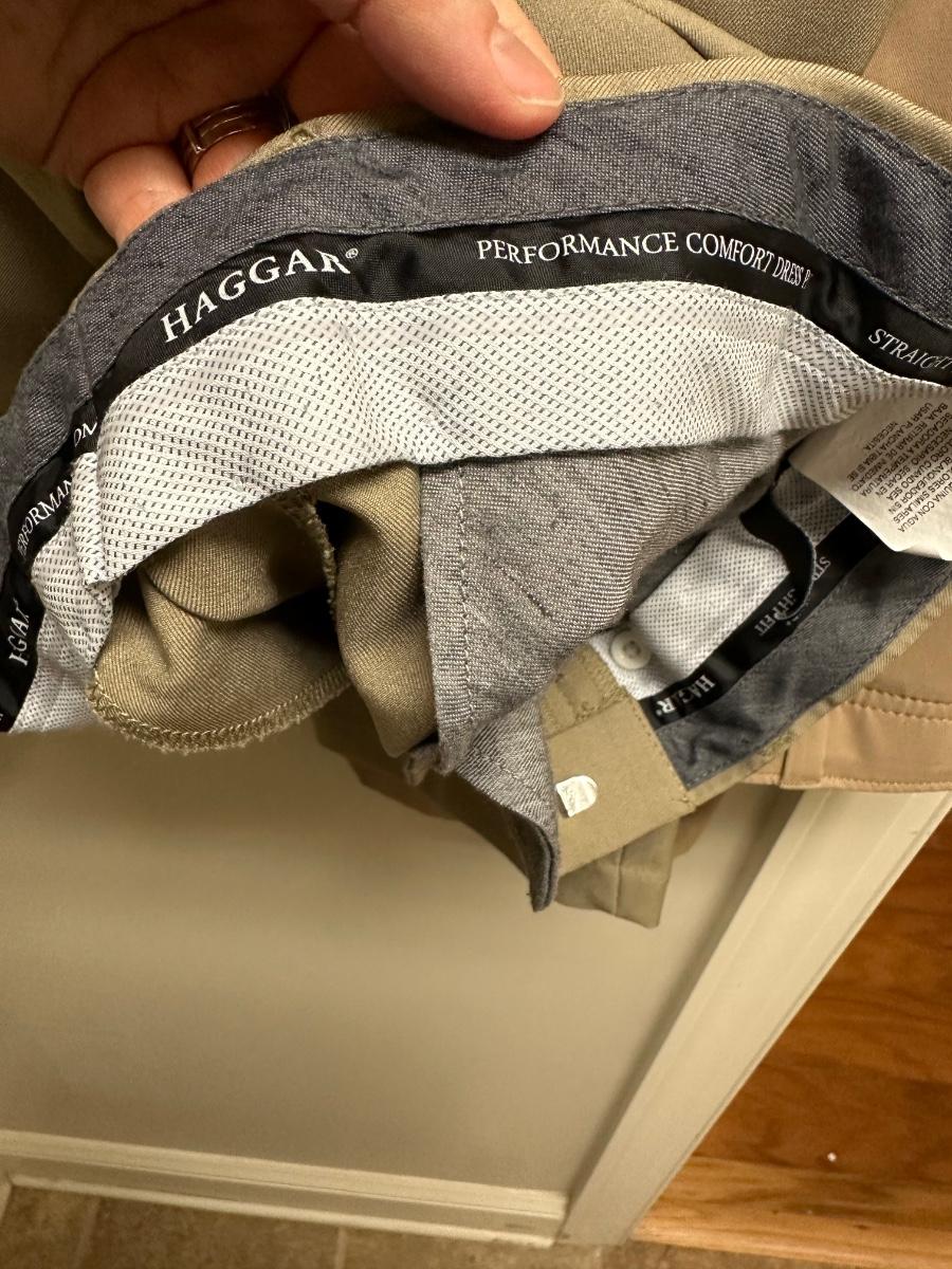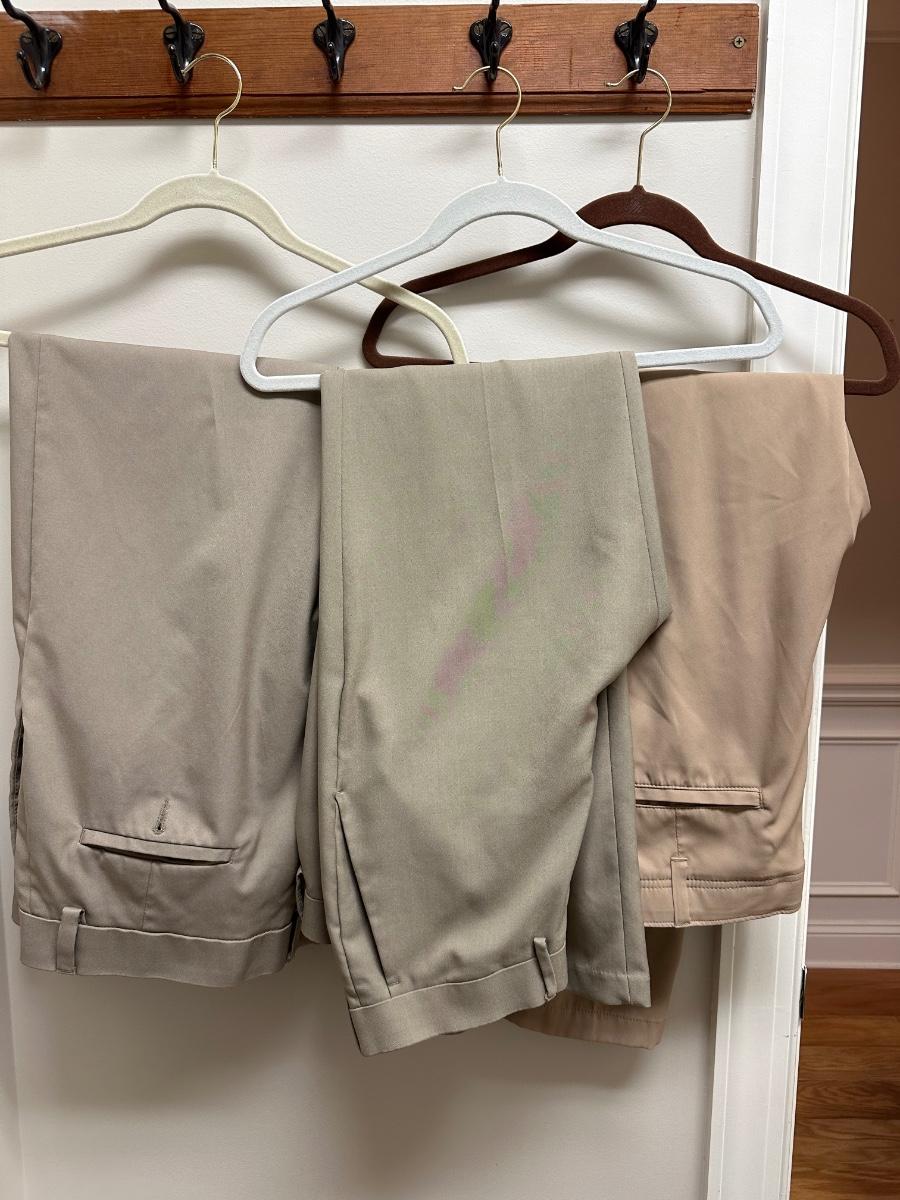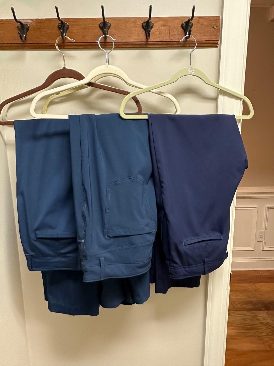 Vibrant, deep blues, khaki, black and grey. Including brands Pro Tour, Haggar, Greg Norman, BCG and Members / 12 long pants total — perfect for a day on the course or a day at the office!