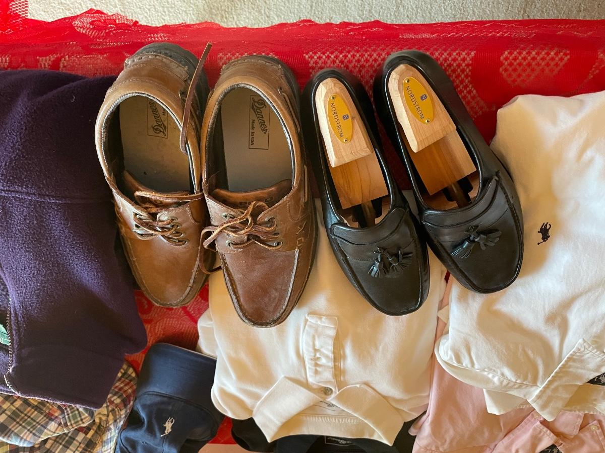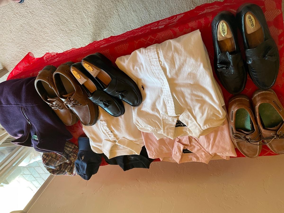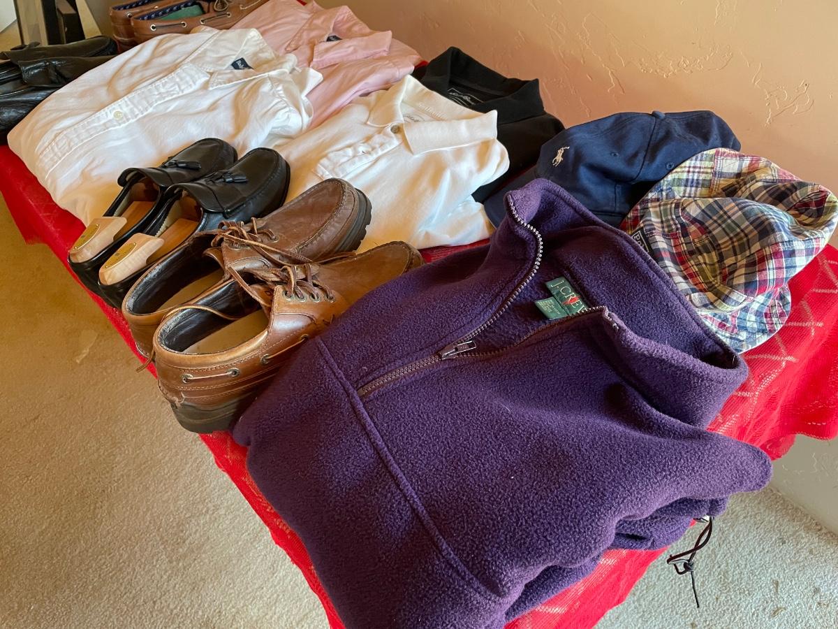 Men’s clothing including brands like Polo, Eddie Bauer and J Crew. Men’s M and L size. Shoes are men’s 8D size. All in good condition