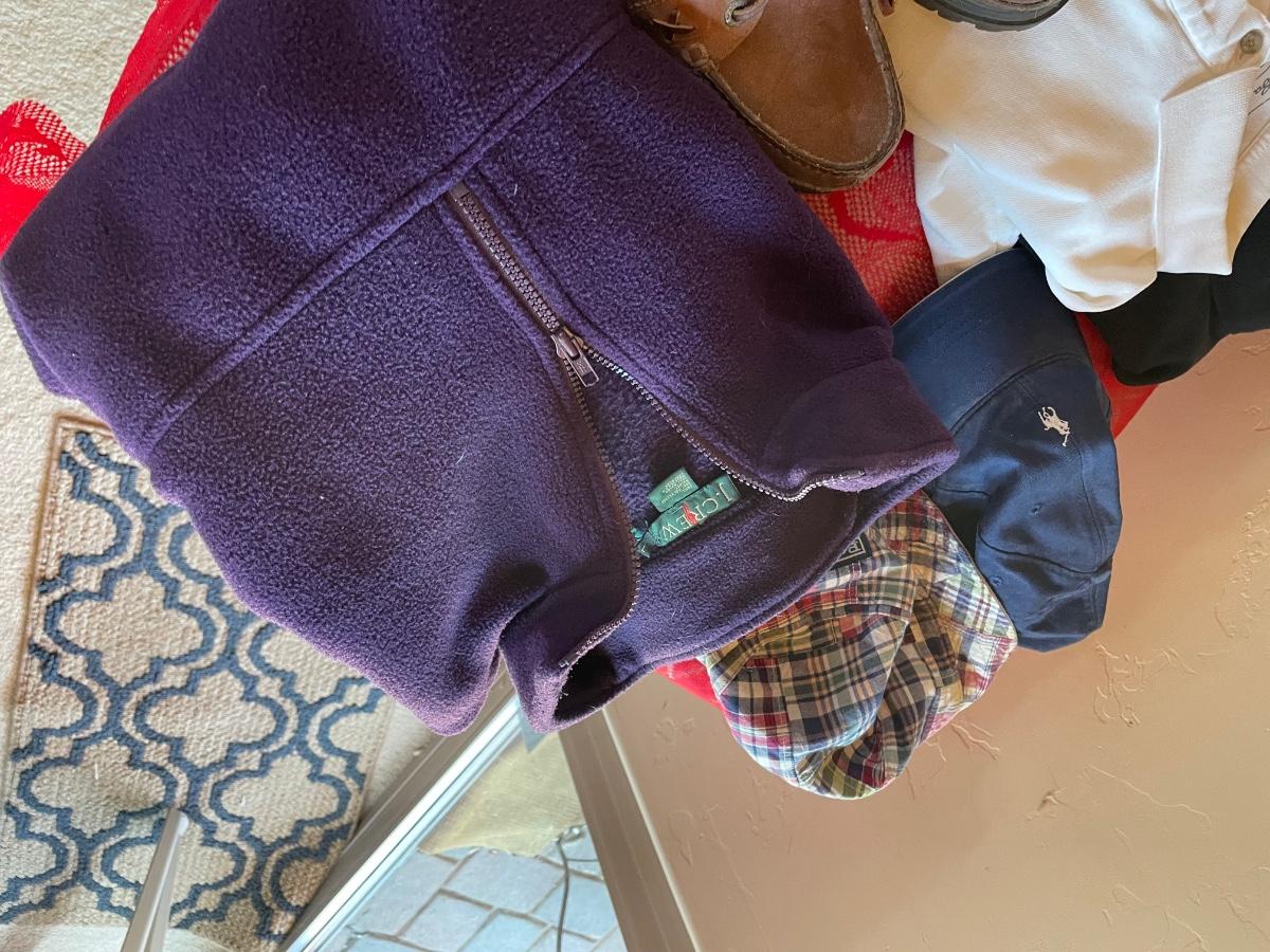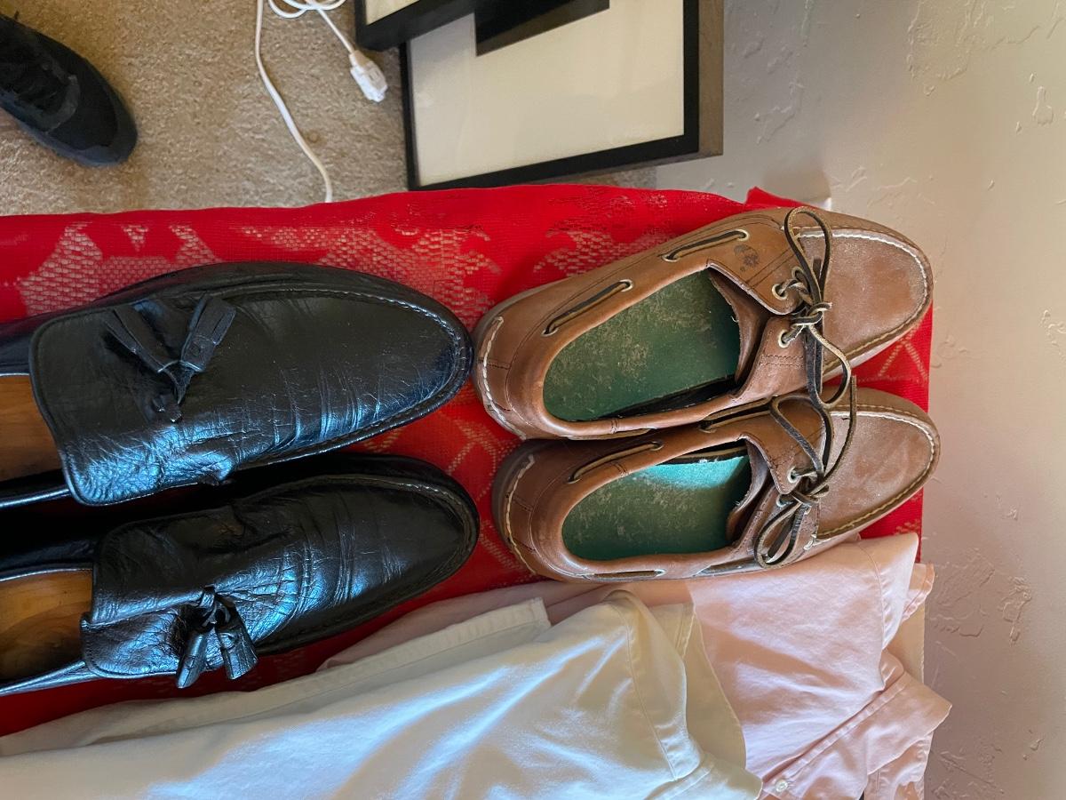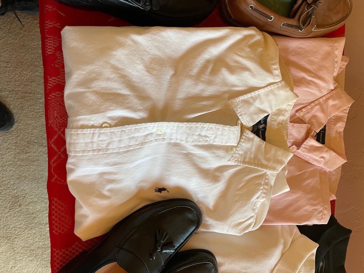 Men’s clothing including brands like Polo, Eddie Bauer and J Crew. Men’s M and L size. Shoes are men’s 8D size. All in good condition