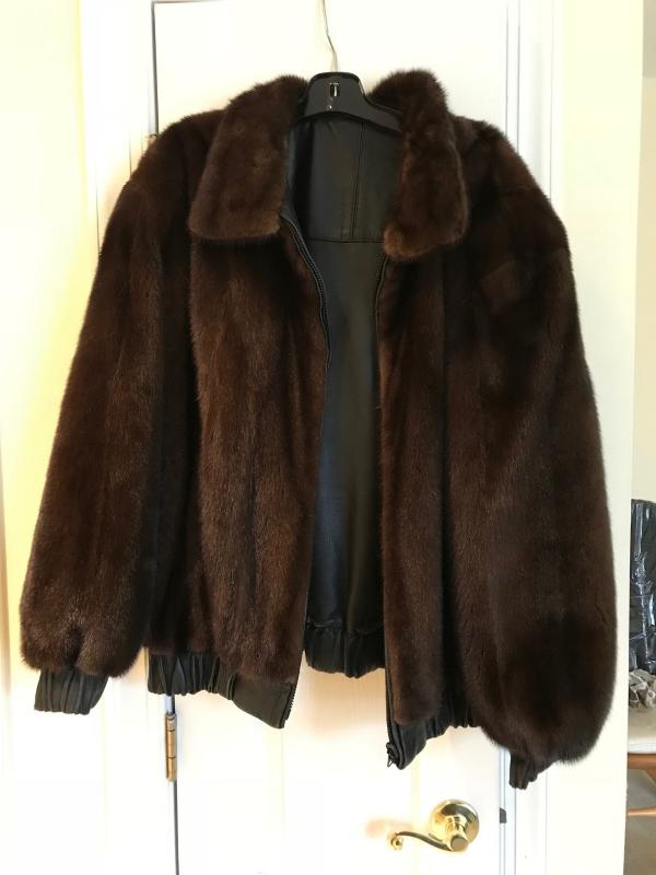 Heavy reversible bomber style jacket made by Rizik Bros. Washington. Done in deep brown leather which reverses to solid brown natural mink fur. Size XL. Brings out the teddy bear in any man!