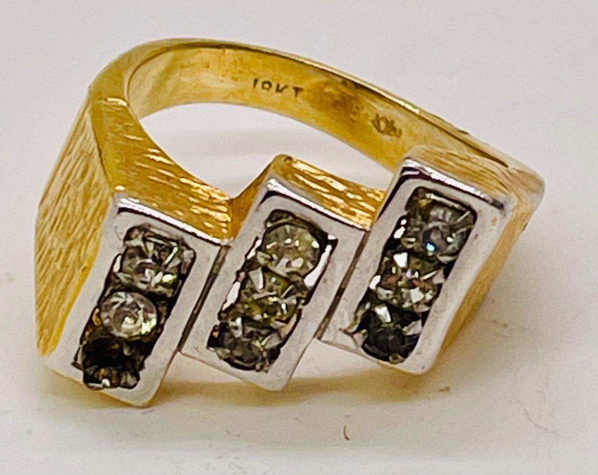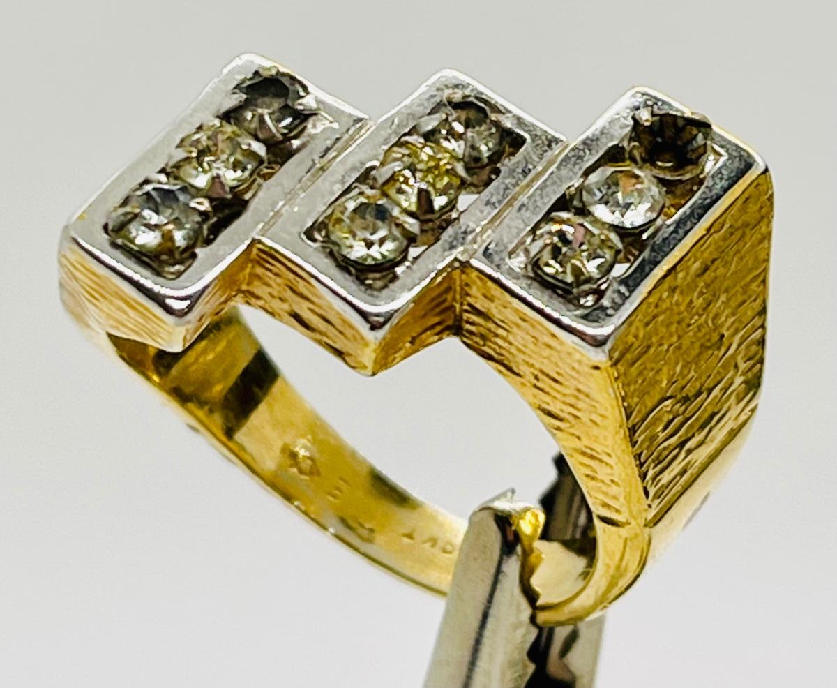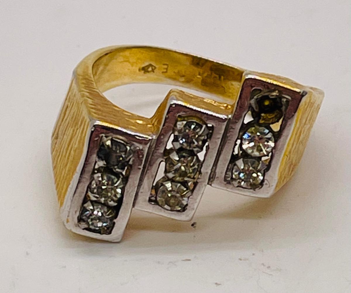 Marked 18K HGE, means Heavy Gold Electroplate, diamond-V makers mark symbol is for Vargas Manufacturing Company in Rhode Island, also known as Cradle Craft.unknown. Type of stone is unknown Good condition, except missing 2 stones.