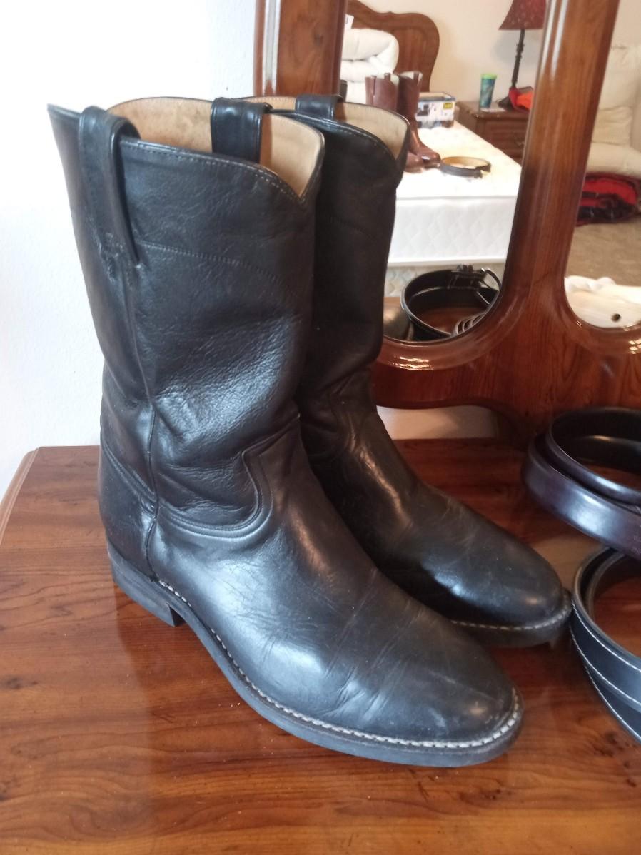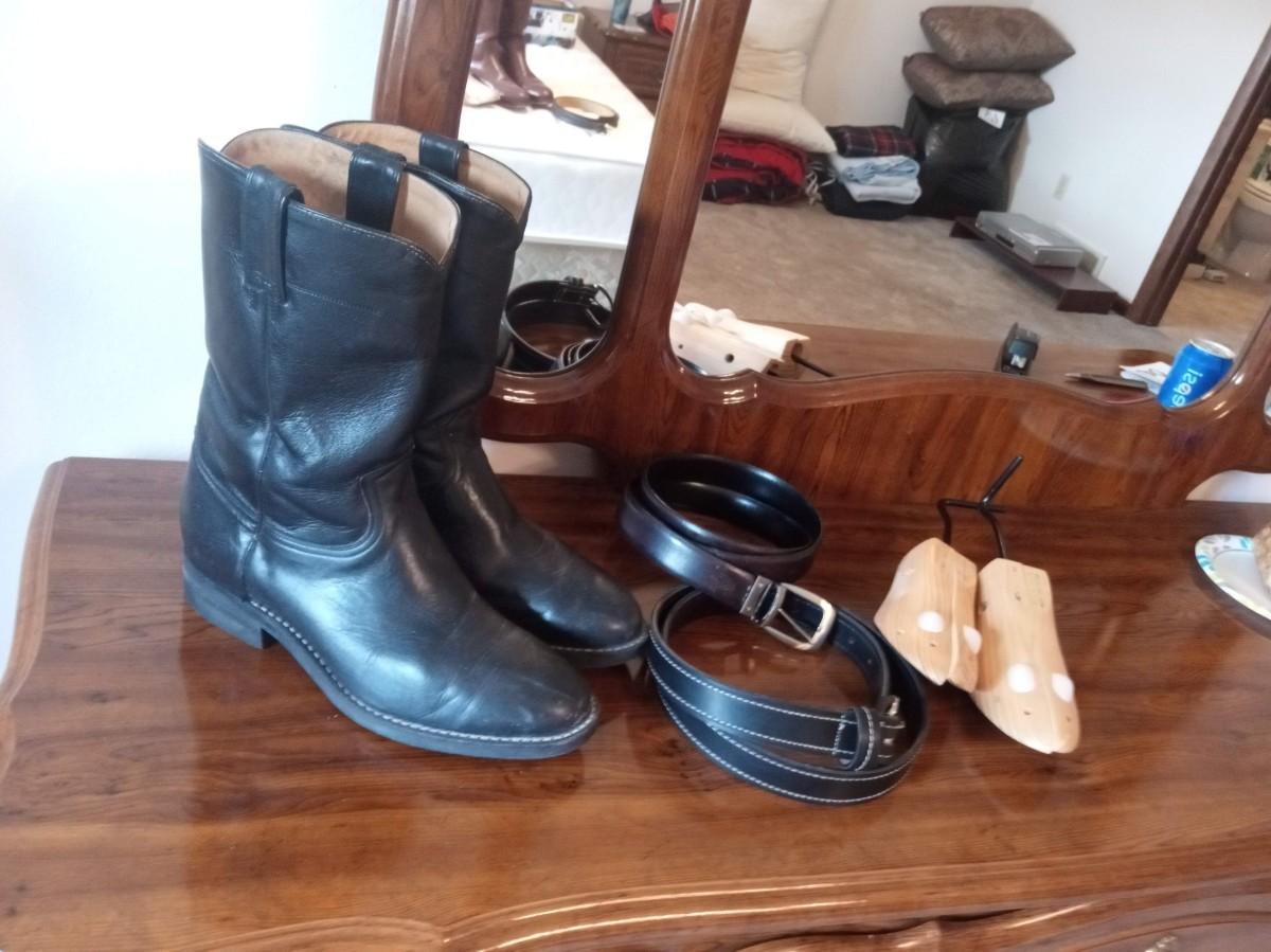 MEN'S RIO GRANDE BOOTS SIZE 29 1/2, TWO BELTS,