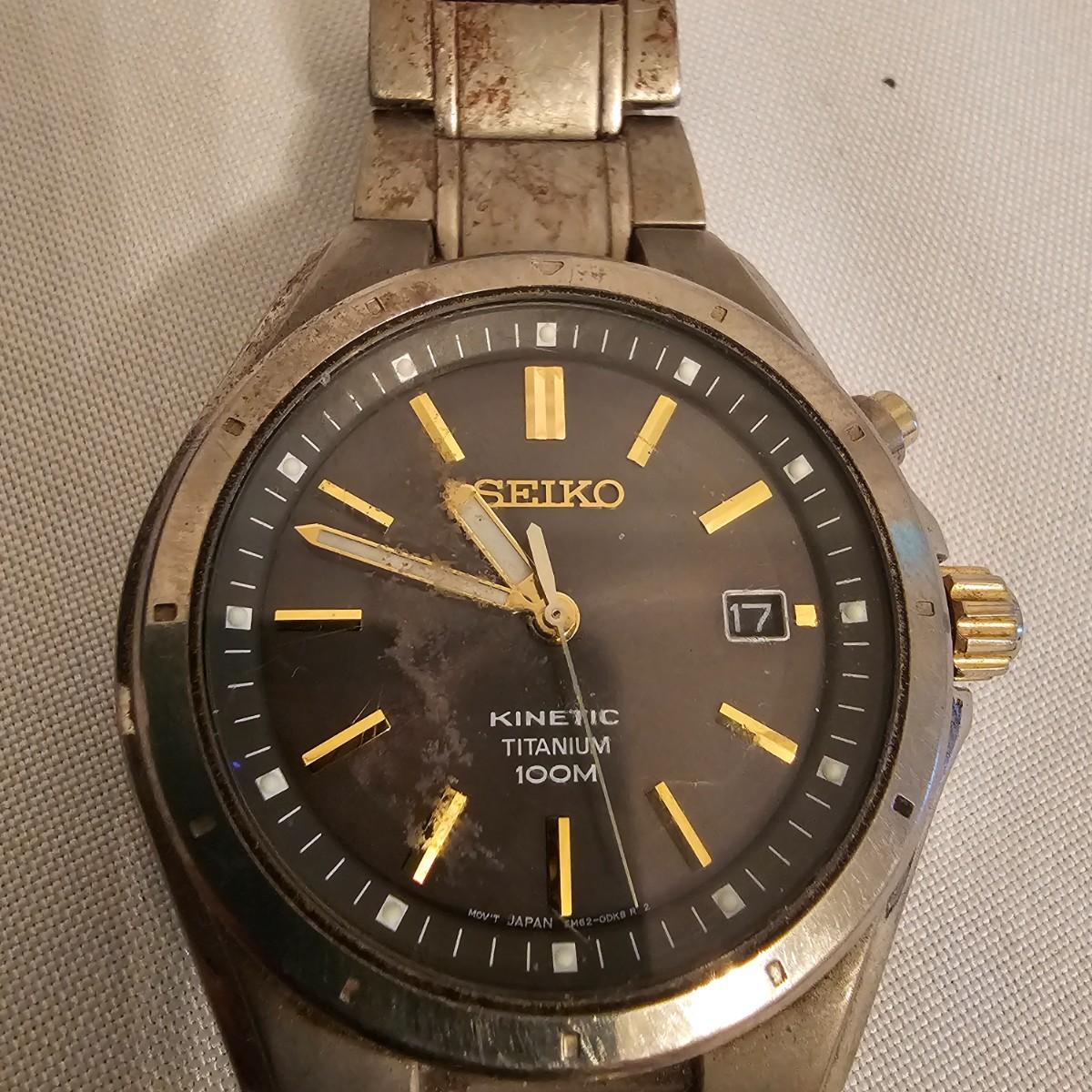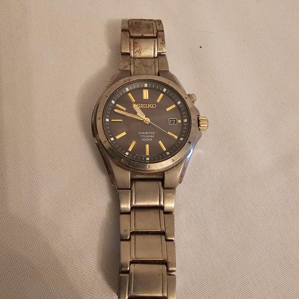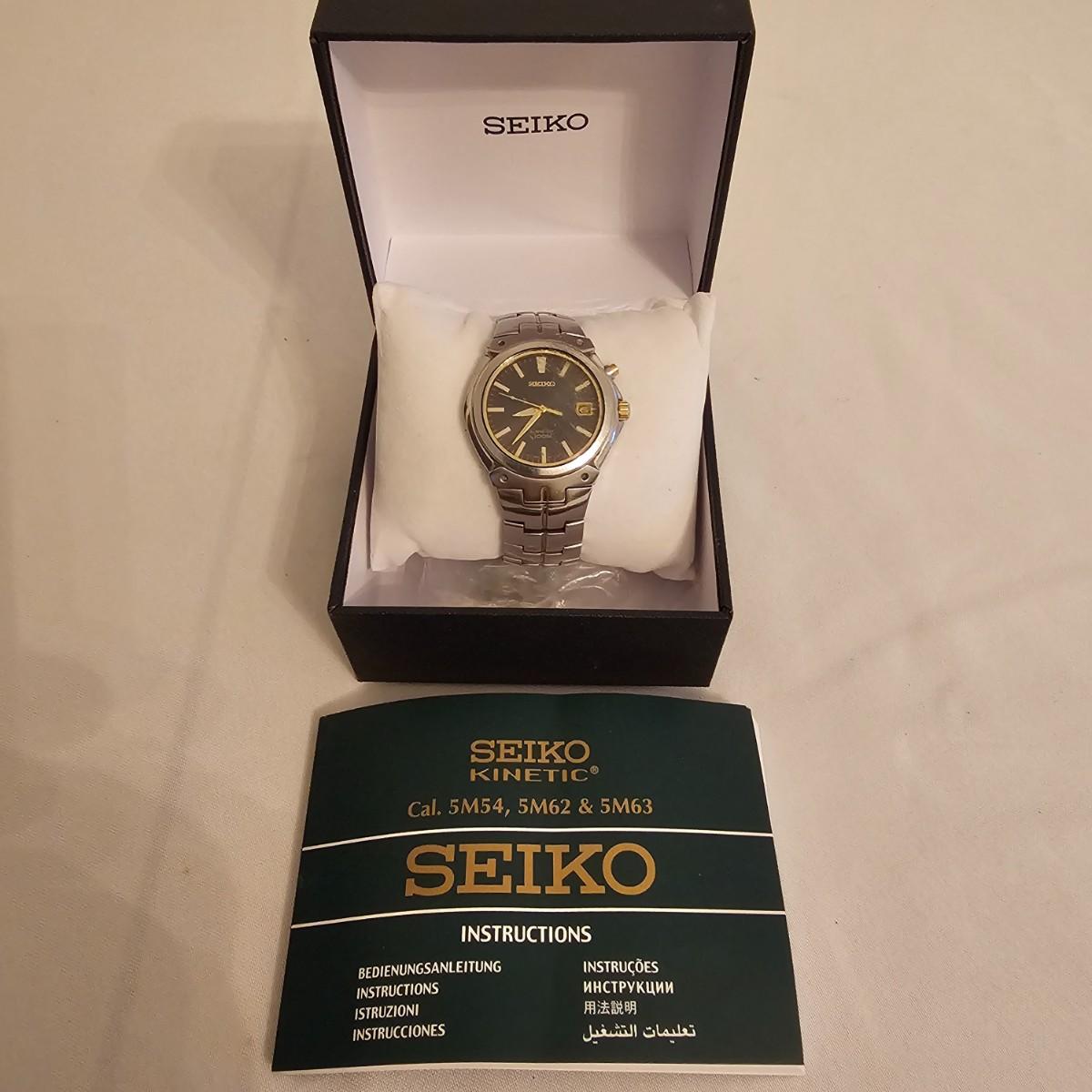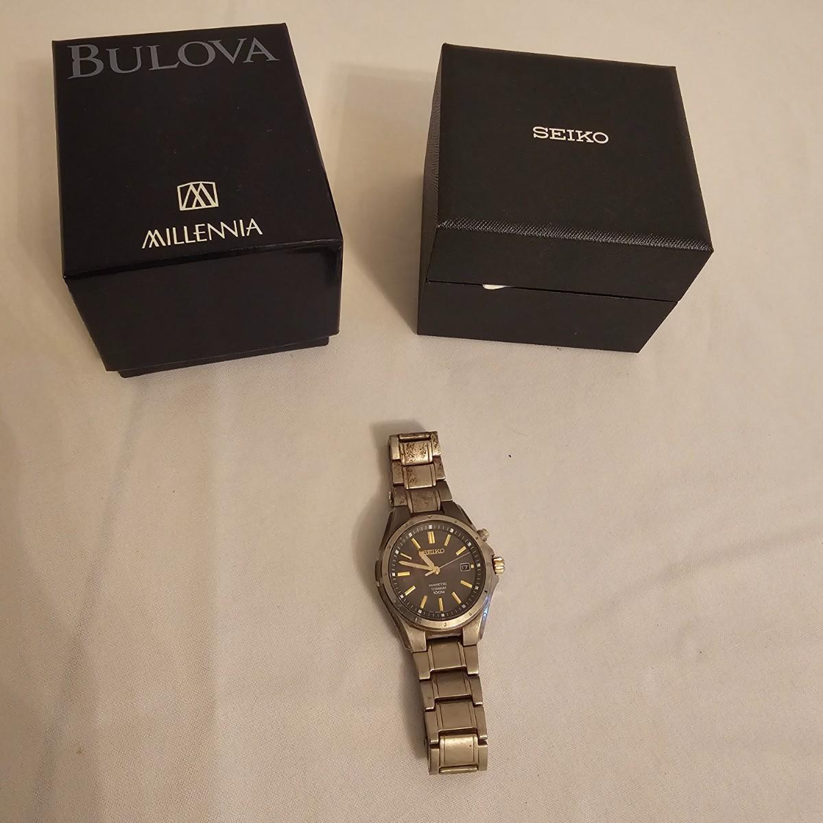 A trio of men's watches, two by Seiko and one by Bulova. One is a Seiko Kinetic Titanium. Band and crystal are in need of good cleaning. Sized for small wrist, no box. Second Seiko is a Kinetic also in box with manual. Band needs reattached and it has extra links. Crystal and case very scratched. Third watch is a Bulova Millenia with case. Has links for band which is currently detached on one end. The Seiko Kinetic appears to be ticking, but we cannot verify it's working condition. It is unknown if either of the other two watches would be in working order if serviced. See photos for details. Shipping available. All sales are final. No returns or refunds. Please bid accordingly.