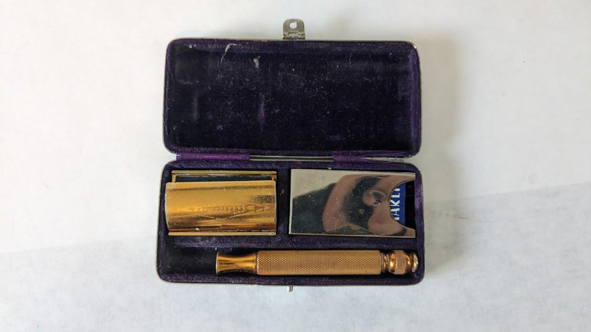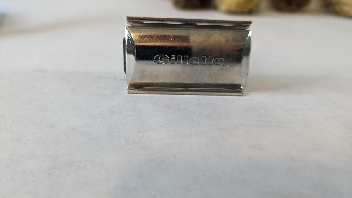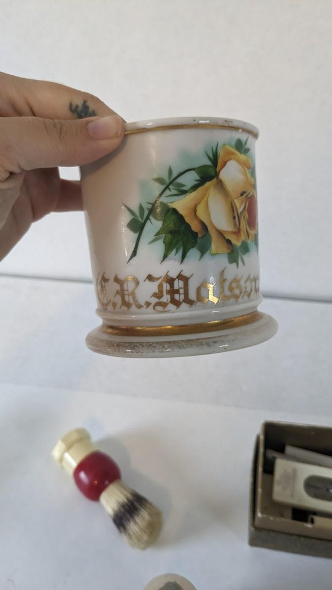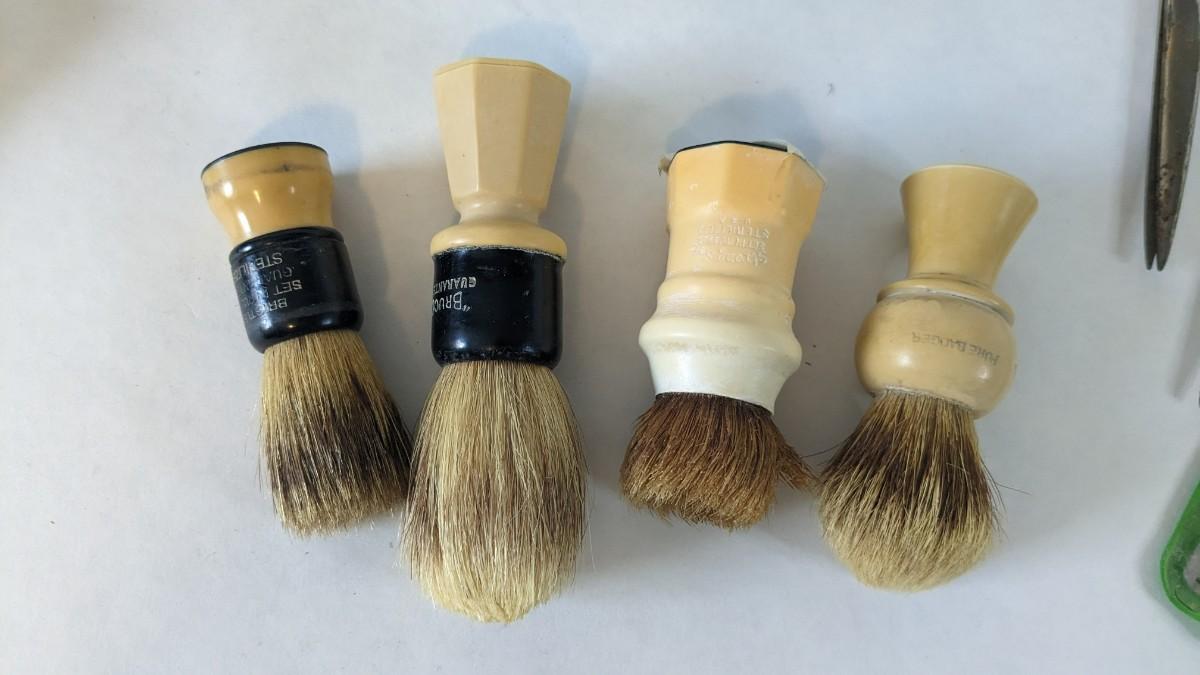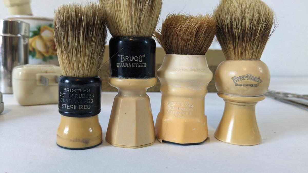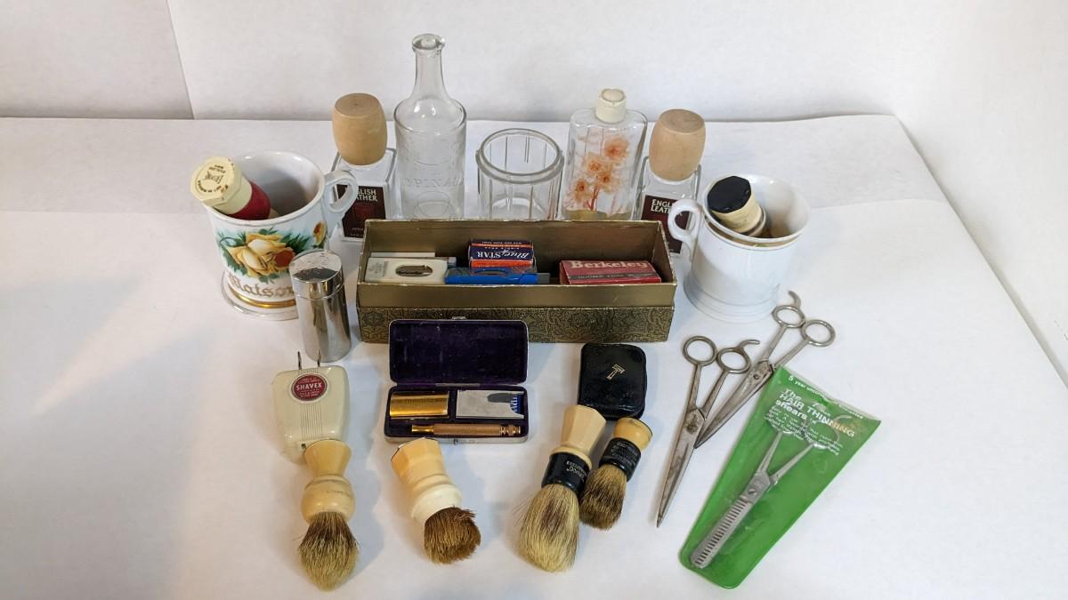 Includes monogrammed shaving mug and Czech made mug both with bars in base, five glass barber/aftershave bottles earliest is marked Ed. Pinade Paris and shows chips at opening as noted in photos, also includes very clever Flower in a Bottle rose cologne which is neat for display, six bristle brushes in varying stages of wear but in overwhelmingly good condition for age, early williams shaving stick case, two travelling Gillette razors, brass razor is in original carrying case with original blades in blade saver, also includes small box of various brand blades