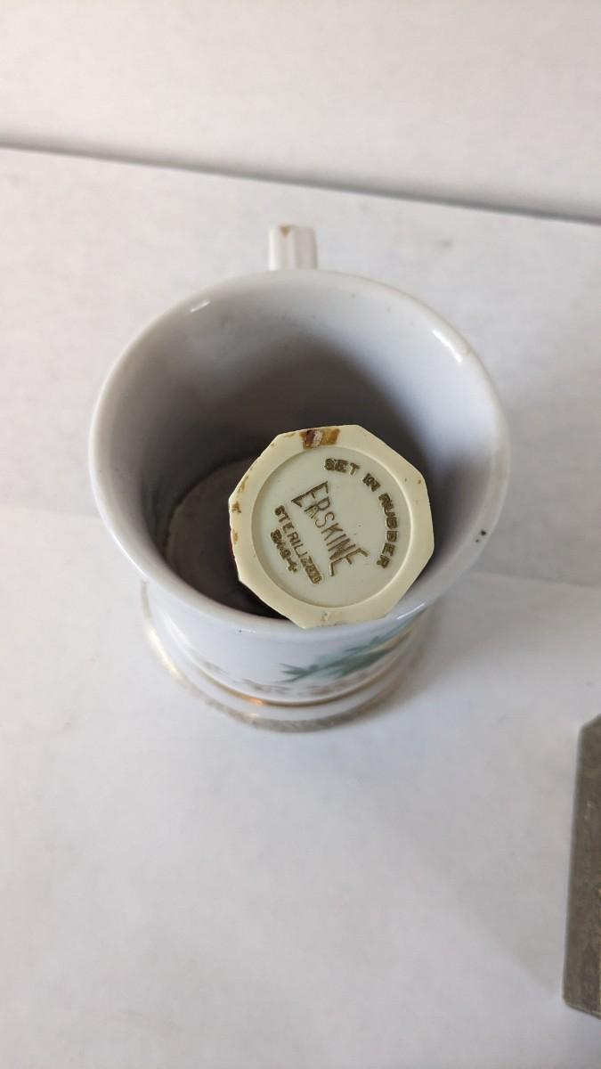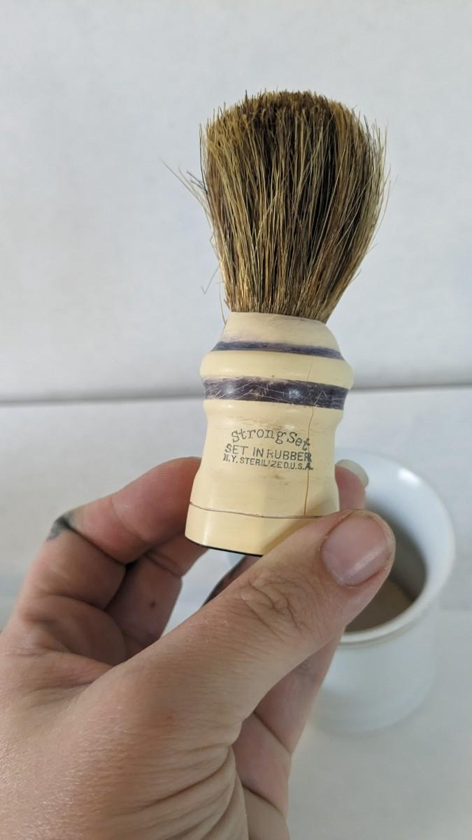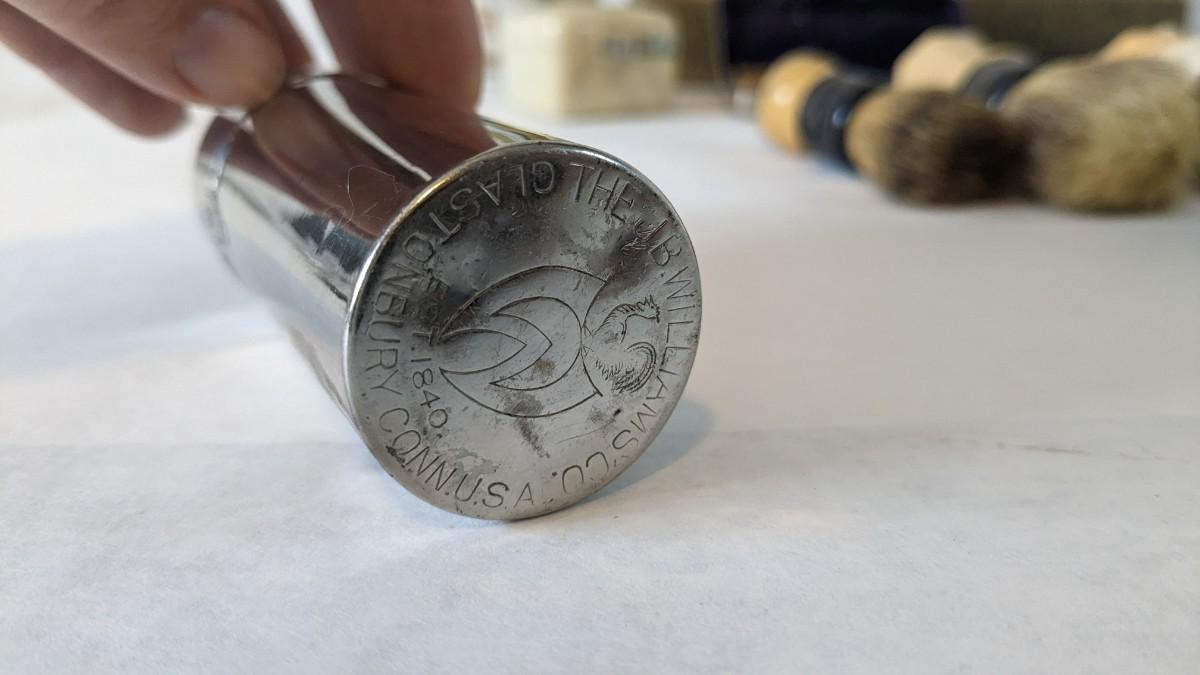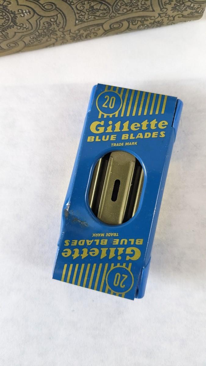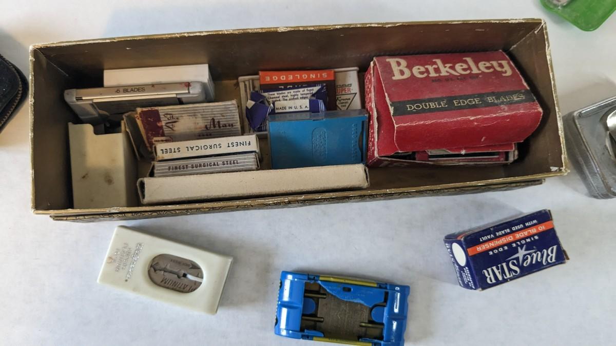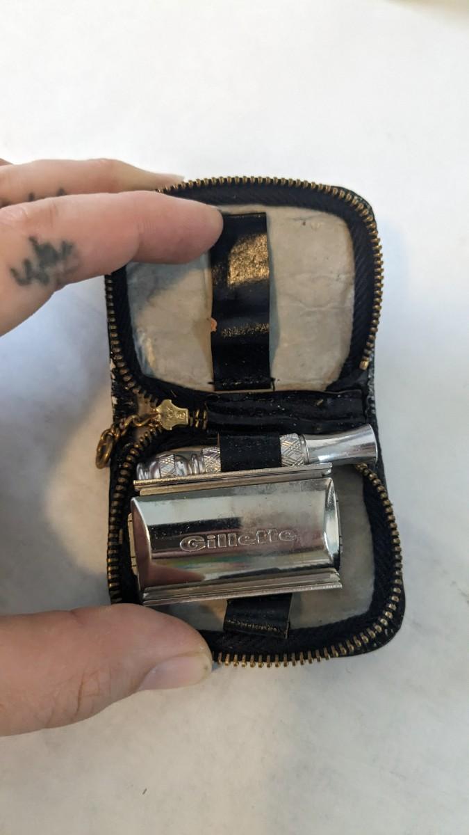 Includes monogrammed shaving mug and Czech made mug both with bars in base, five glass barber/aftershave bottles earliest is marked Ed. Pinade Paris and shows chips at opening as noted in photos, also includes very clever Flower in a Bottle rose cologne which is neat for display, six bristle brushes in varying stages of wear but in overwhelmingly good condition for age, early williams shaving stick case, two travelling Gillette razors, brass razor is in original carrying case with original blades in blade saver, also includes small box of various brand blades
