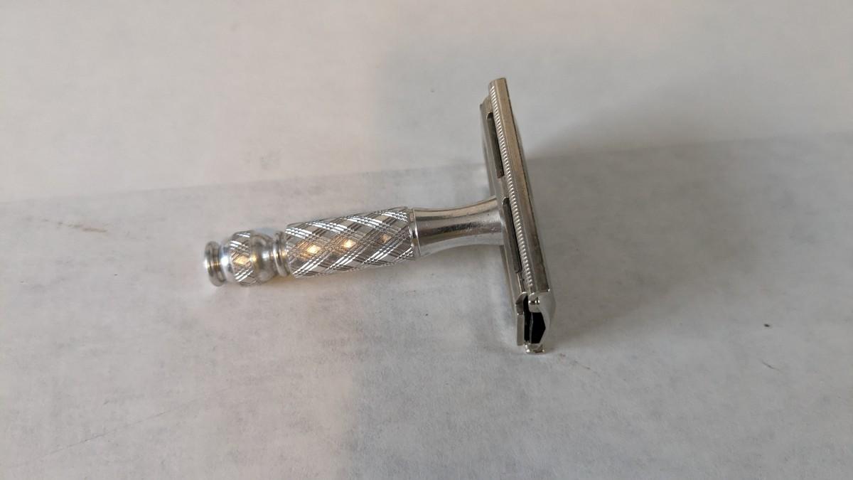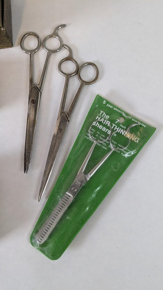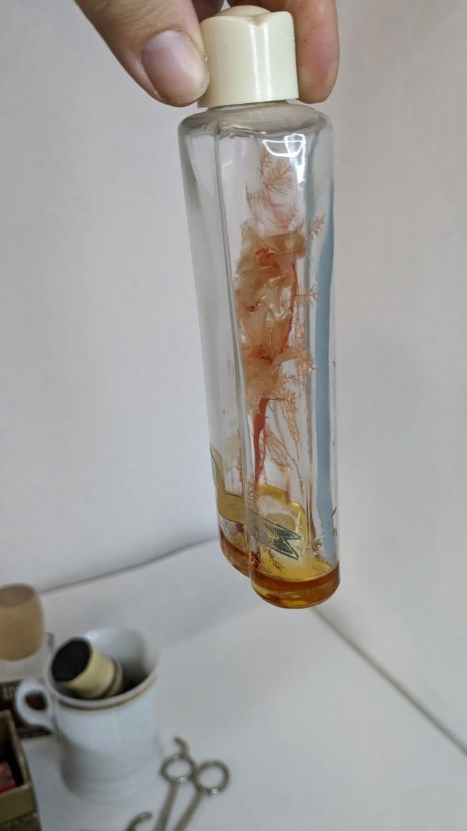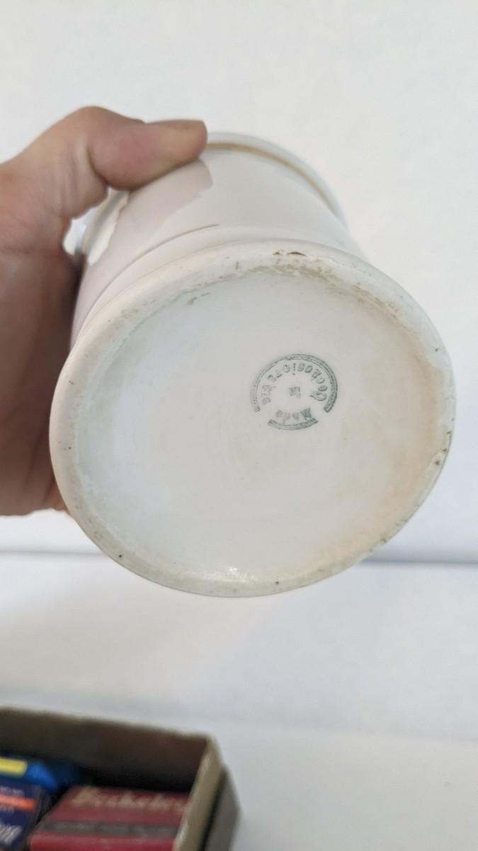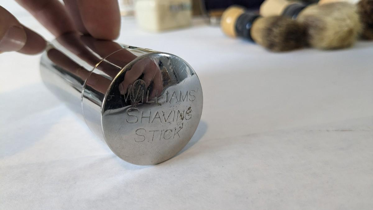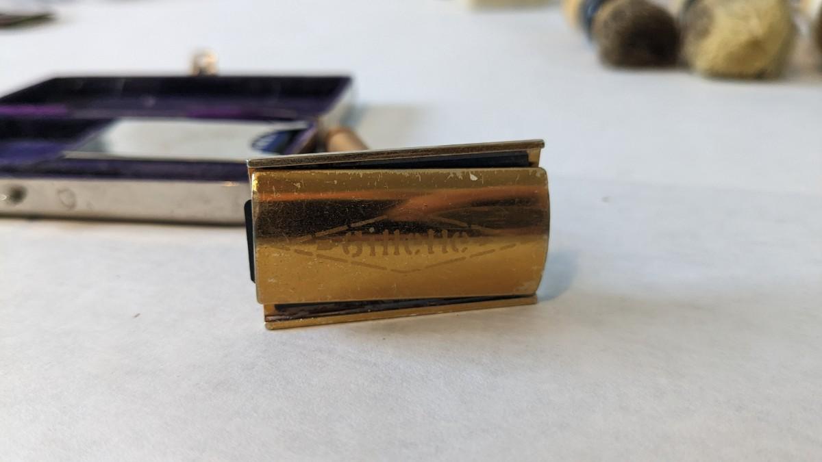Includes monogrammed shaving mug and Czech made mug both with bars in base, five glass barber/aftershave bottles earliest is marked Ed. Pinade Paris and shows chips at opening as noted in photos, also includes very clever Flower in a Bottle rose cologne which is neat for display, six bristle brushes in varying stages of wear but in overwhelmingly good condition for age, early williams shaving stick case, two travelling Gillette razors, brass razor is in original carrying case with original blades in blade saver, also includes small box of various brand blades