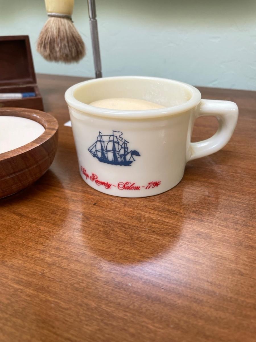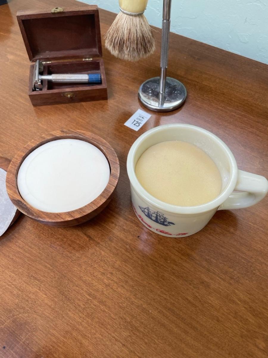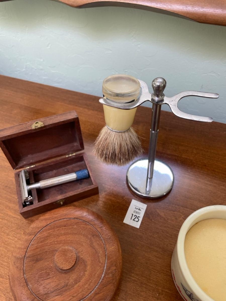 Holder for brush and razor (takes traditional razor blades). Travel box for razor. 2 new shaving soaps.