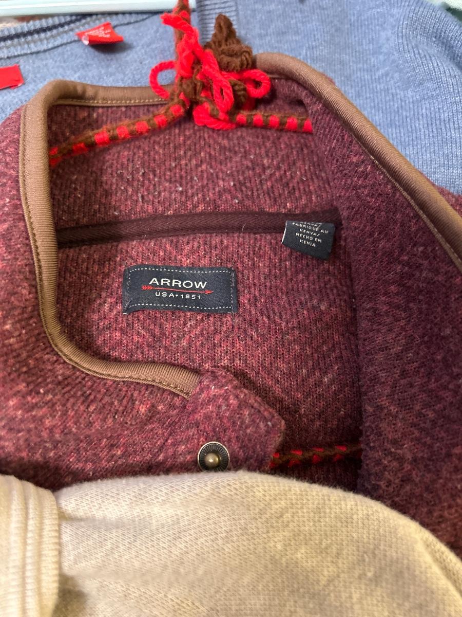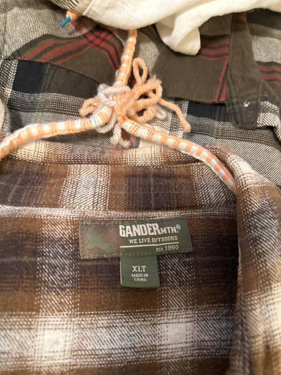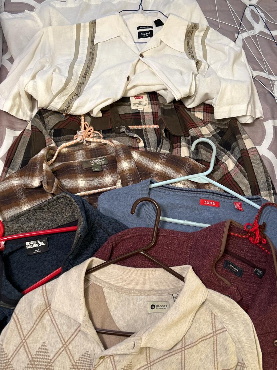 Haggar, Eddie Bauer, Izod, Levi’s, Gander Mountain and arrow. Size range from large to XXL.