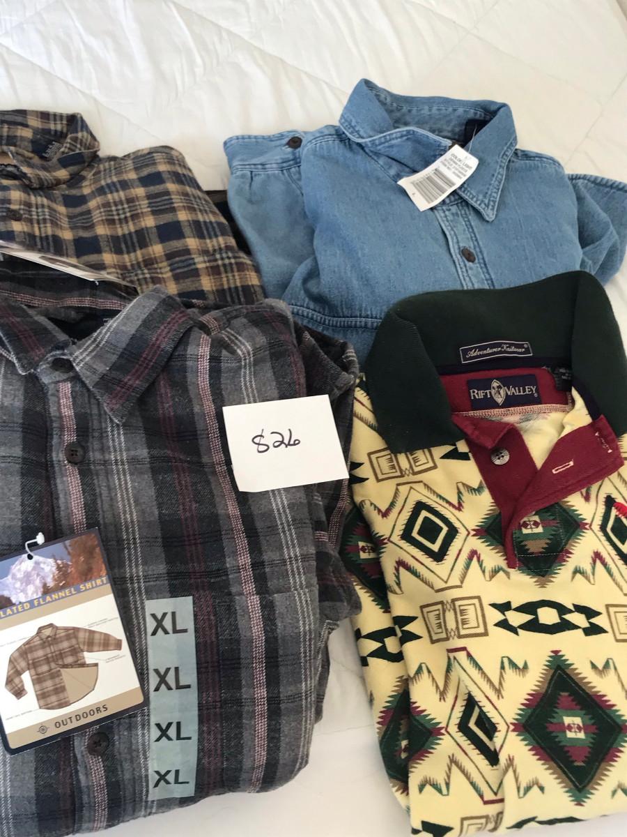 On clothing: New, some with tags! Please see photos for quantity, colors, size, and condition. Please, also most items are Large or XL in women's clothing.
