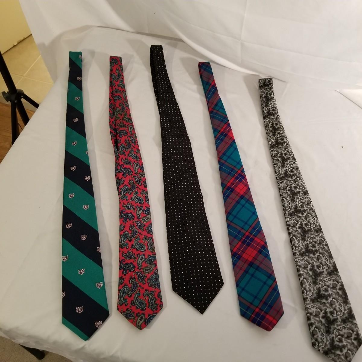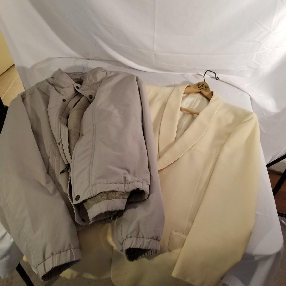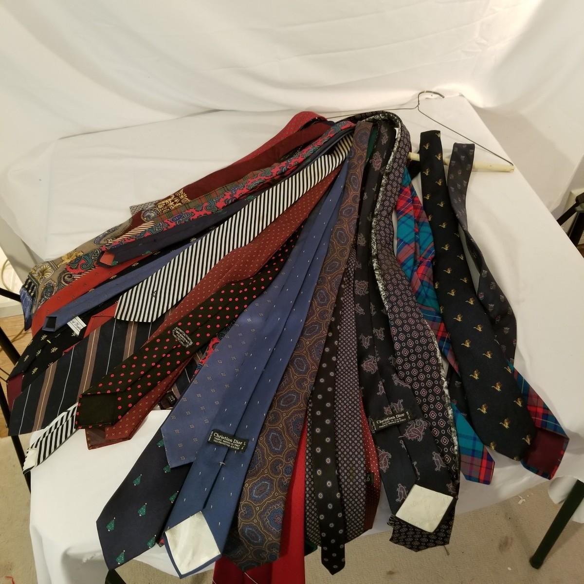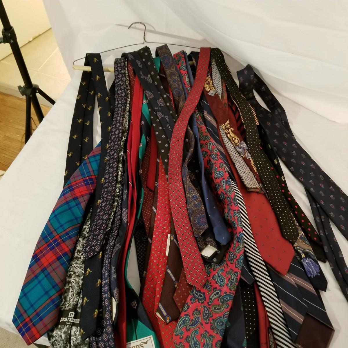 A collection of men's clothing items. Three shirts, two jackets, three pairs of tasseled shoes, thirty dress ties.  Sizes X-large. The shoes are size 10.5. Men's sport coat has some discoloring, see photos. Local Pickup Only.